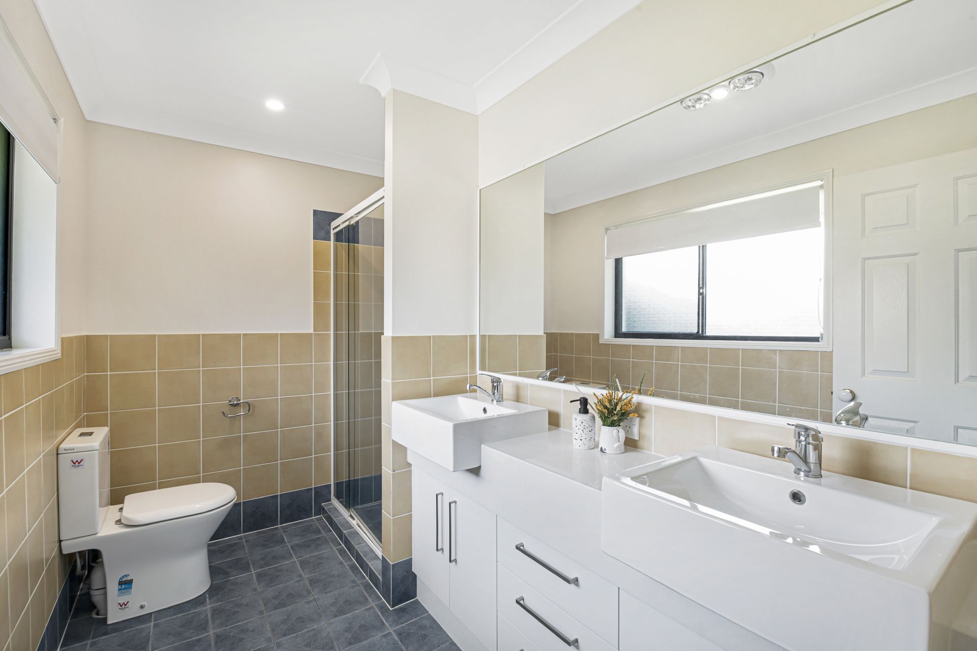 - Bathroom two is the ensuite to the master bedroom and features tiled flooring, over-sized shower, modern his & hers double vanity with stone benchtop and soft-close cabinetry, and toilet.