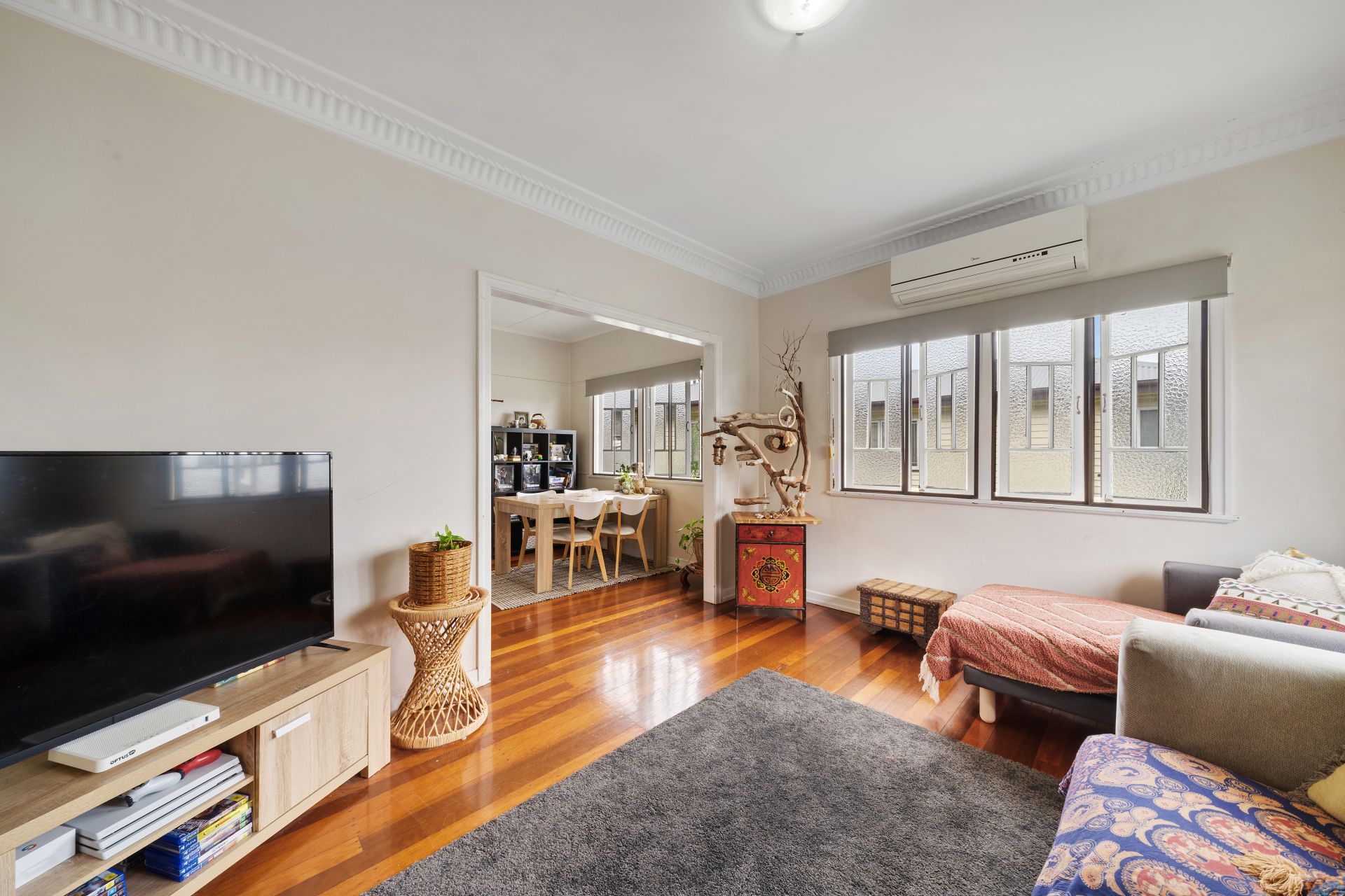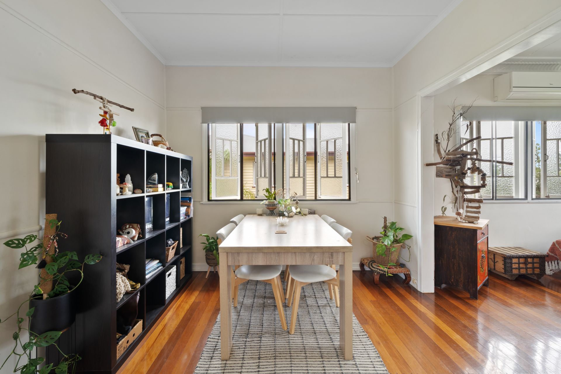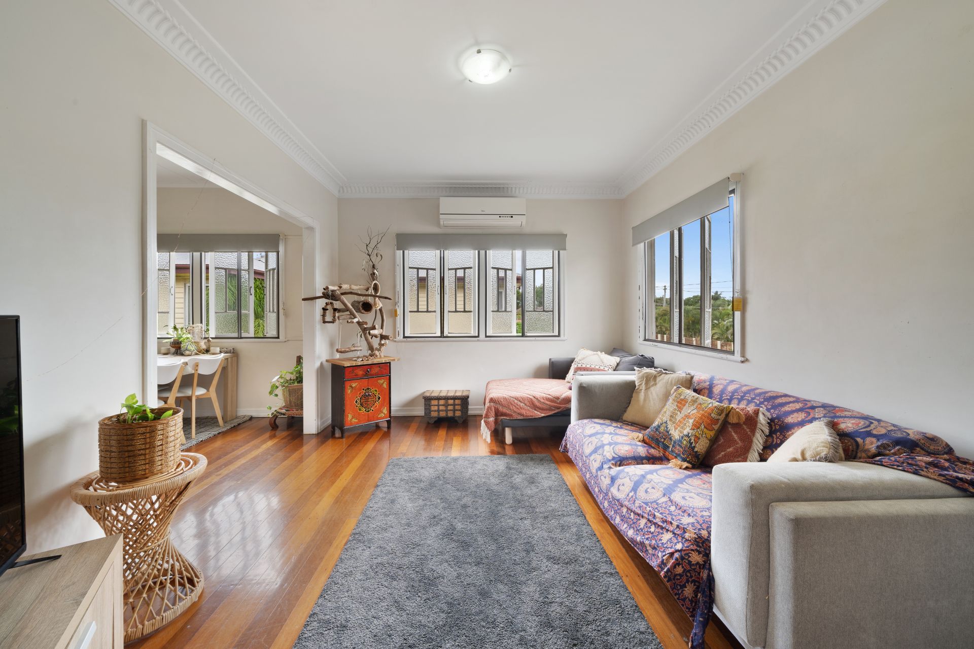 > The lounge/dining areas flow effortlessly to the kitchen and out to the yard. Featuring extra-high ceilings with ornate cornicing, rich wood flooring, split-system air-conditioning, casement windows with roller blinds and oyster lighting throughout.
