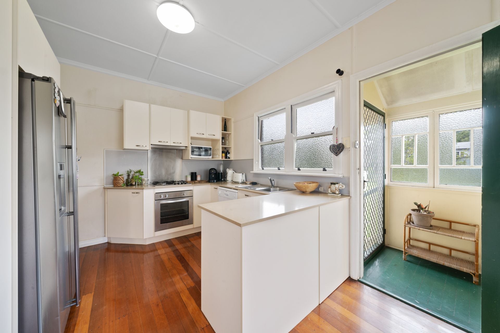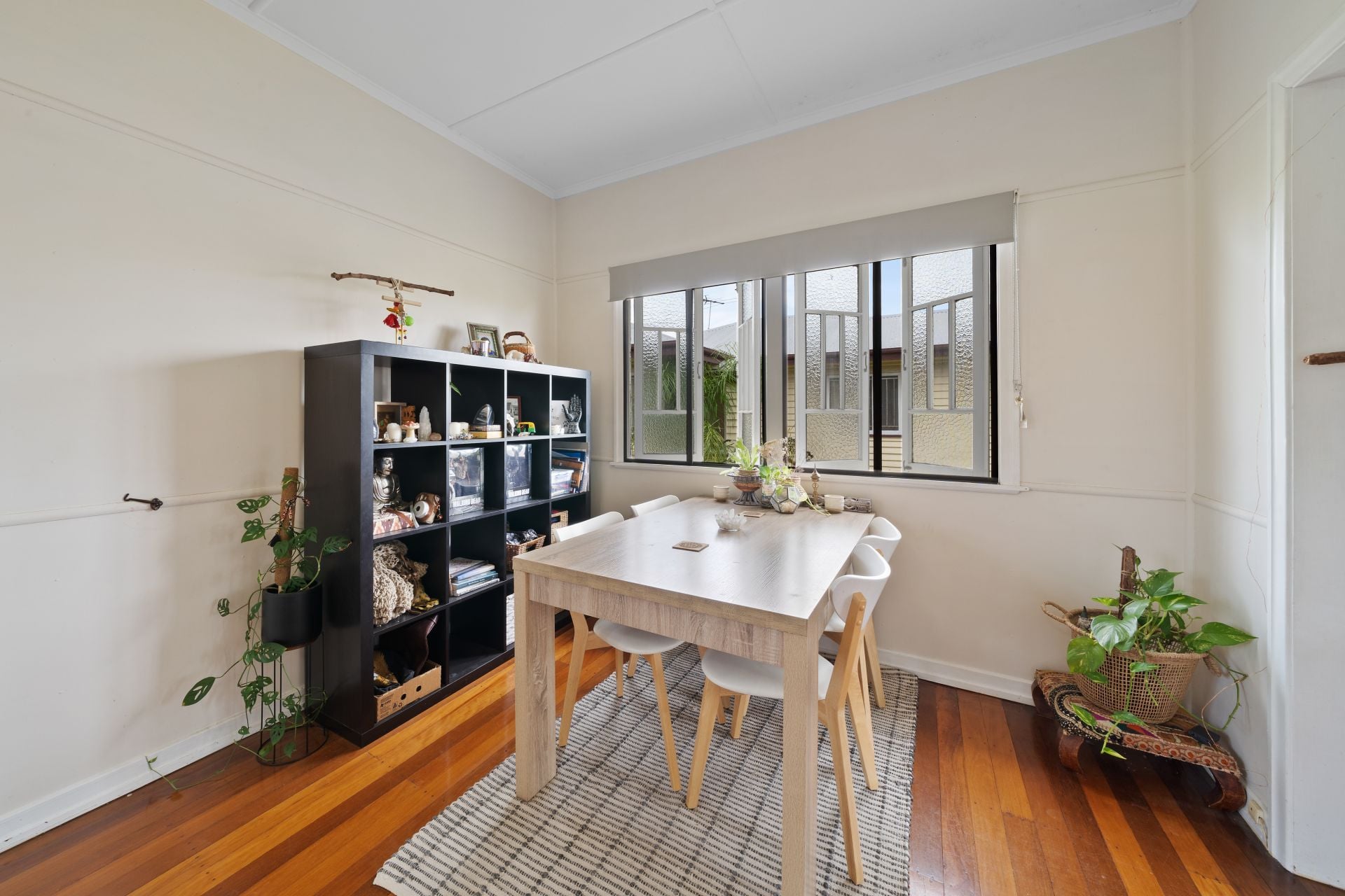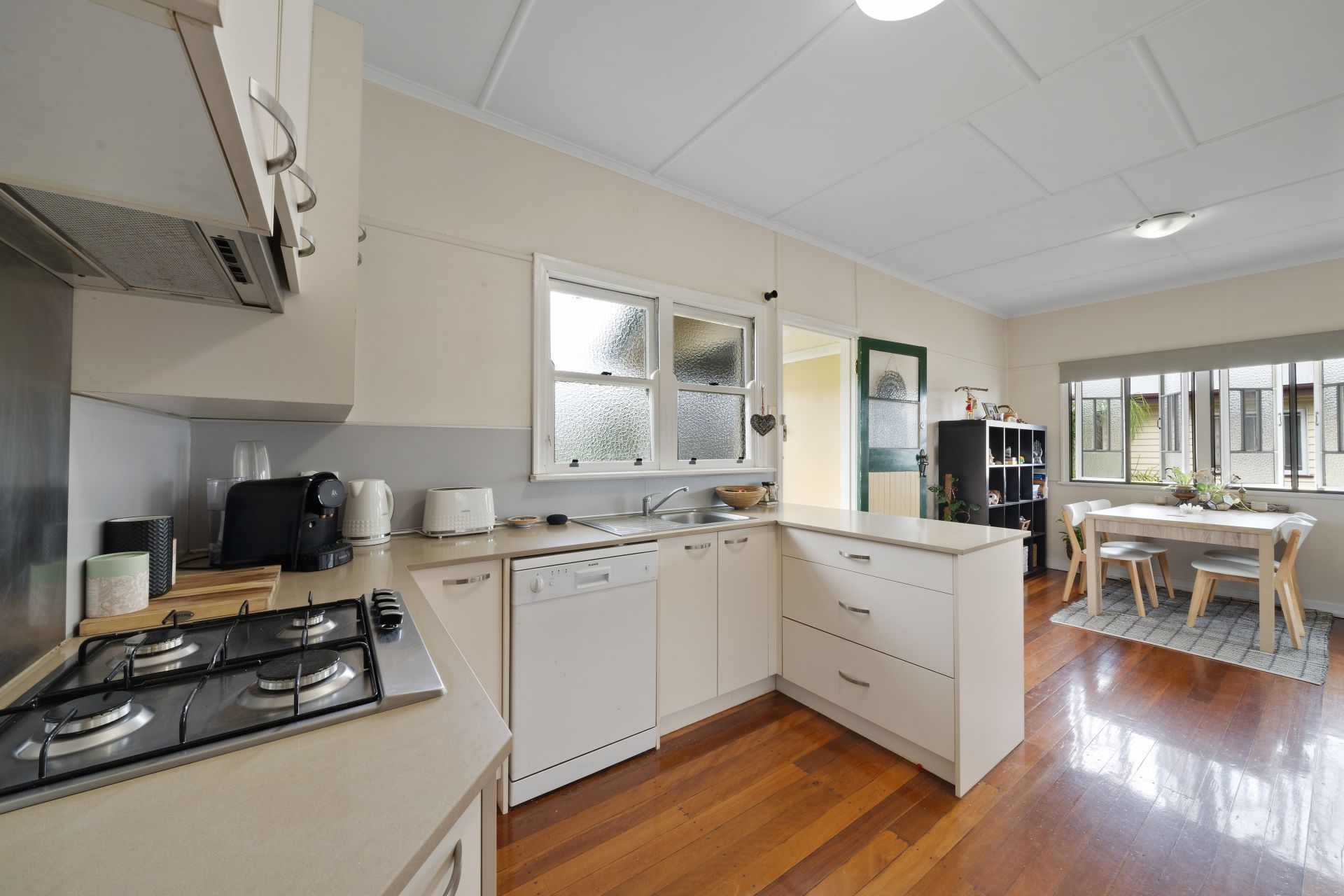 > The lounge/dining areas flow effortlessly to the kitchen and out to the yard. Featuring extra-high ceilings with ornate cornicing, rich wood flooring, split-system air-conditioning, casement windows with roller blinds and oyster lighting throughout.