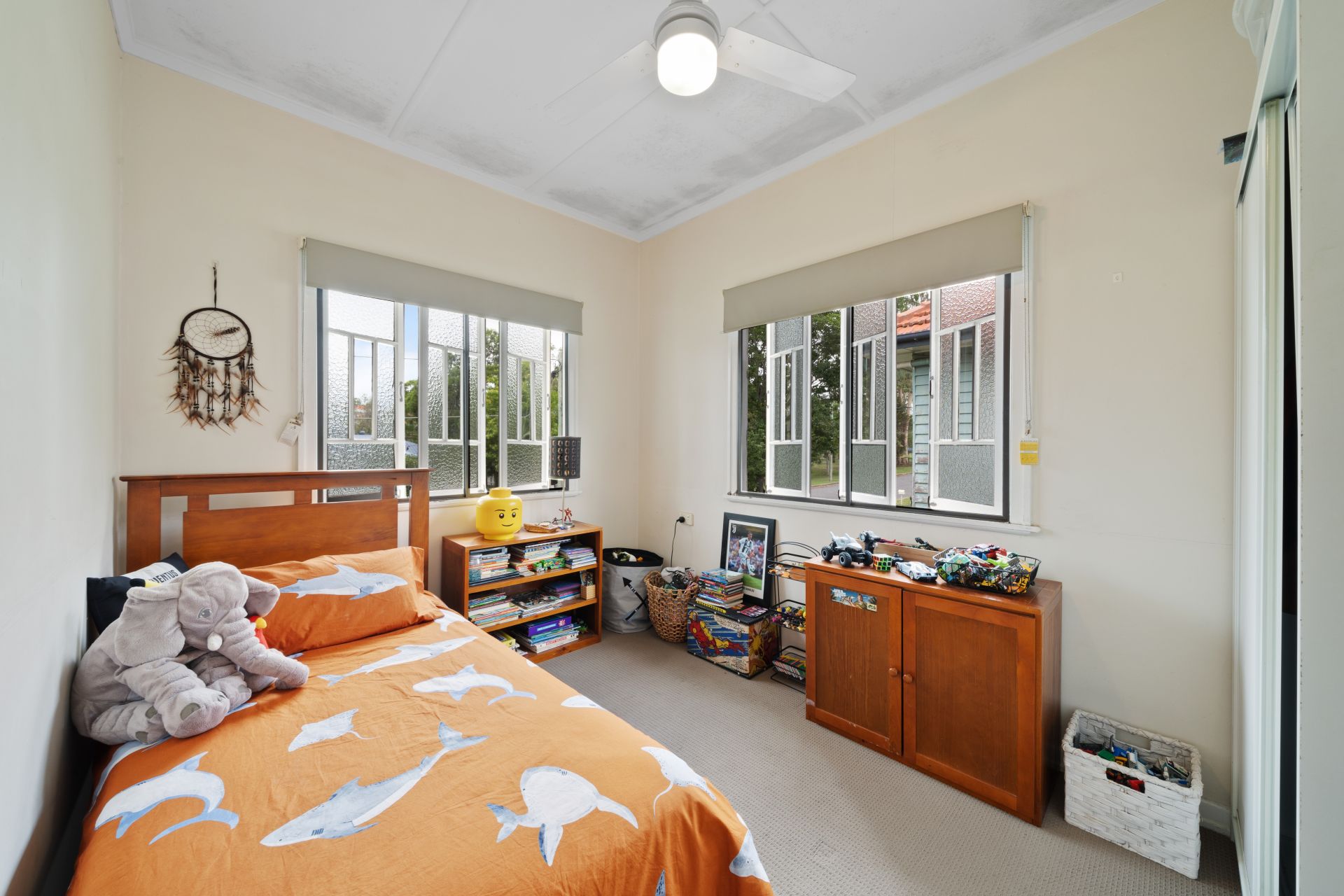 > Bedrooms 2 & 3 feature extra-high ceilings, ornate cornicing, ceiling fan with lighting, carpet flooring and casement windows with roller blinds.