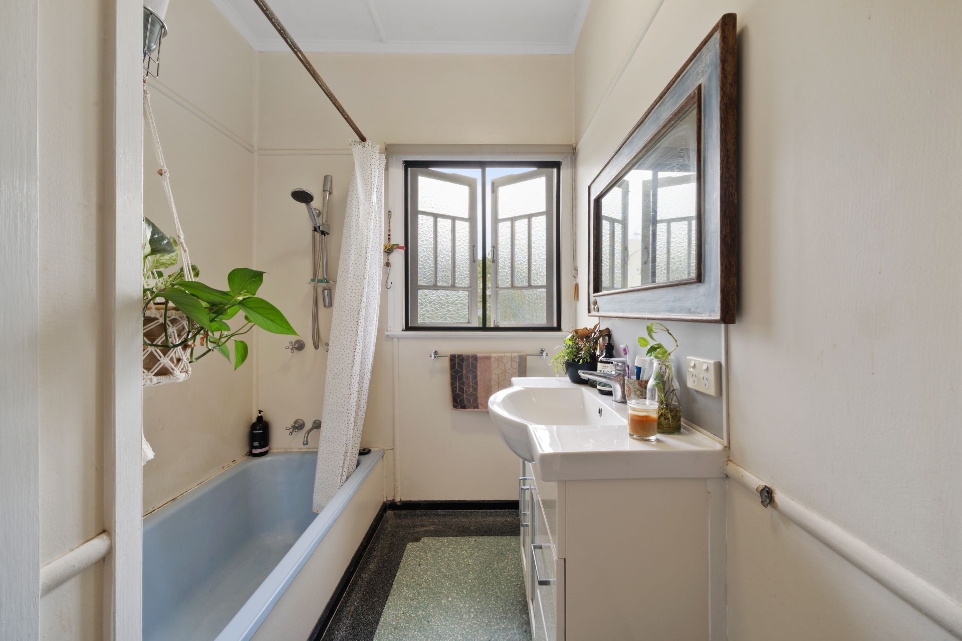 > The main bathroom features a shower over bath configuration with detachable shower head, terrazzo flooring, single basin vanity with plenty of storage, framed vanity mirror, towel rack, light, exhaust, casement windows and separate toilet.