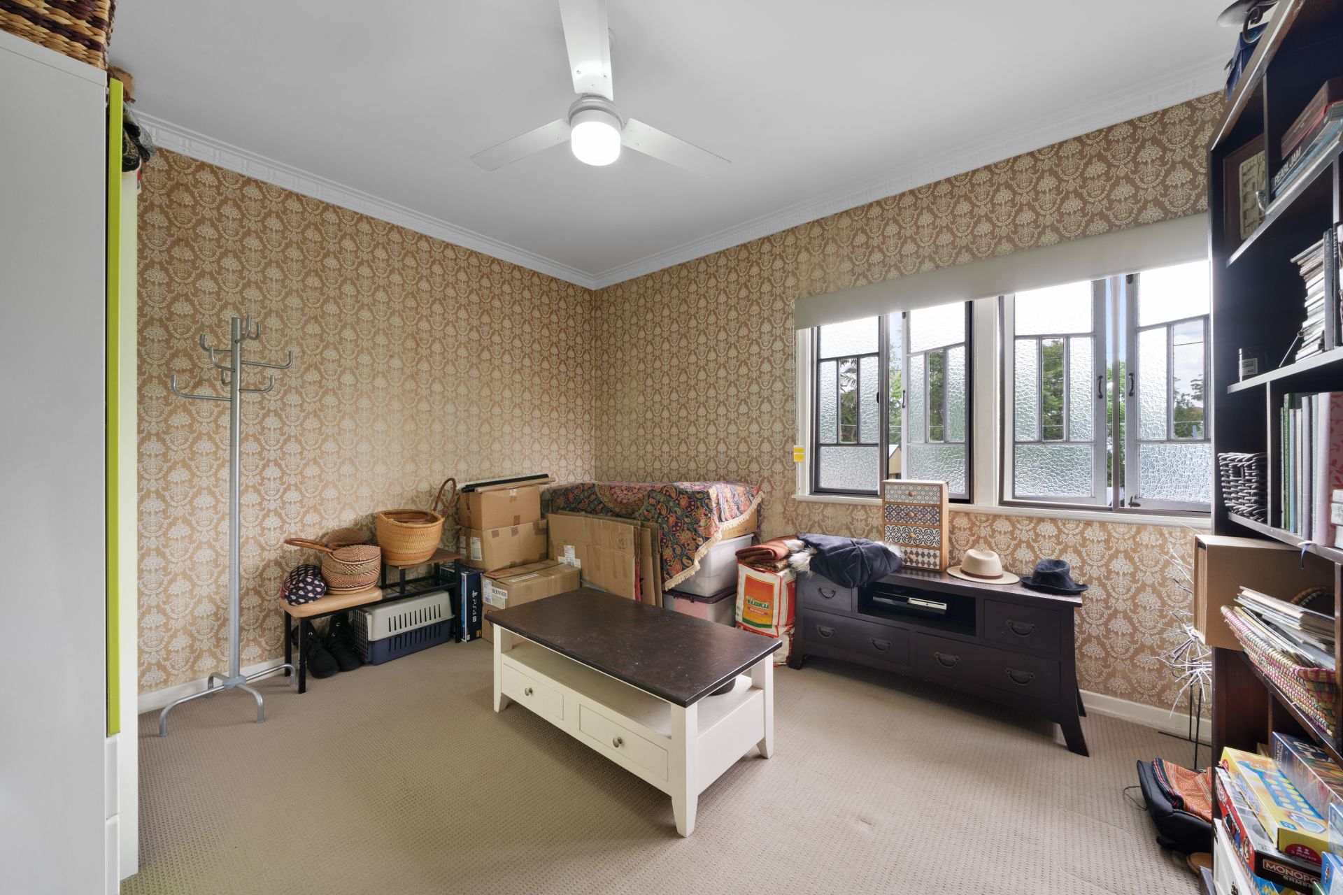 > The master bedroom, perfect for those who enjoy their own space. Boasting extra-high ceilings, ornate cornicing, ceiling fan with lighting, carpet flooring and casement windows with roller blinds.