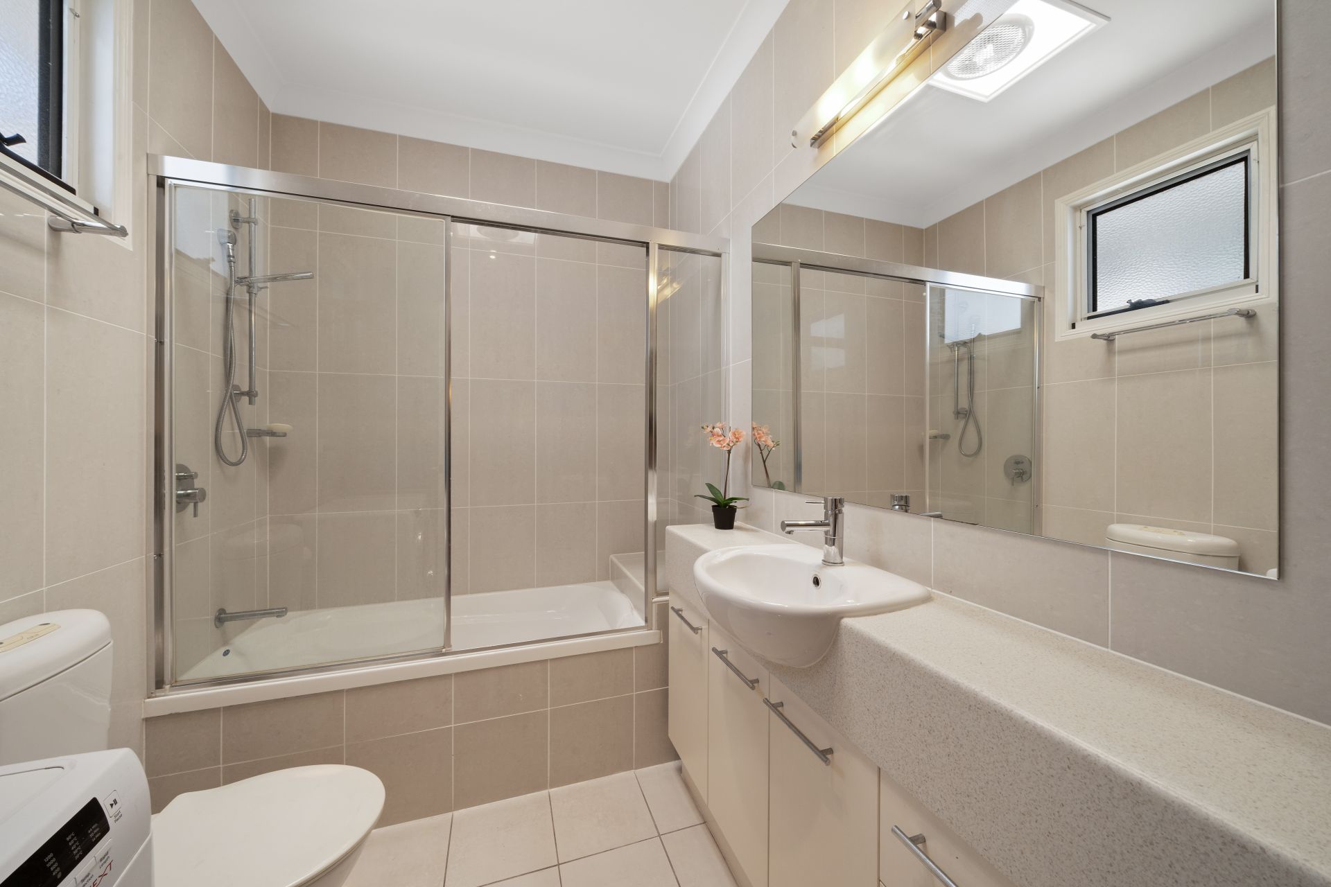 > The European main bathroom features floor-to-ceiling tiles, single basin vanity with plenty of storage, large frameless vanity mirror, towel rails, hand towel rack, shower-over bath configuration with detachable showerhead with toilet, skylight, extractor/lighting and accommodation for washing machine + dryer.