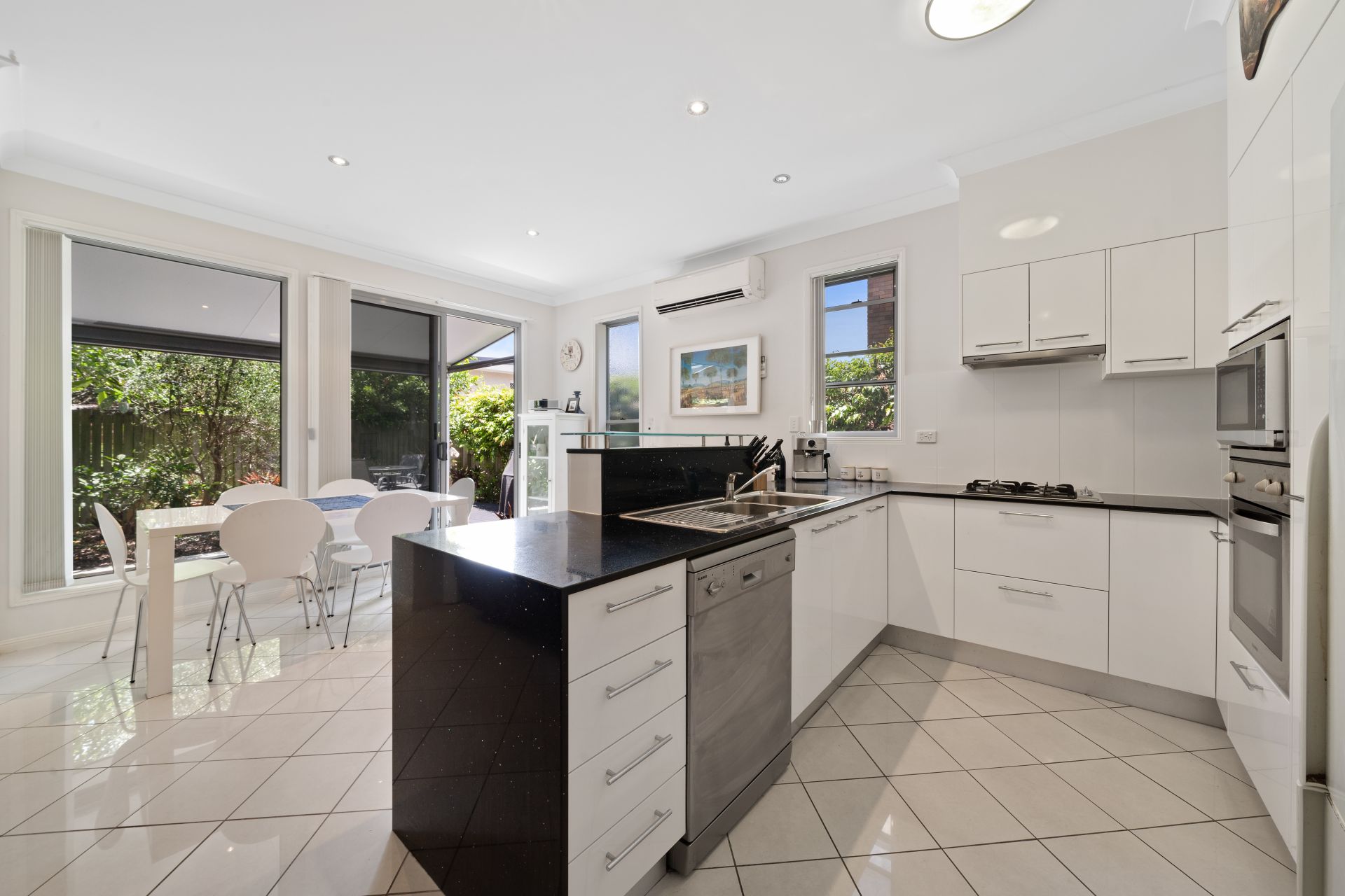 > The combined lounge/dining area, located at the heart of the home boasts extra-high ceilings, tiled flooring, down-lighting, large glass sliding doors, sash windows, vertical blinds, security screens and access to the large split level semi covered outdoor entertaining area via the dual glass sliding door offering a seamless flow of living space.