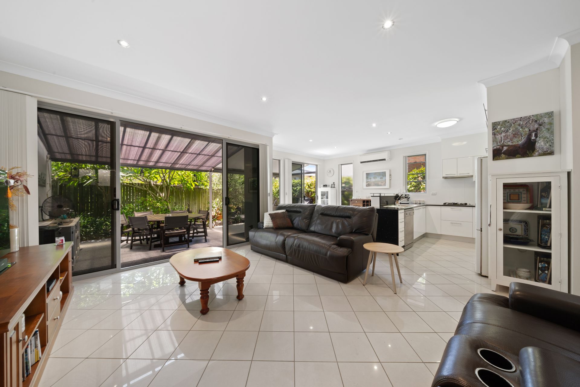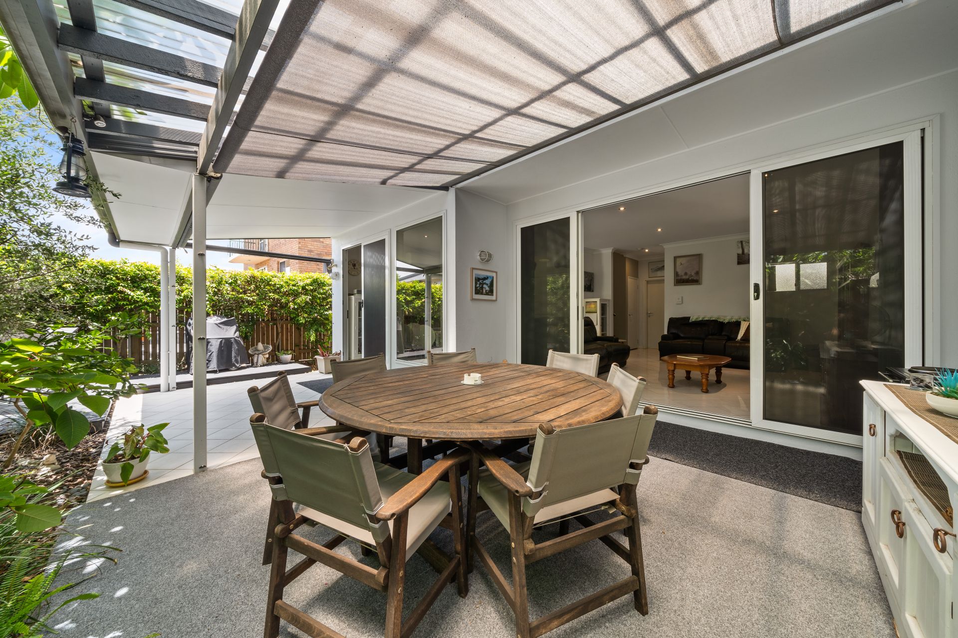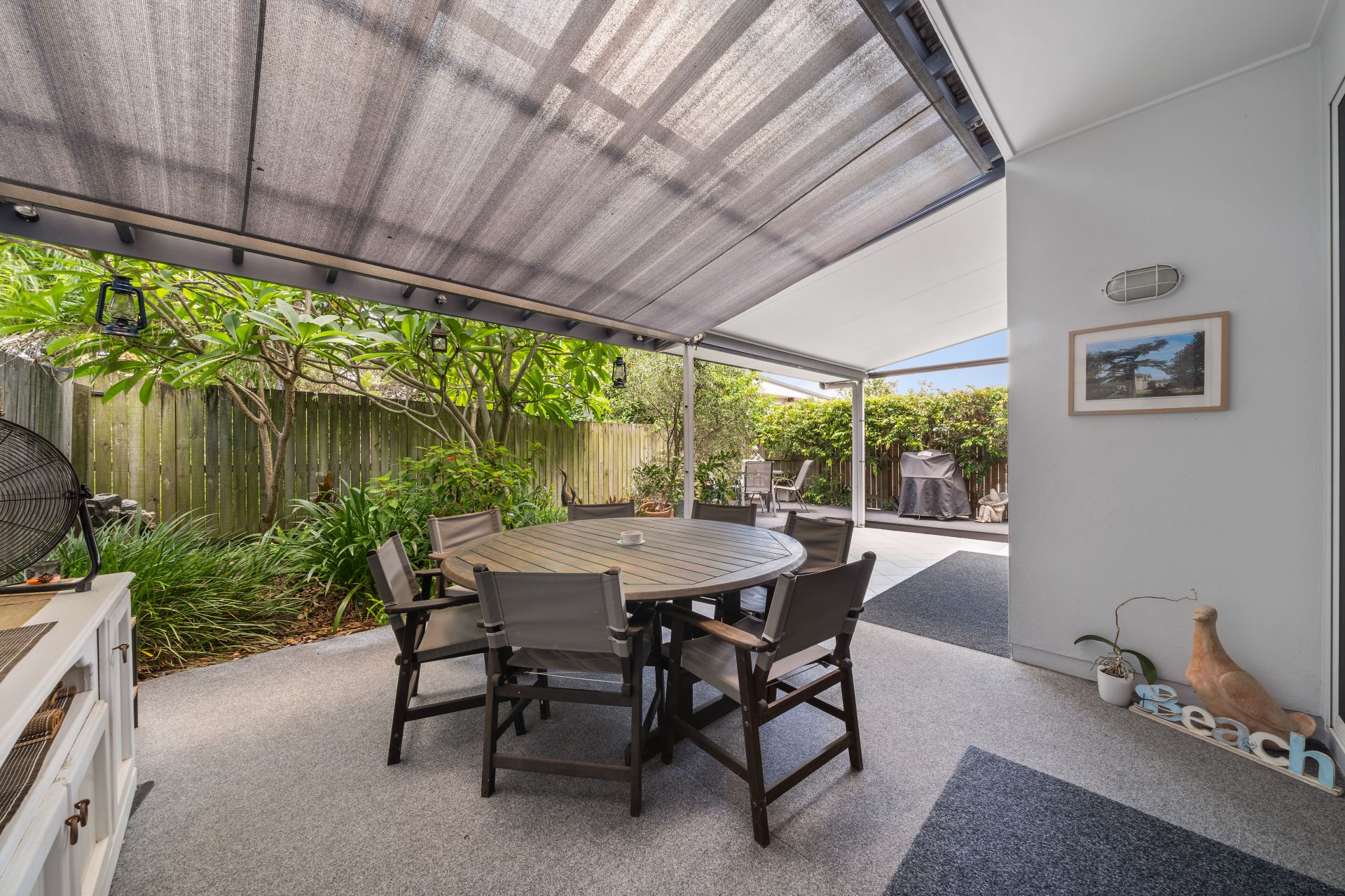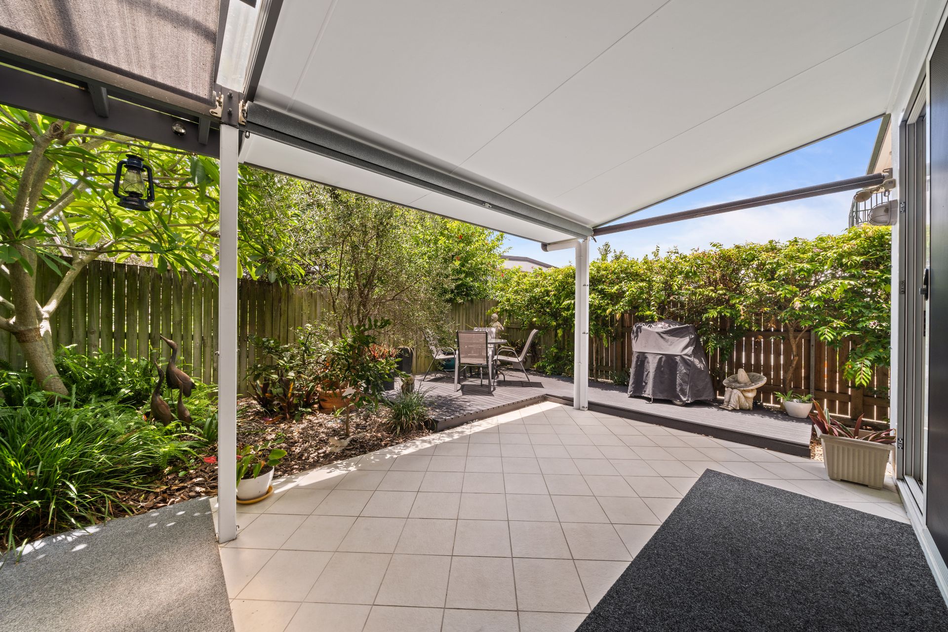 > The covered outdoor entertaining area encapsulates everything there is to love about our Queensland lifestyle boasting split level semi covered courtyard featuring a combination of tiles + decking, outdoor power points, outdoor lighting and roller shade blinds, making it the perfect space to relax and unwind with family and friends.