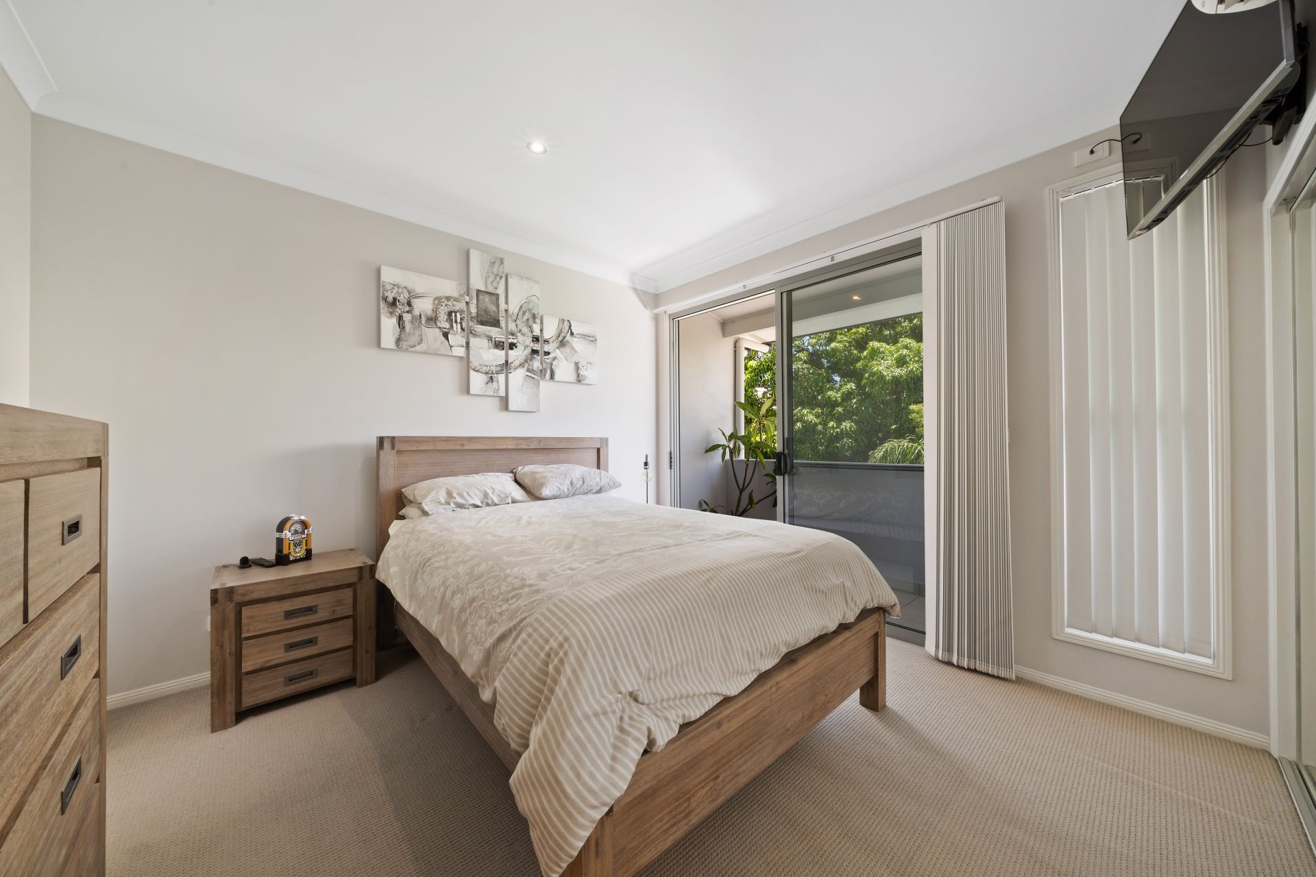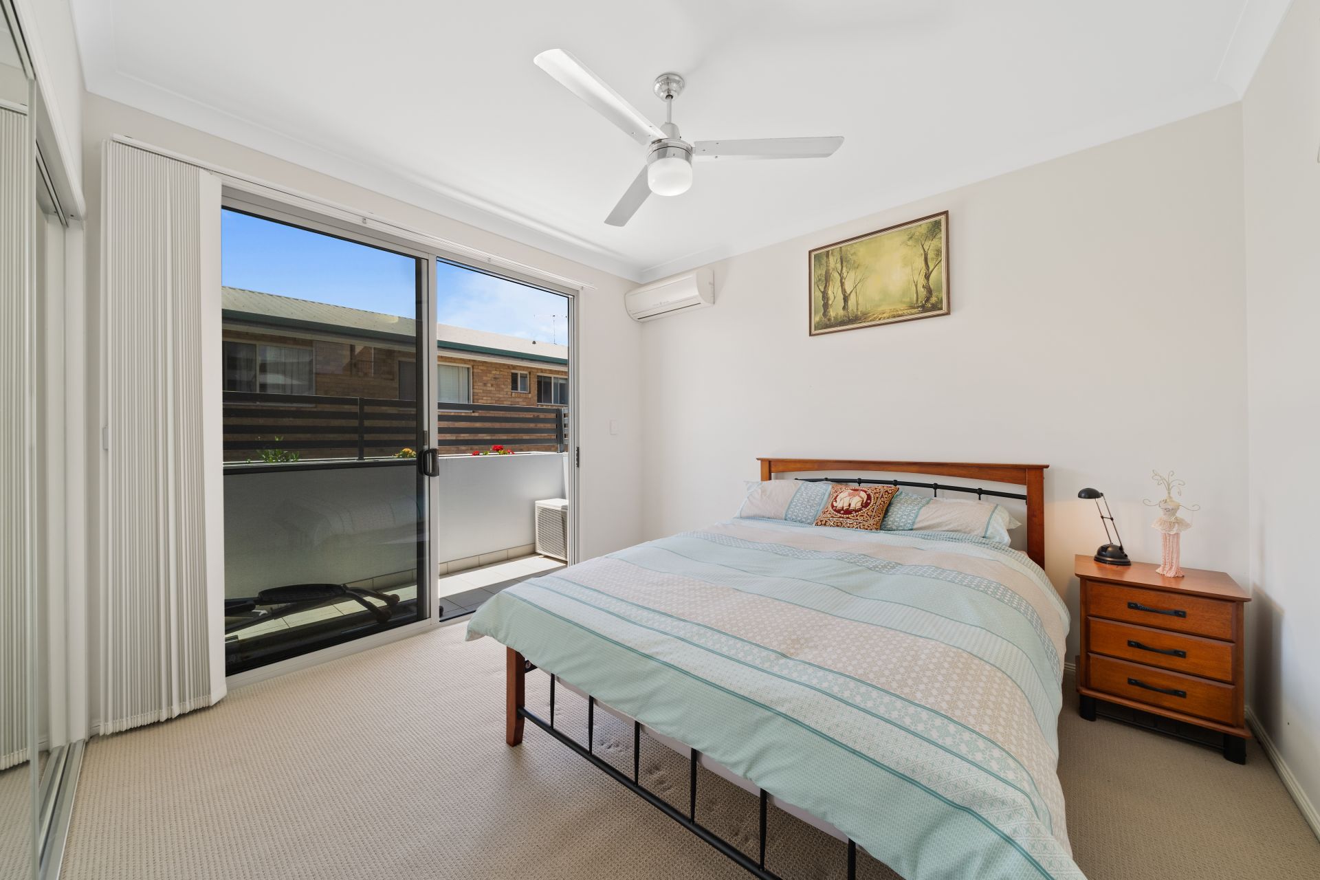 > Bedroom 2 features Fujitsu air-conditioning, extra-high ceilings, carpet flooring, built-in-robe, vertical blinds, fly screens, glass sliding doors, ceiling fan with built-in lighting and access to the Juliet balcony overlooking the courtyard.