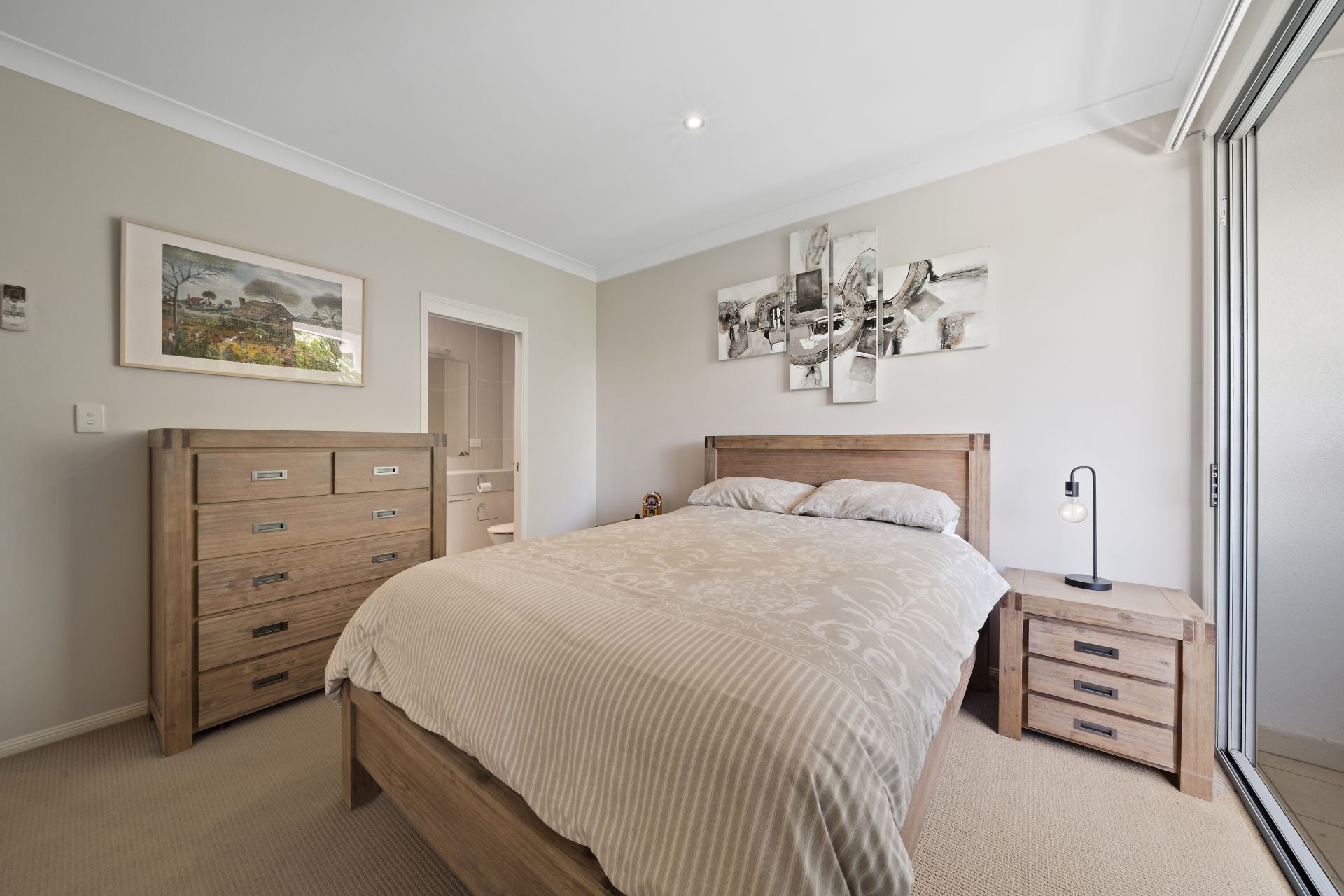 > The master bedroom features an ensuite, Fujitsu air-conditioning, extra-high ceilings, carpet flooring, built-in-robe, vertical blinds, fly screens, glass sliding doors, sash windows, down-lighting and access to the Juliet balcony overlooking the courtyard.