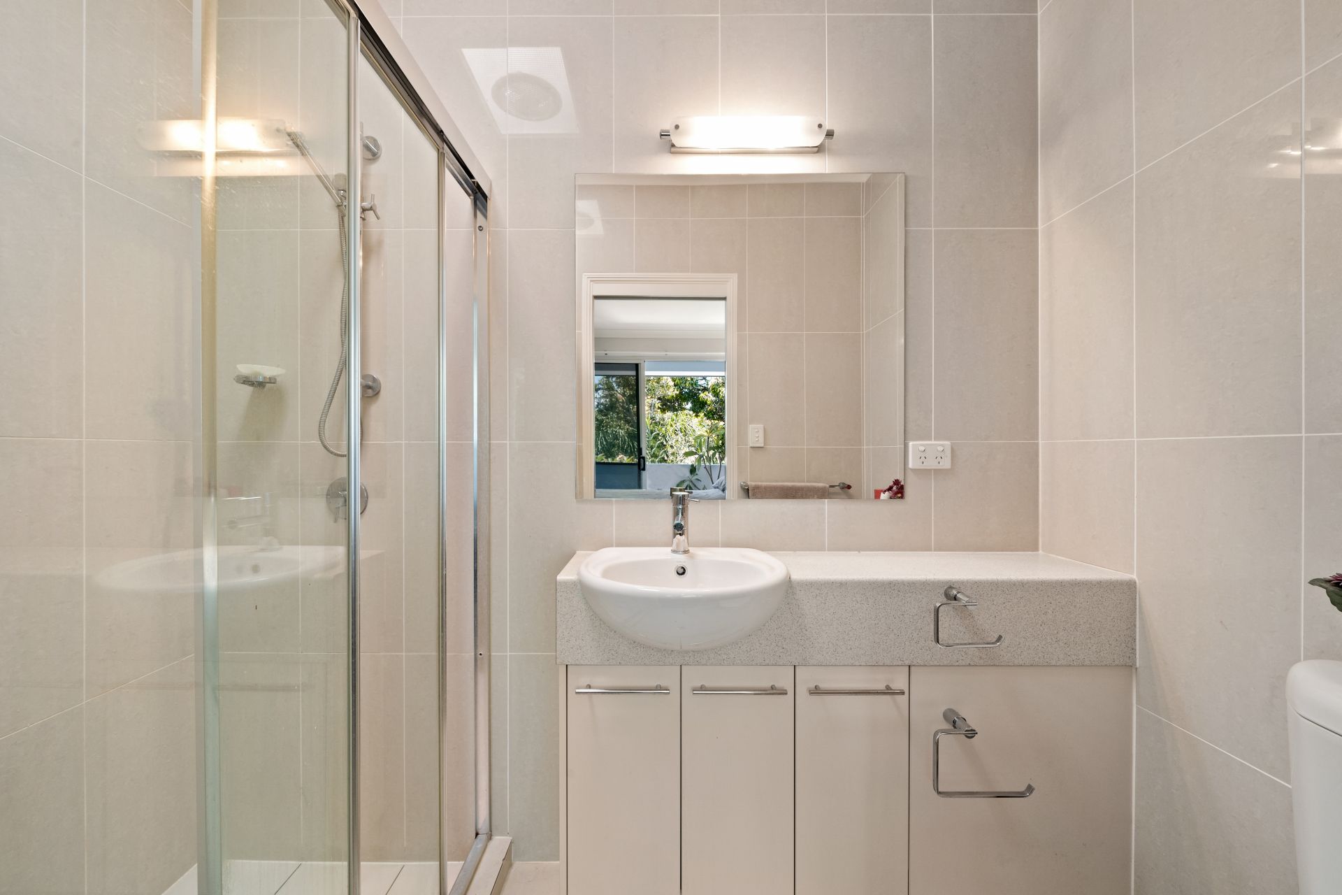 > The ensuite to bedroom one features a single basin vanity with plenty of storage, large frameless vanity mirror, towel rail, towel hooks, shower with detachable shower head skylight, extractor/lighting and toilet.