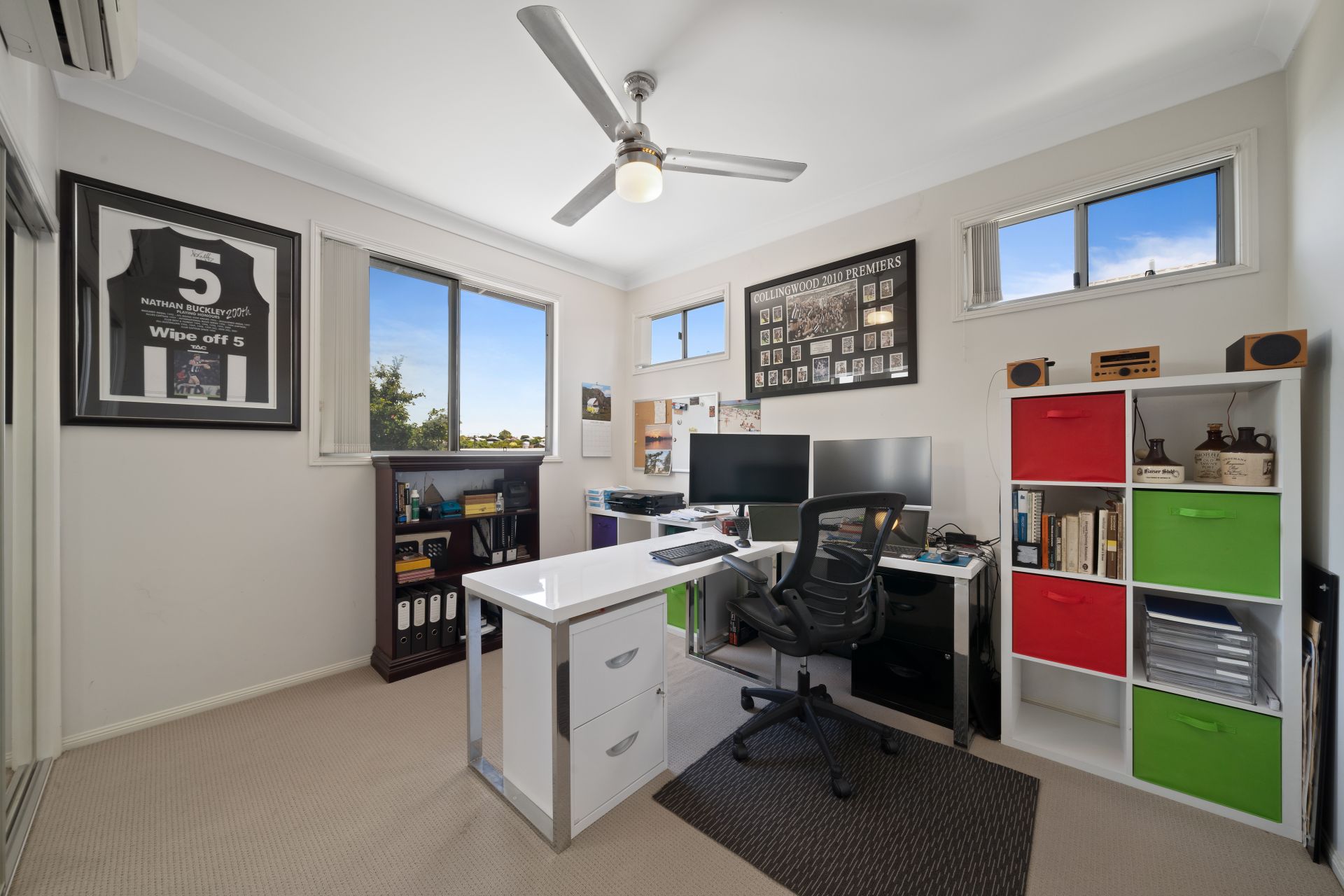> Bedroom 3 features Fujitsu air-conditioning, extra-high ceilings, carpet flooring, built-in-robe, vertical blinds, fly screens, ceiling fan with built-in lighting and sliding windows.