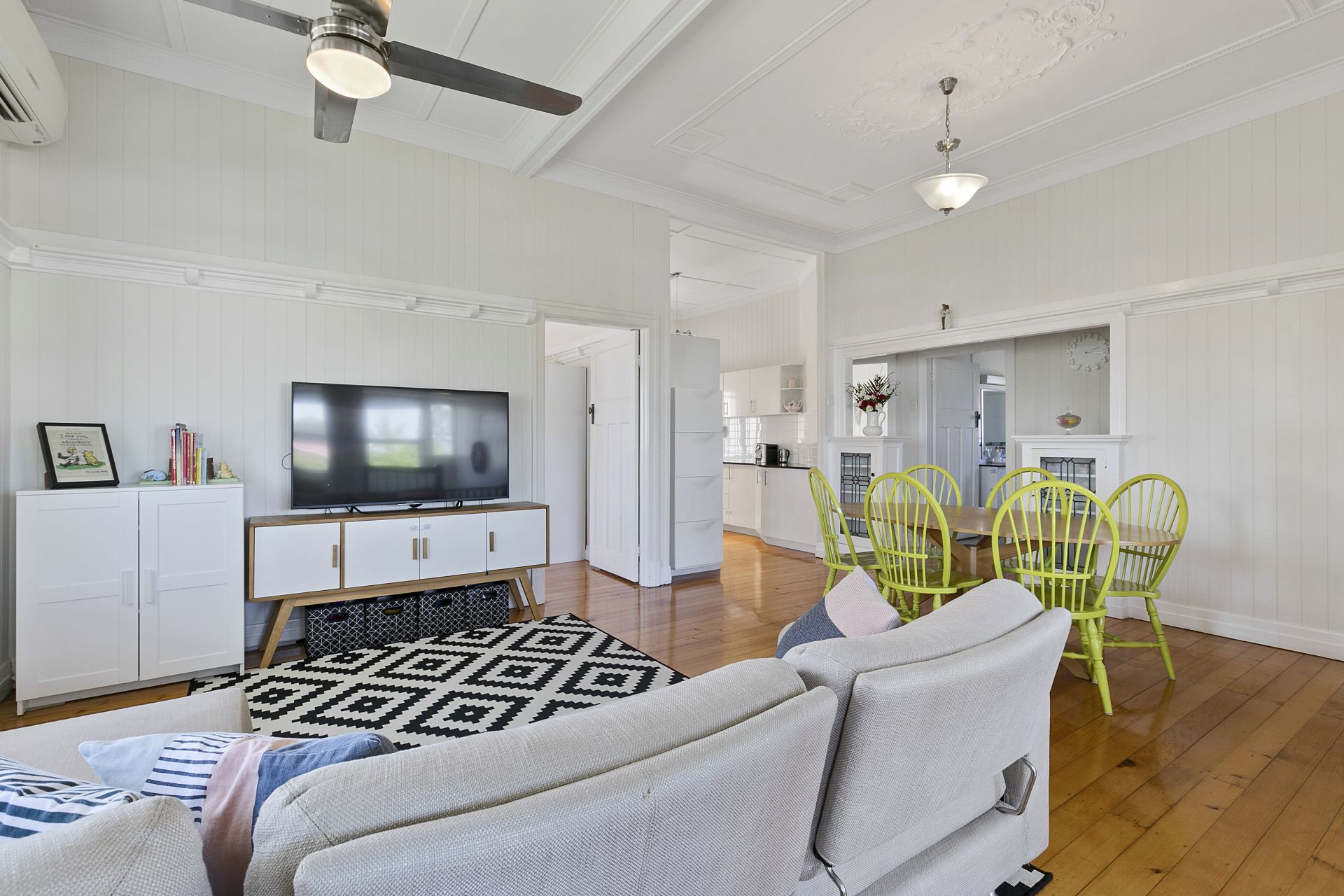 > The huge open plan living dining space is not just air-conditioned but also offers ceiling fan and just screams classic Queenslander style long forgotten in yesteryear boasting classic charm with 6 inch pine boards, VJ's, high ceilings, picture railing and ornate corning plus ceilings whilst downstairs has enjoyed a modern addition and is perfect for the teenager wanting their own space with a bedroom/study and separate rumpus.