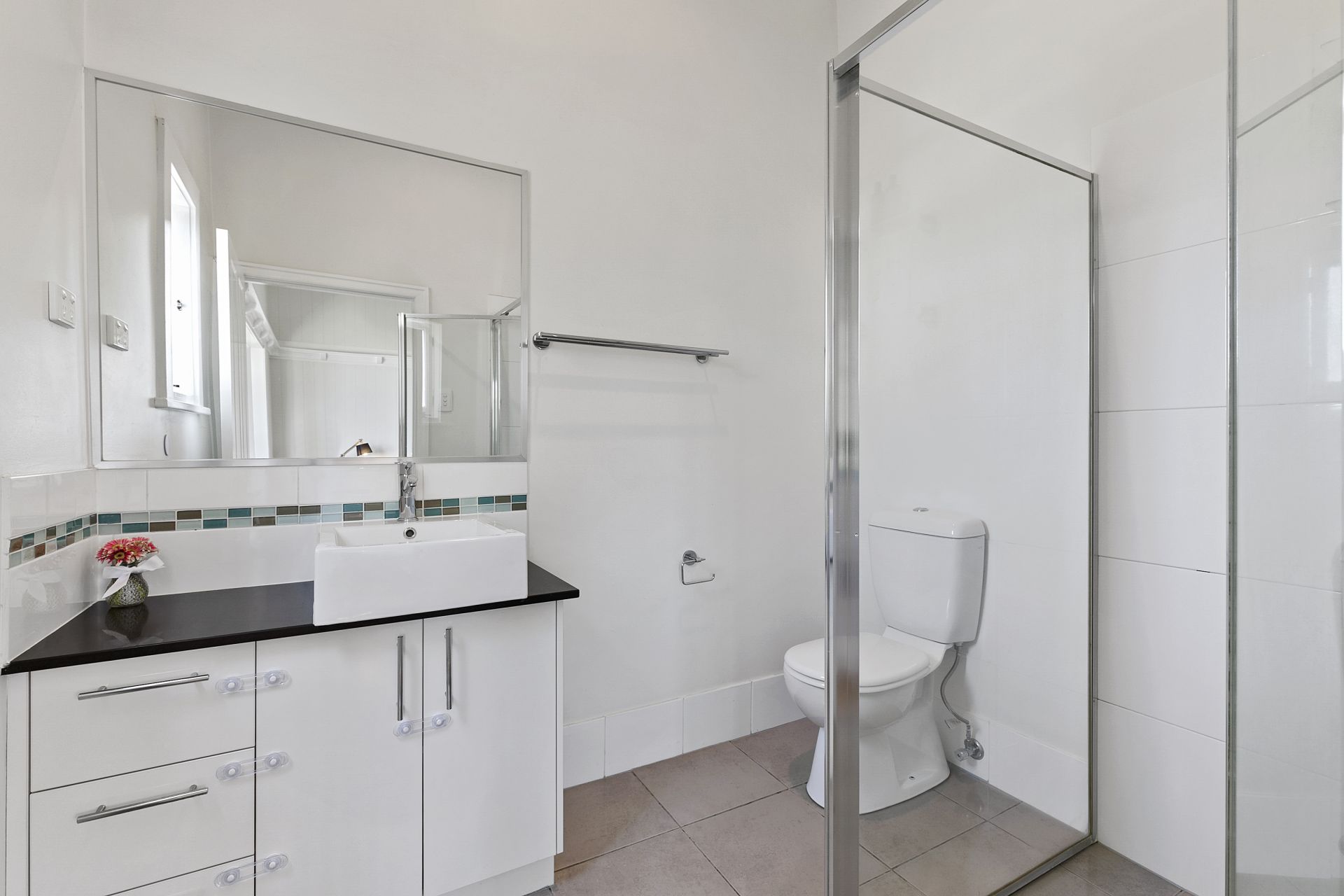 > Ensuite to the master bedroom offering seamless glass and chrome shower, stone benchtops with single vanity and toilet.