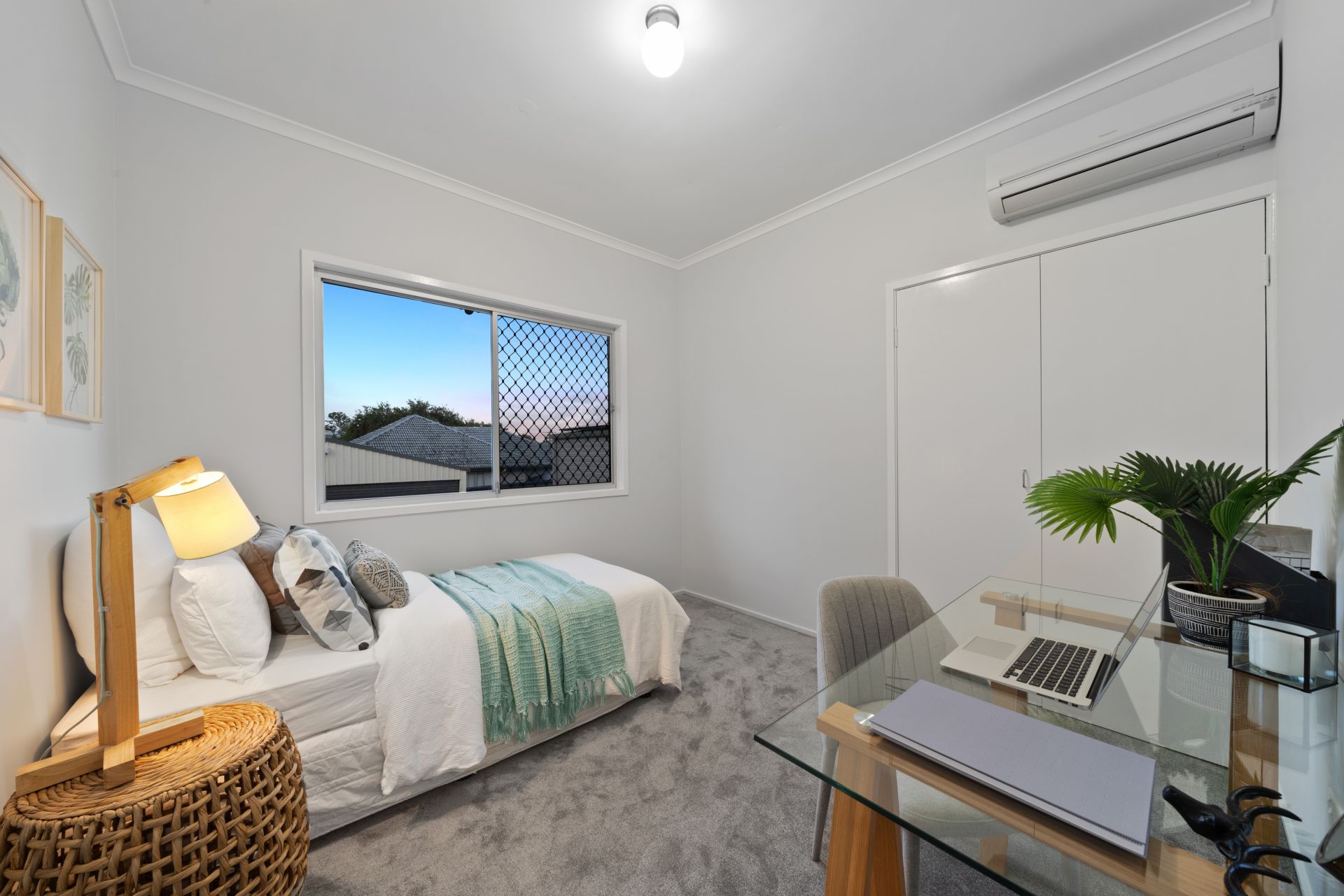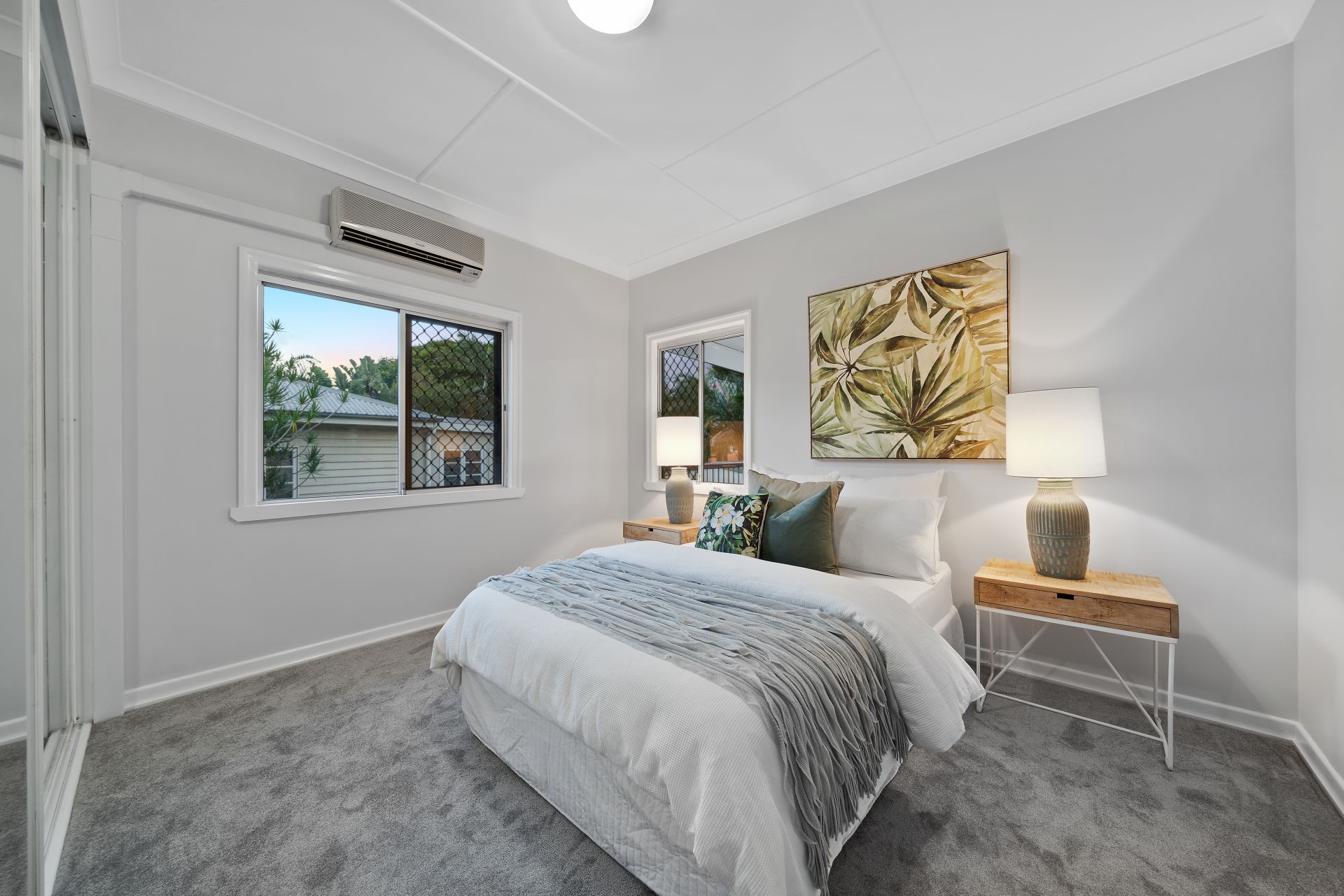 > Bedroom 1/master is a light-filled space offering Panasonic air-conditioning, carpet flooring, extra-high ceilings, sliding windows, security + fly screens, venetian blinds, oyster lighting and built-in wardrobe.