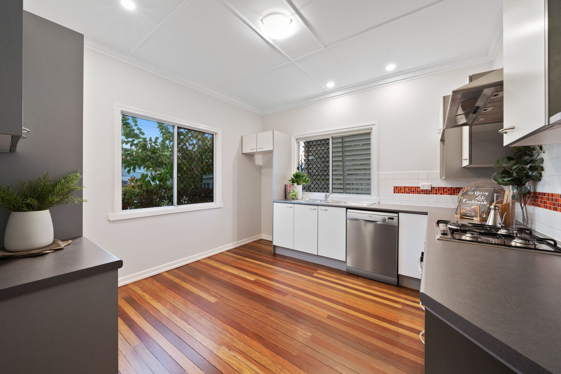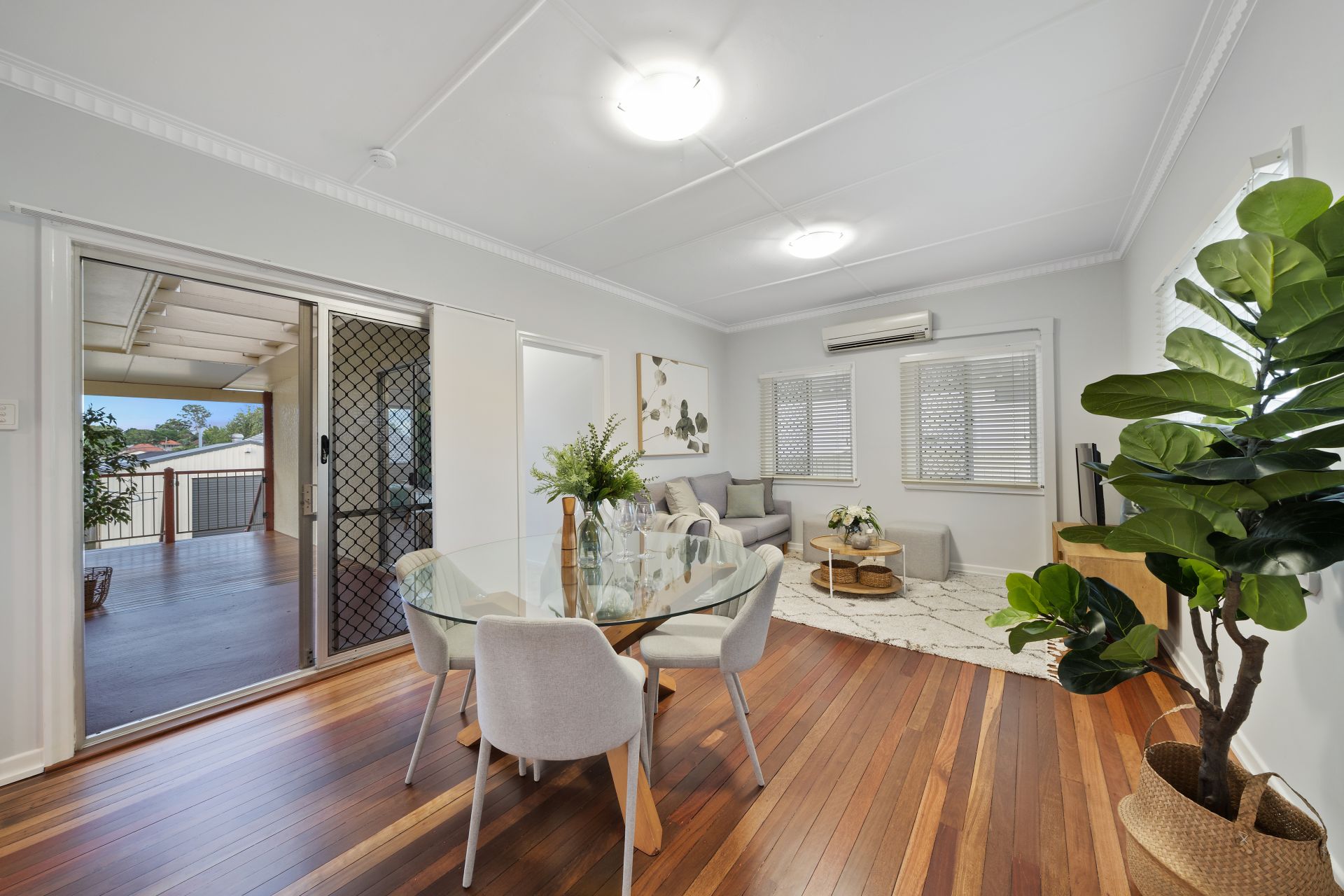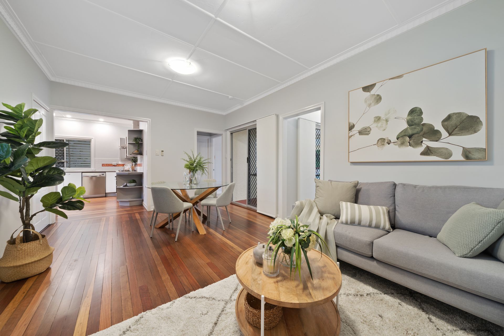 > The lounge/dining flows effortlessly to the kitchen and through to the outdoor entertaining areas. Featuring Panasonic air-conditioning, glass + security doors, rich timber flooring, extra-high ceilings with ornate cornicing, oyster lighting, sliding windows with fly + security screens, venetian + extra wide panel blinds, and with access to the front landing offers a seamless flow of living space.