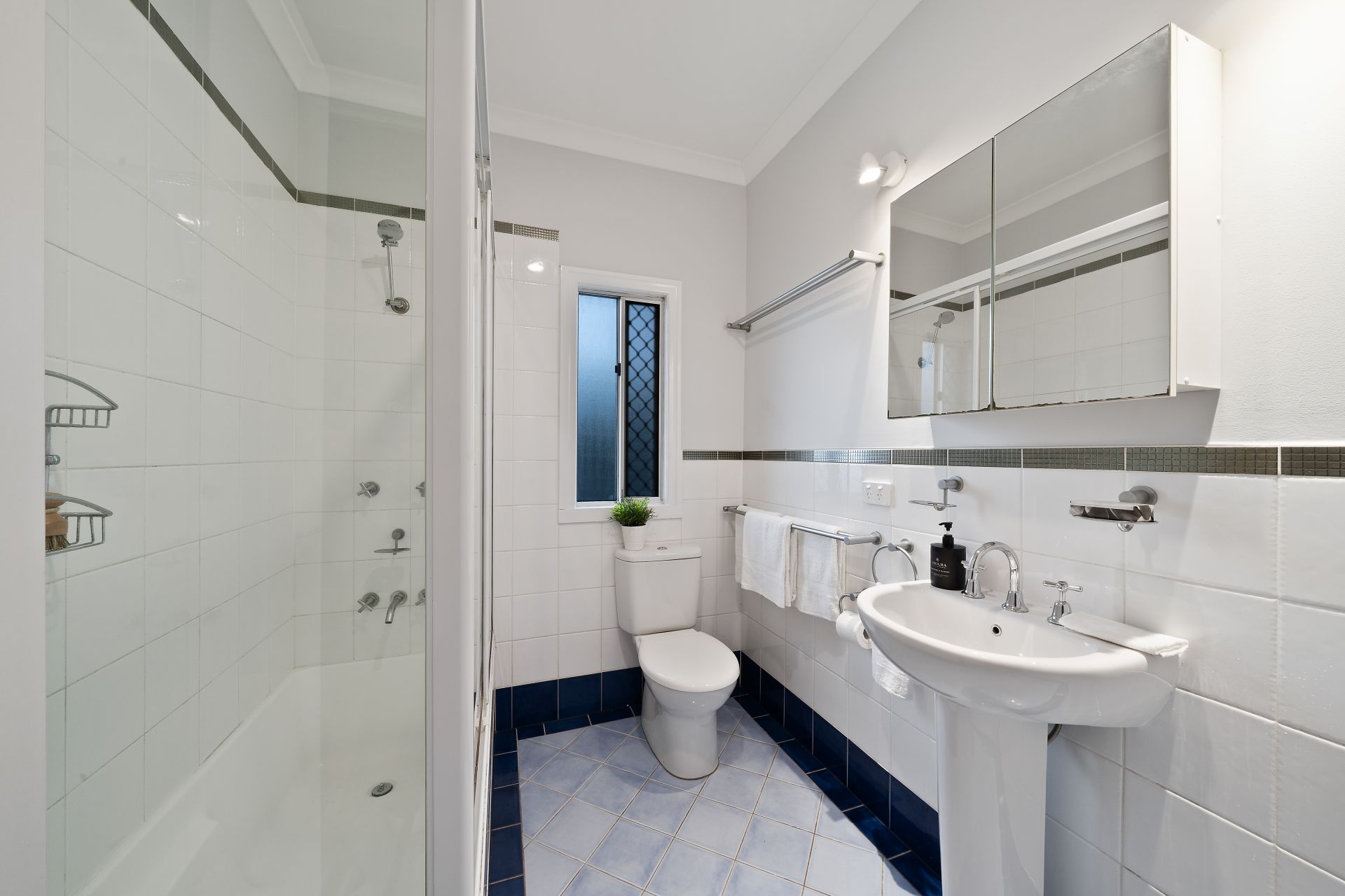 > The main bathroom features a shower over bath configuration, single basin column vanity, mirror faced medicine cabinet, dual towel racks, light/extractor combo + gallery lighting, separate toilet, linen cupboard and separate laundry facilities.