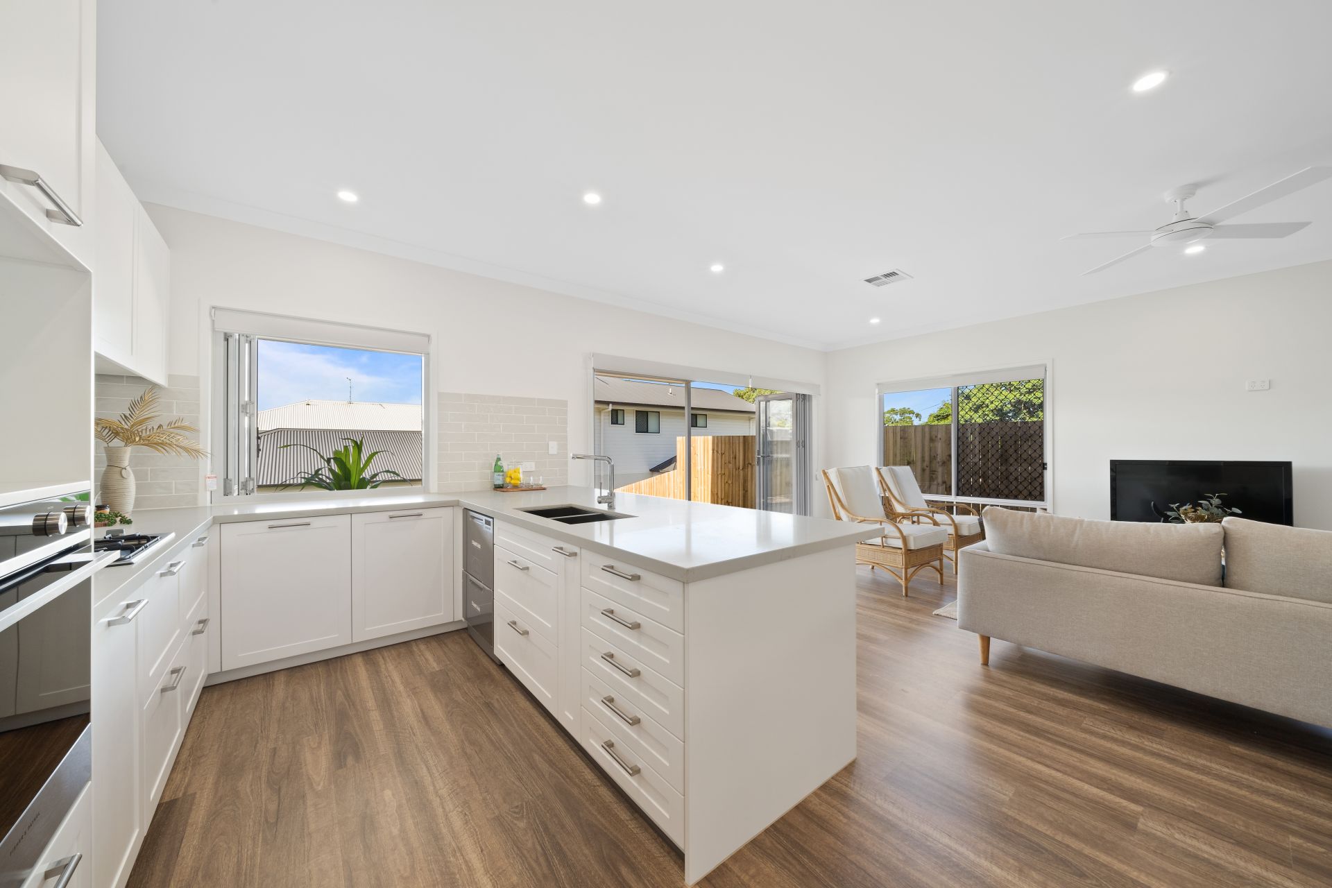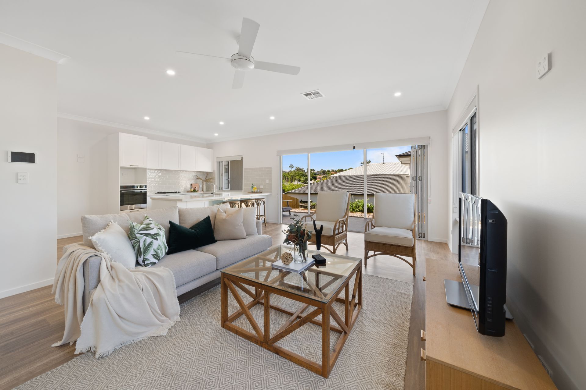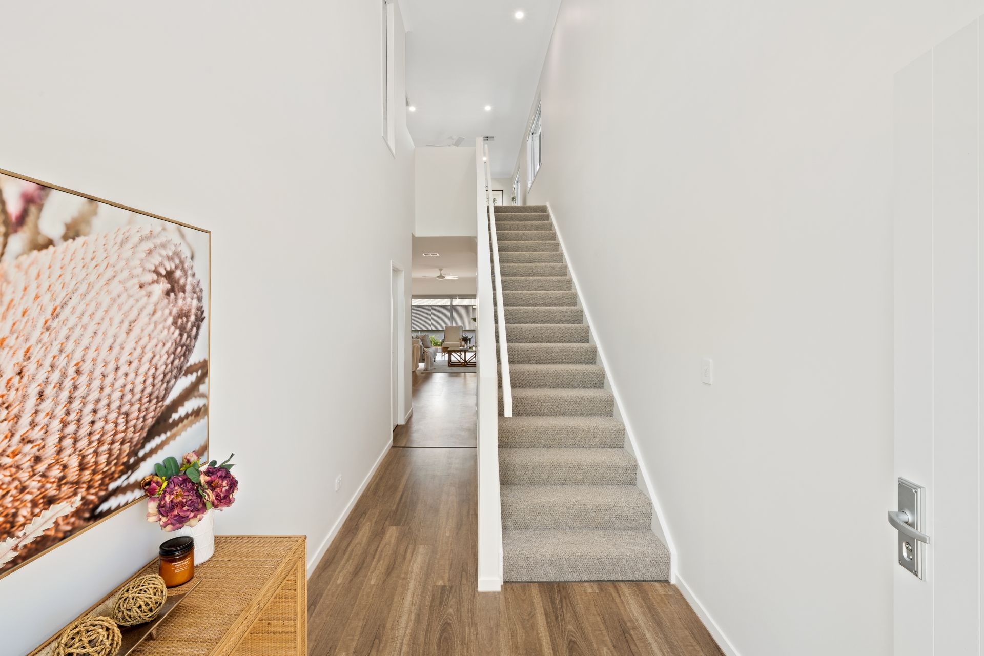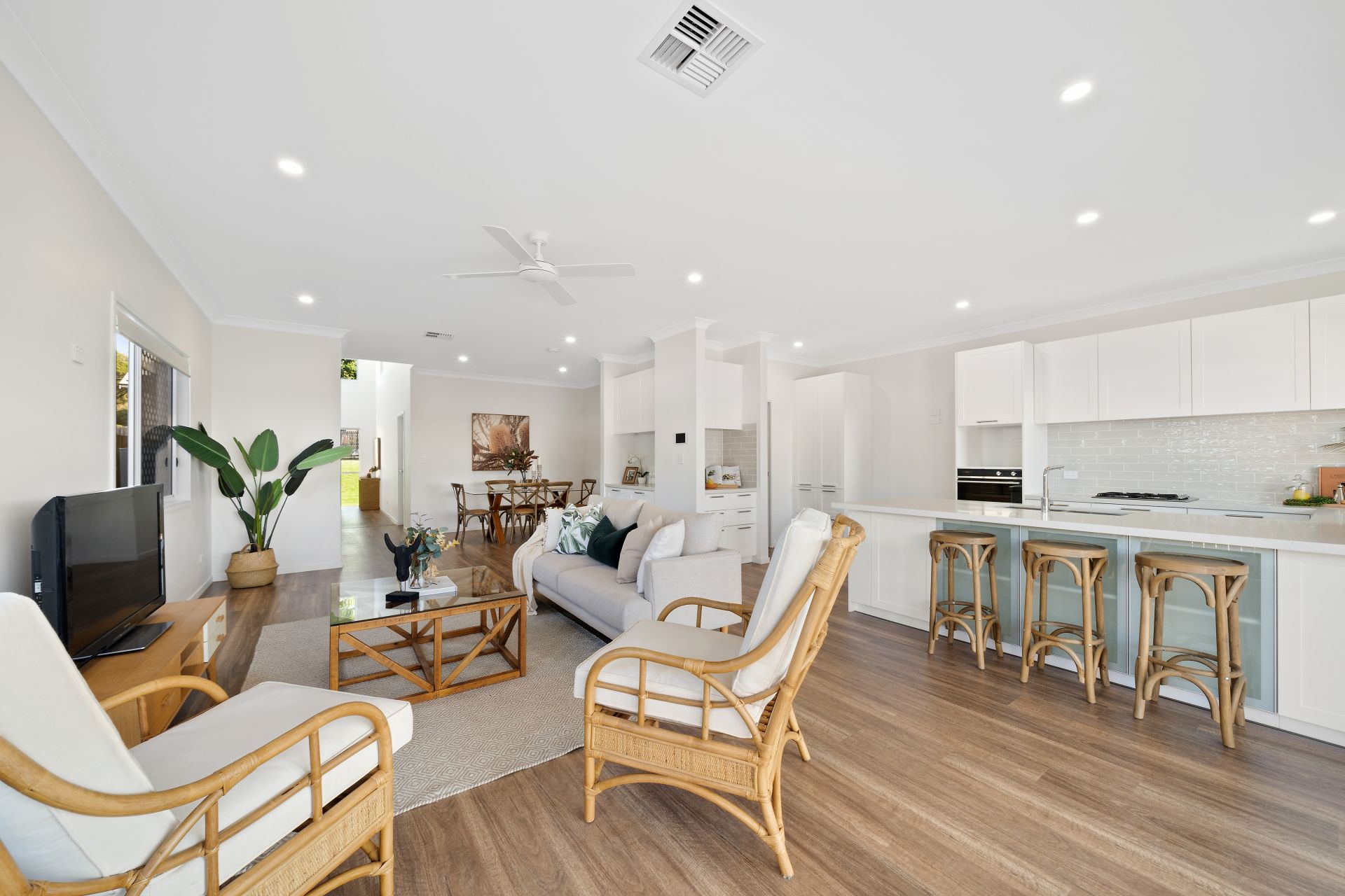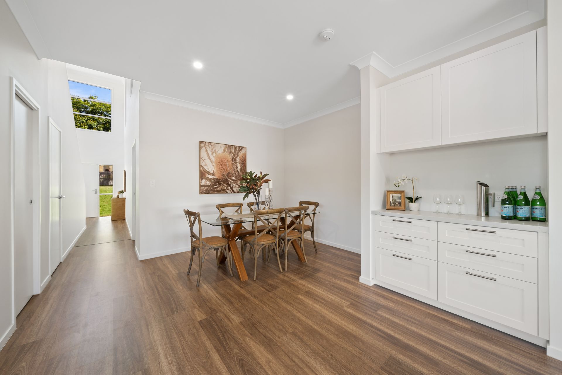 > The open plan main living/dining areas located at the back of the home flow effortlessly to the kitchen and through to the outdoor entertaining area. The extra high ceilings in conjunction with the light and contemporary colour scheme adds to the expansive nature of the home, featuring ducted air-conditioning, down-lighting, durable engineered flooring, roller blinds, custom cabinetry, sliding windows and large glass sliding doors.