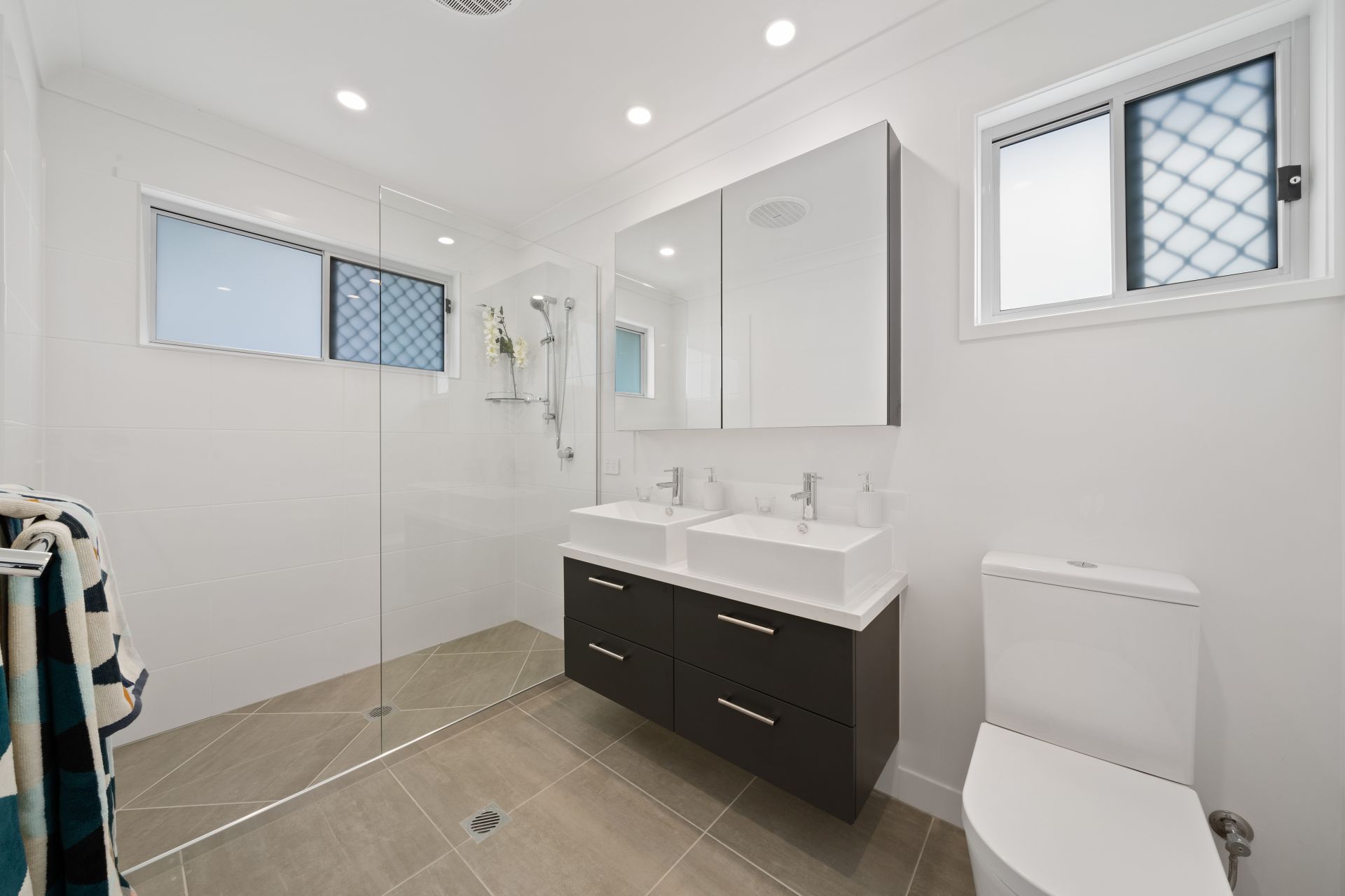 > The master ensuite features walk in shower featuring a semi frameless shower screen, detachable showerhead and glass custom shelf. Boasting dual basin stone topped vanity with soft close draws, mirror faced medicine cabinet, toilet, and towel rails.