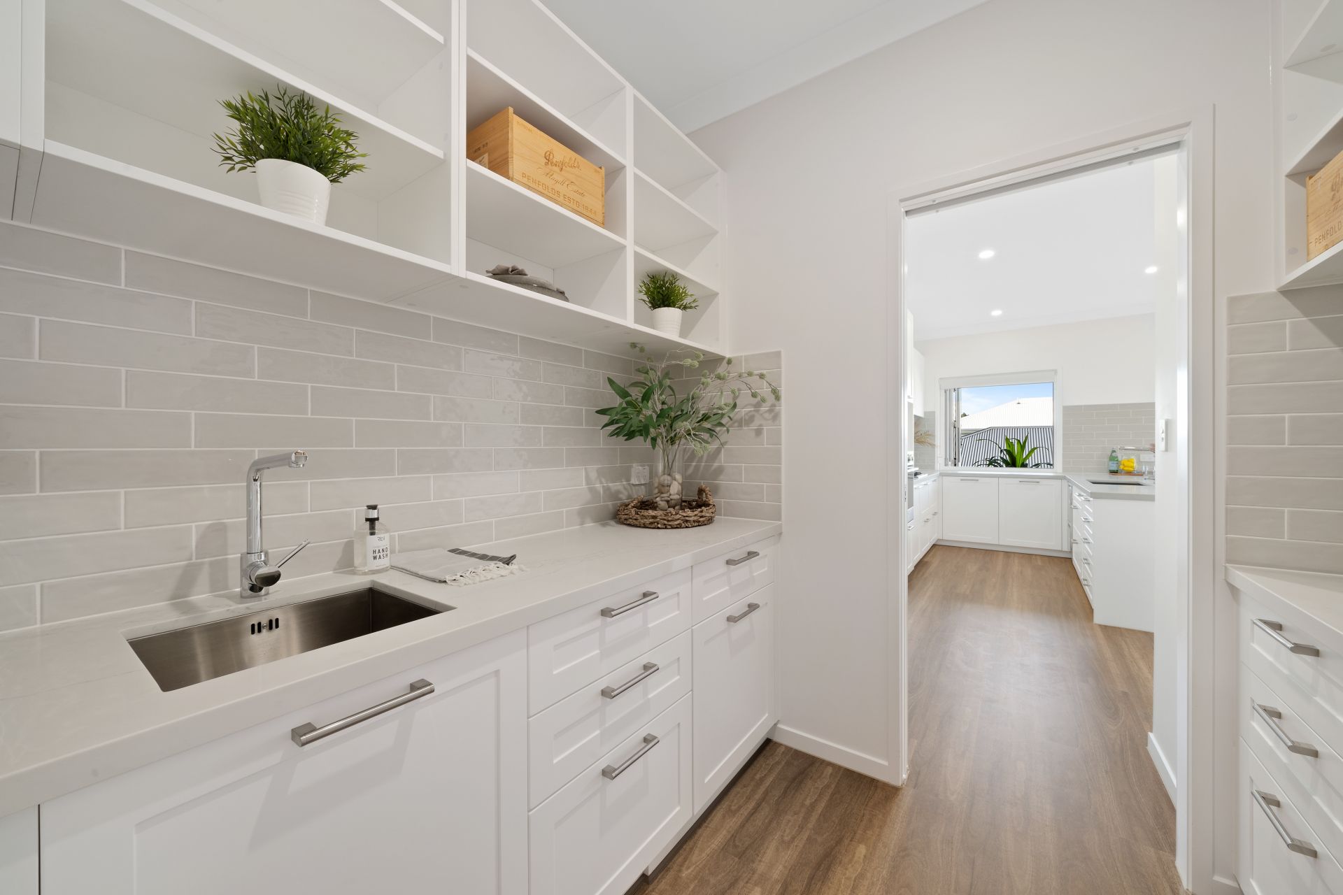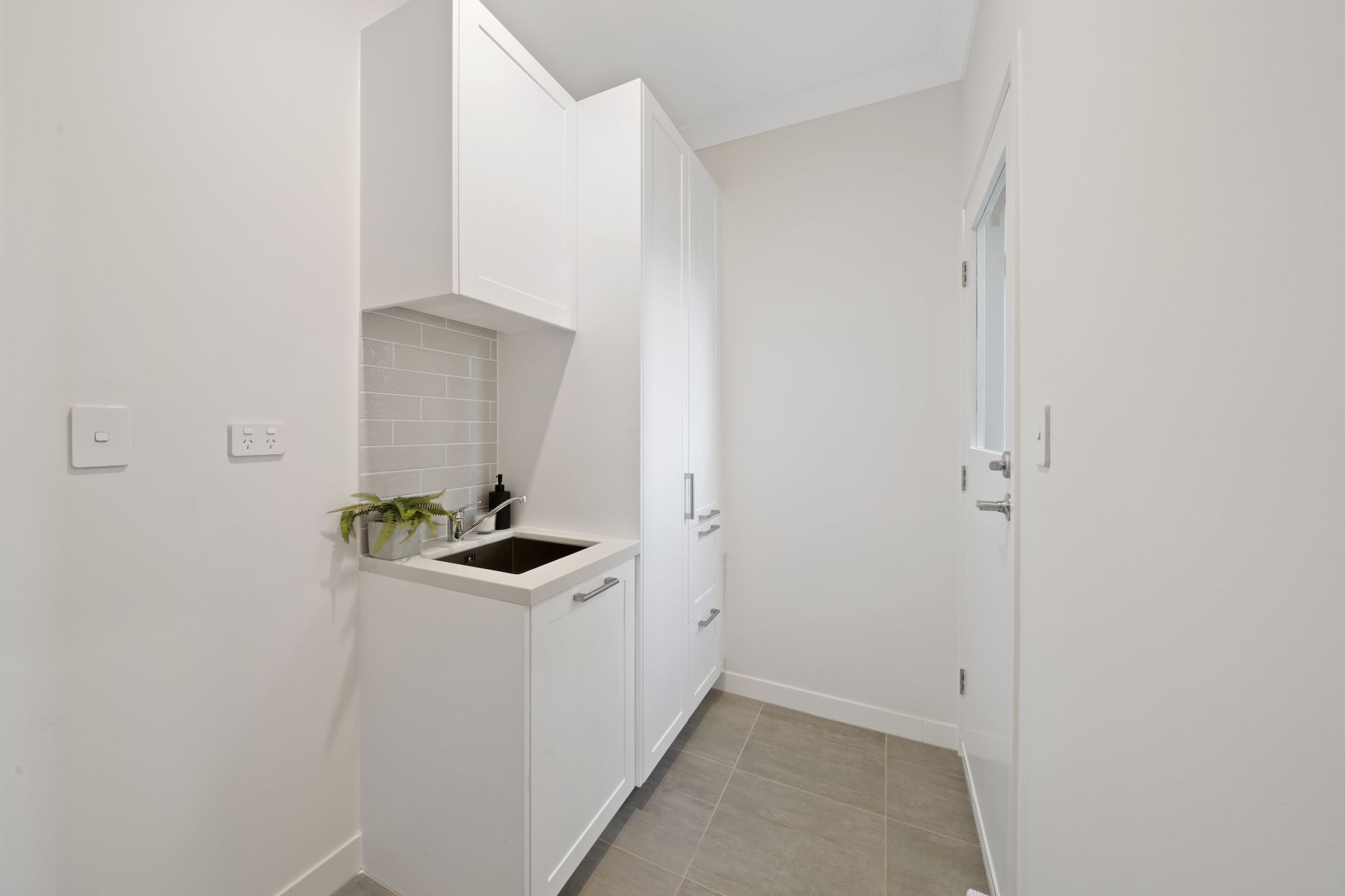 - The laundry located on the entry level features large wash tub, stone bench tops and custom cabinetry.