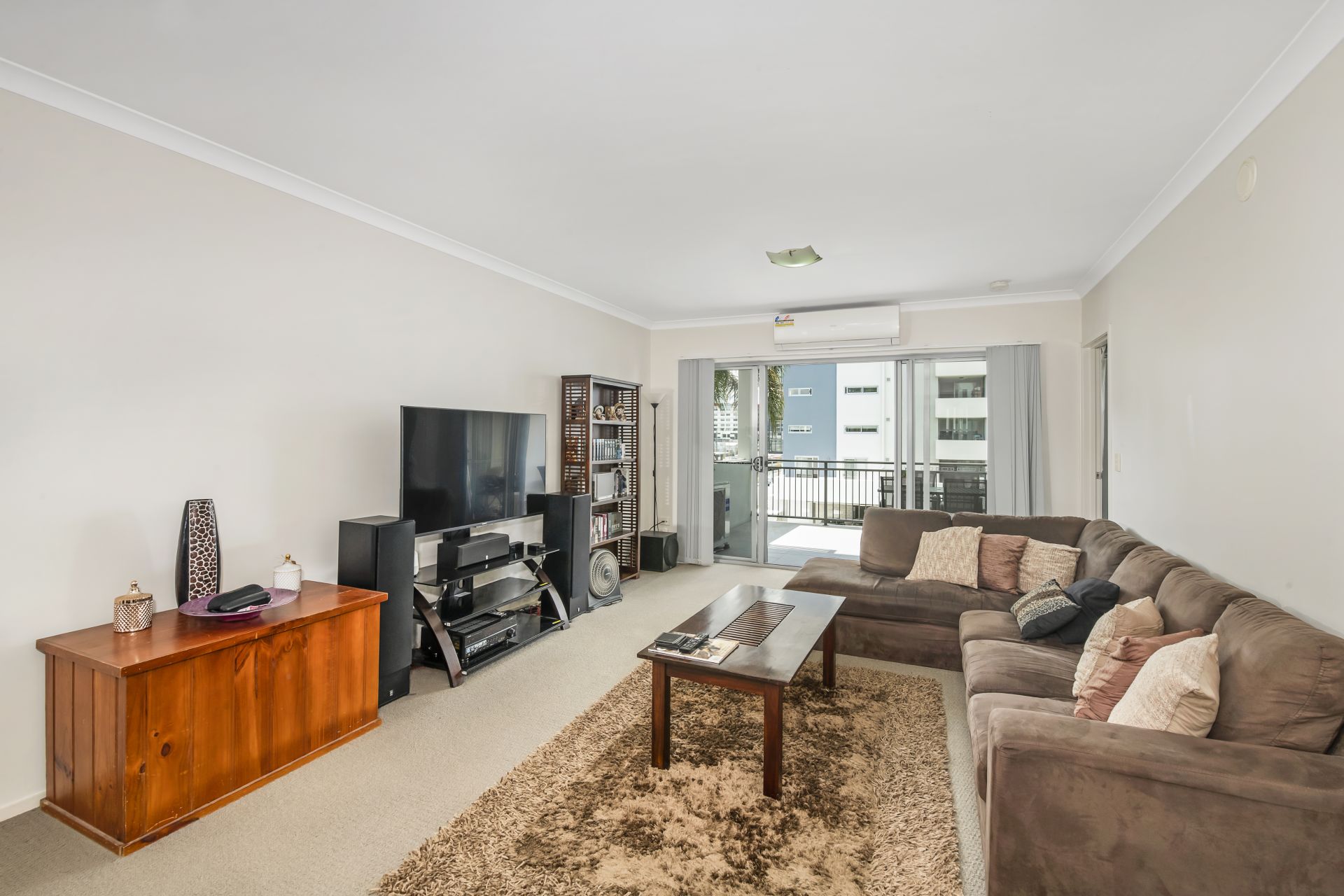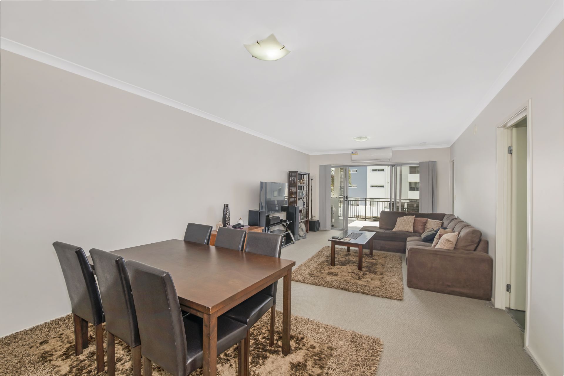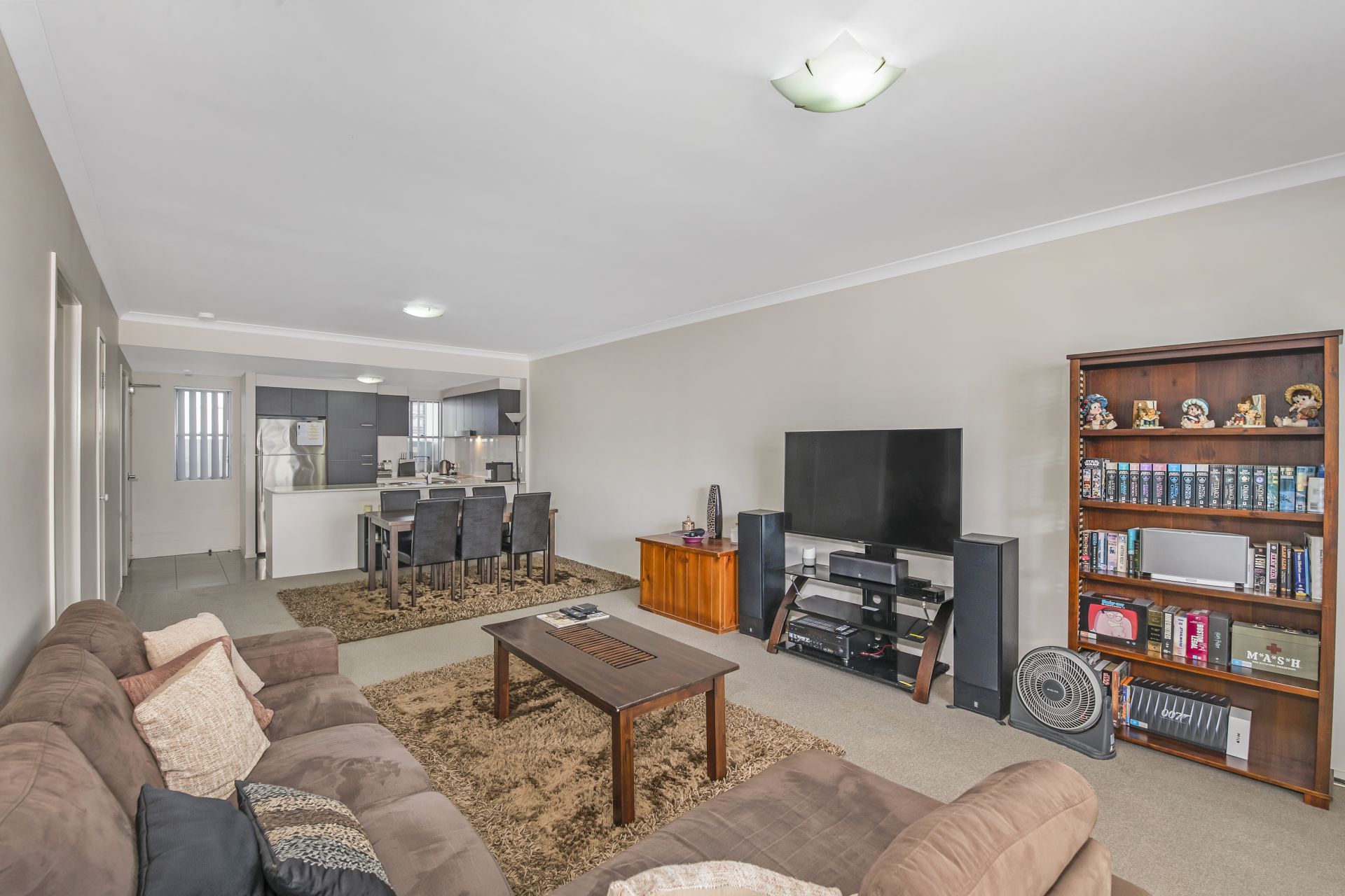 - Lounge room shares a large open space with the home's dining area and kitchen. This great size room features carpeted flooring, split system air-conditioning, blinds and access to the large covered balcony.