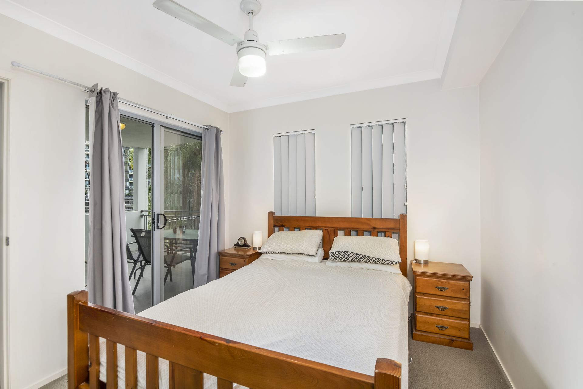 - Bedroom one is the unit's master bedroom and features ensuite, carpet flooring, ceiling fan, walk-in-robe, sliding door access to the balcony and blinds.
