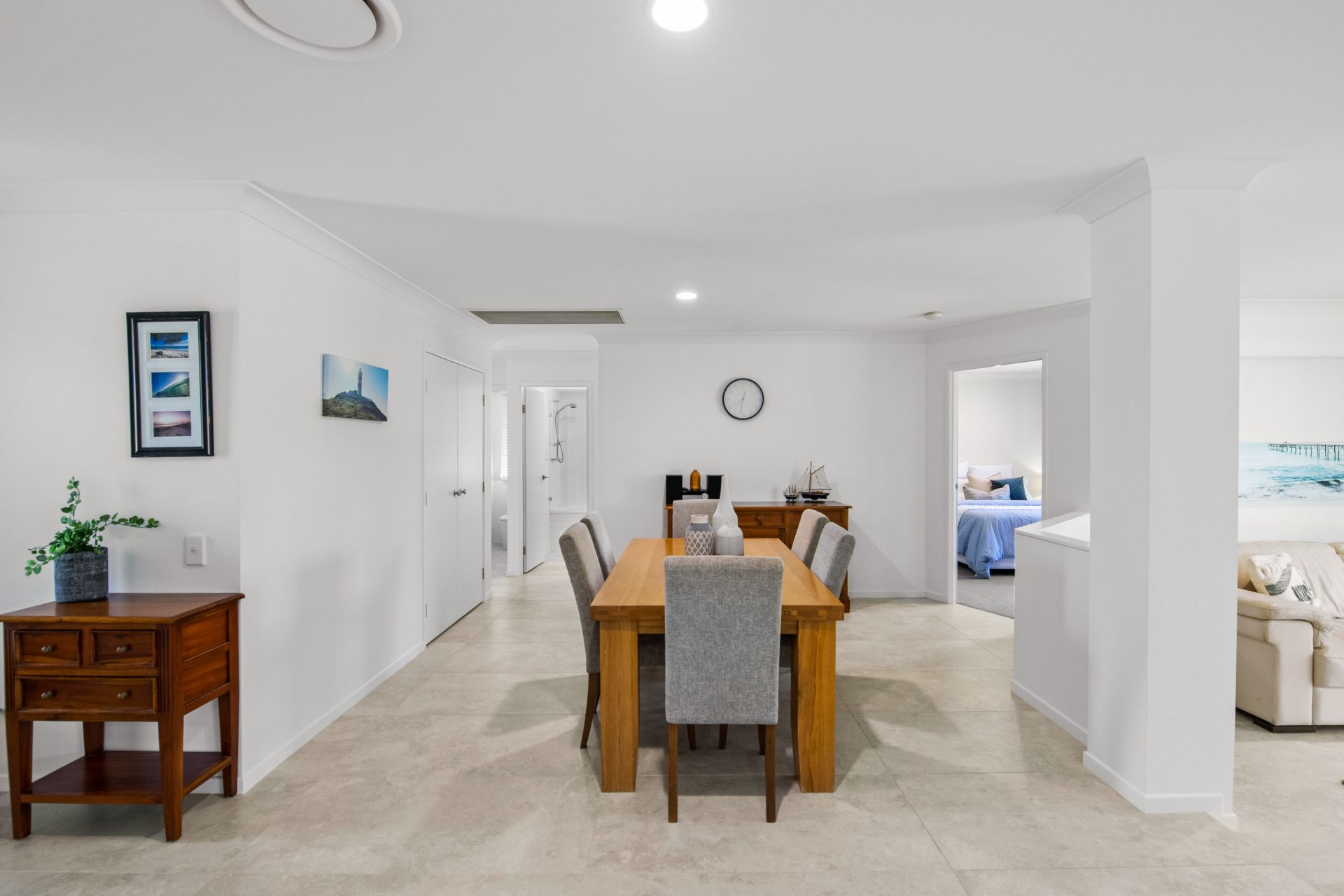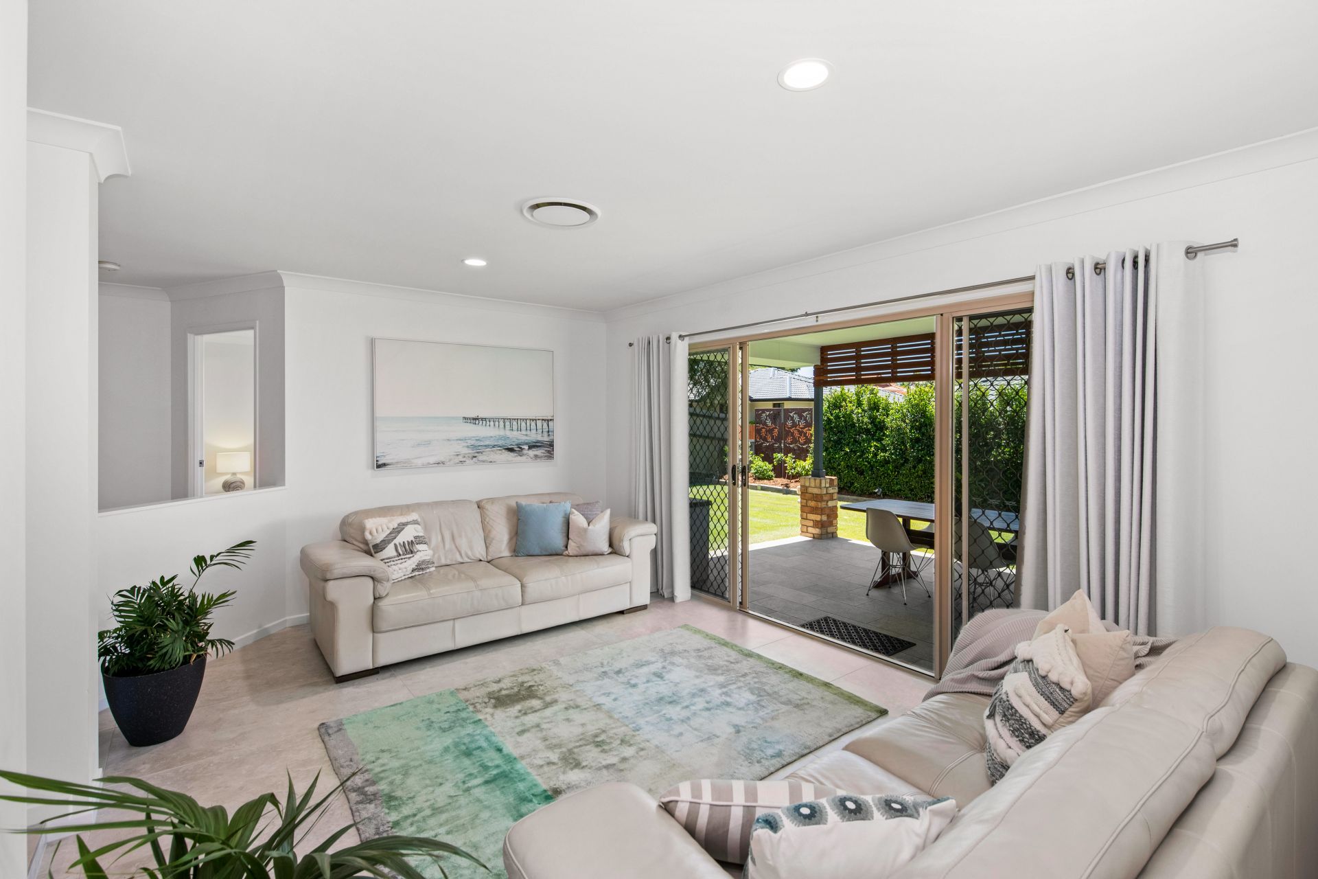 - Large living room that features Italian made tiled flooring, ducted air-conditioning, security screens and blinds.