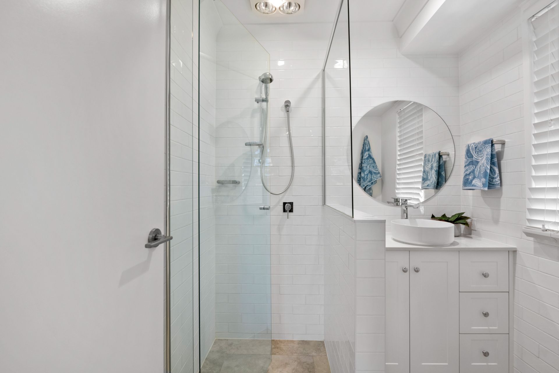 - Bathroom one is the home's beautifully renovated main bathroom and features tiled flooring, shower over bath, custom single vanity, soft close cabinetry, stone bench top, floor-to-ceiling feature hand made subway tiles, security screens and separate toilet.