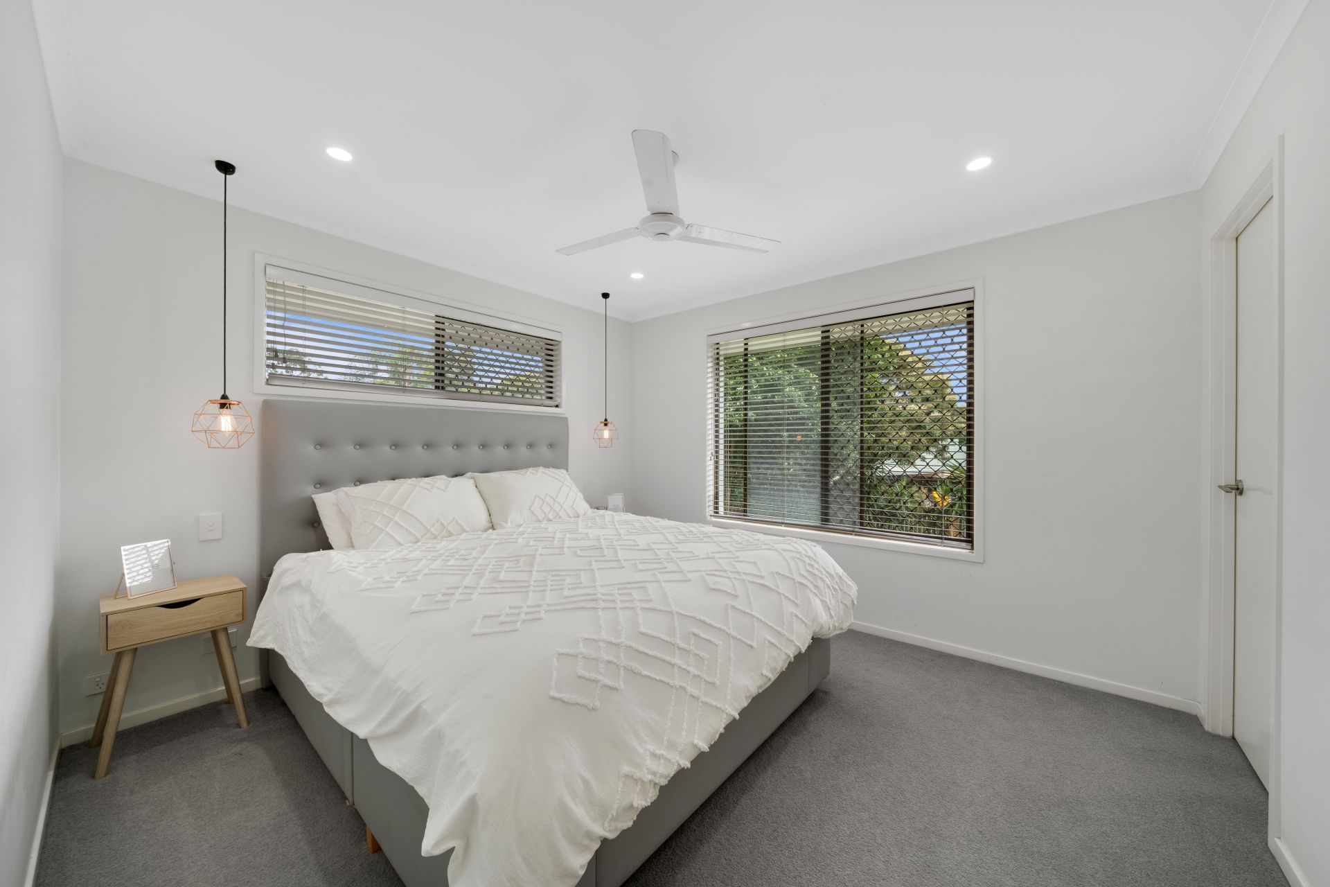 > The spacious master features plush carpet flooring, pendent + down-lighting, timber venetian style blinds, walk-in-robe, sliding windows with security and ceiling fan.