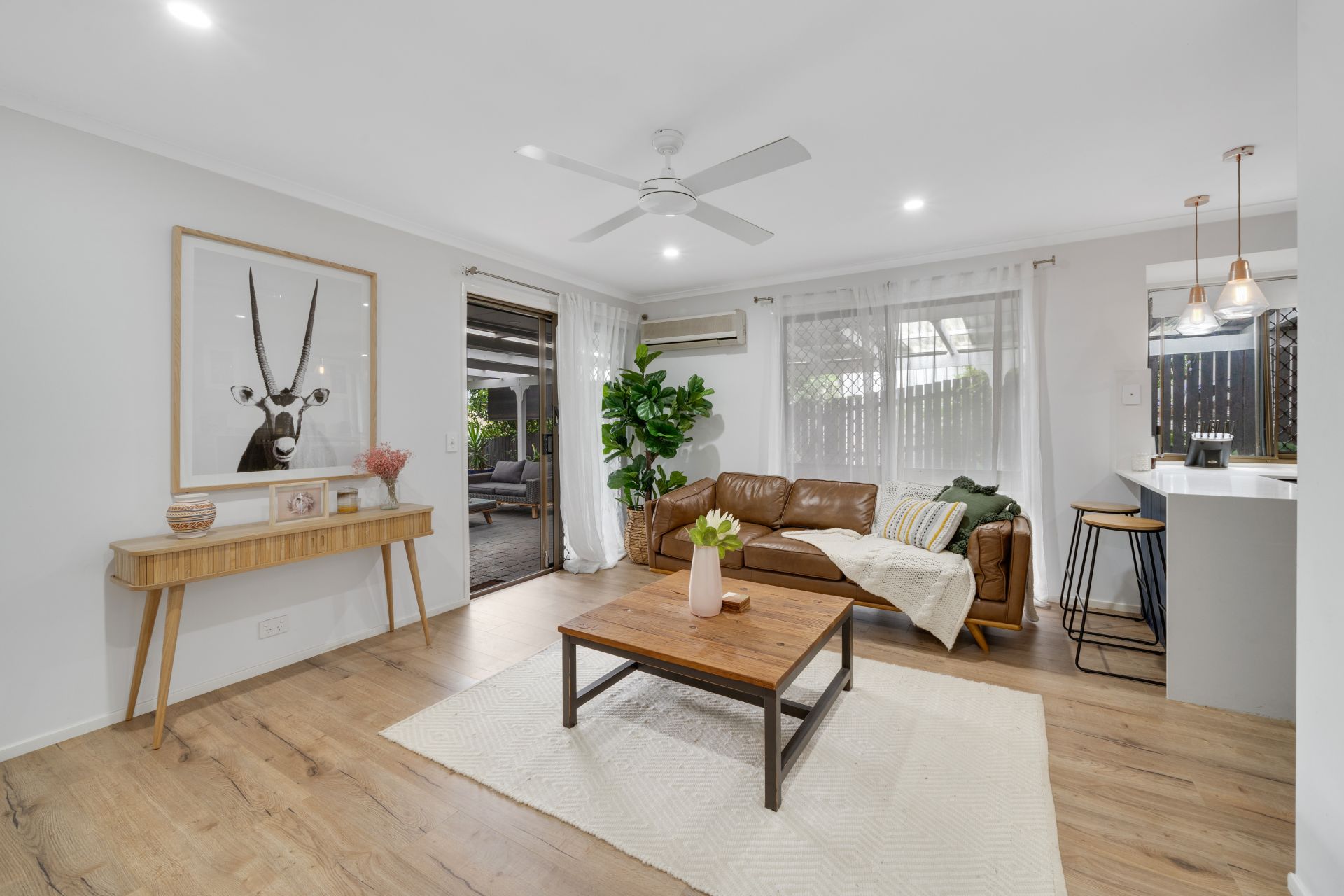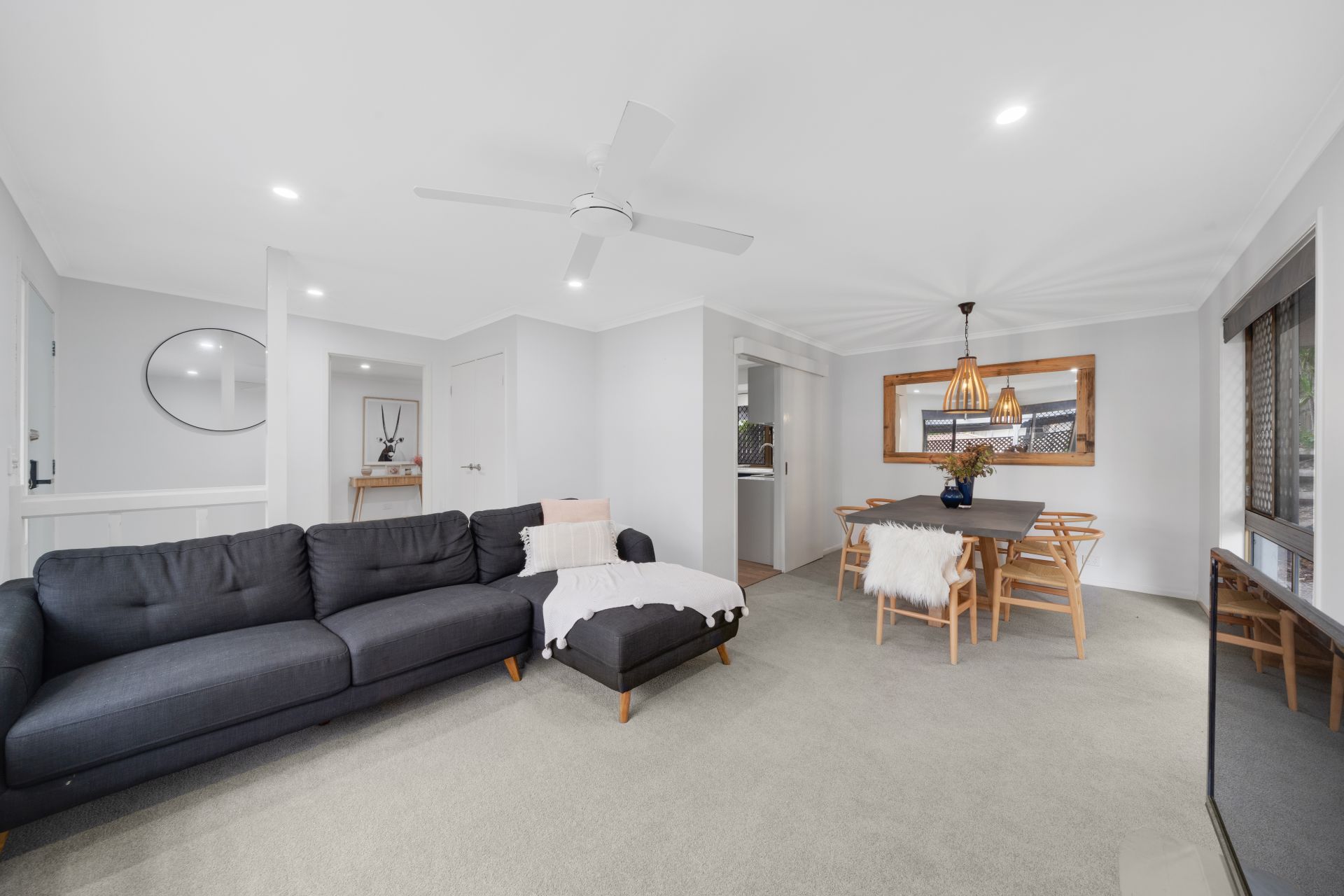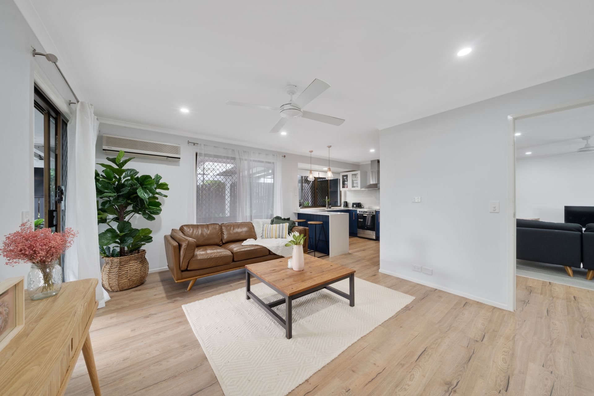 - The open plan lounge/dining areas flow effortlessly to the separate living/kitchen and out to the covered outdoor entertaining area and yard. The many windows and doors add to the expansive nature of this home featuring a combination of carpet + durable wood look flooring, sliding windows with security screens, air-conditioning, ceiling fan, pendant + down-lighting, roll down blinds and curtains.