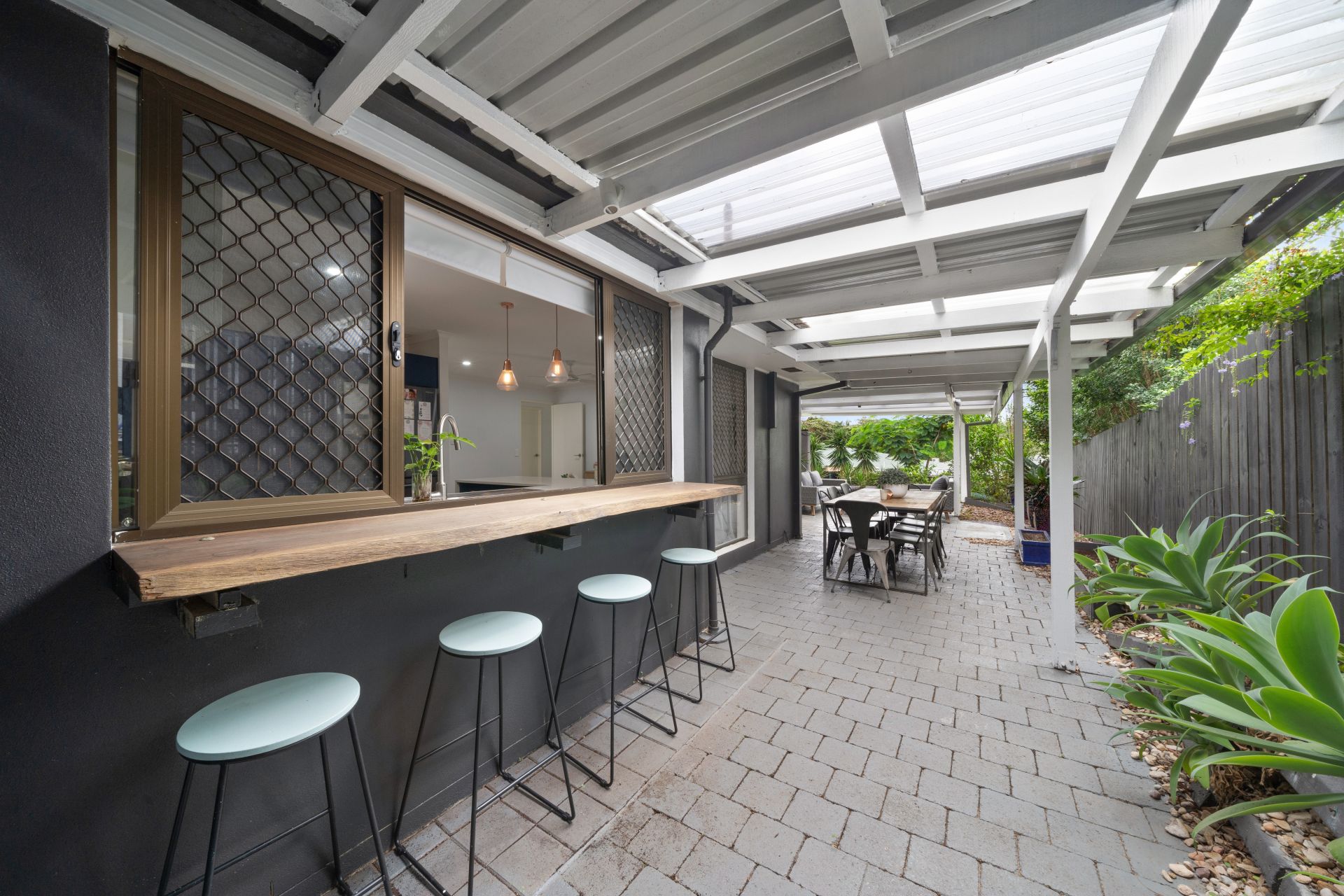 > Servery window directly to the outdoor entertaining area