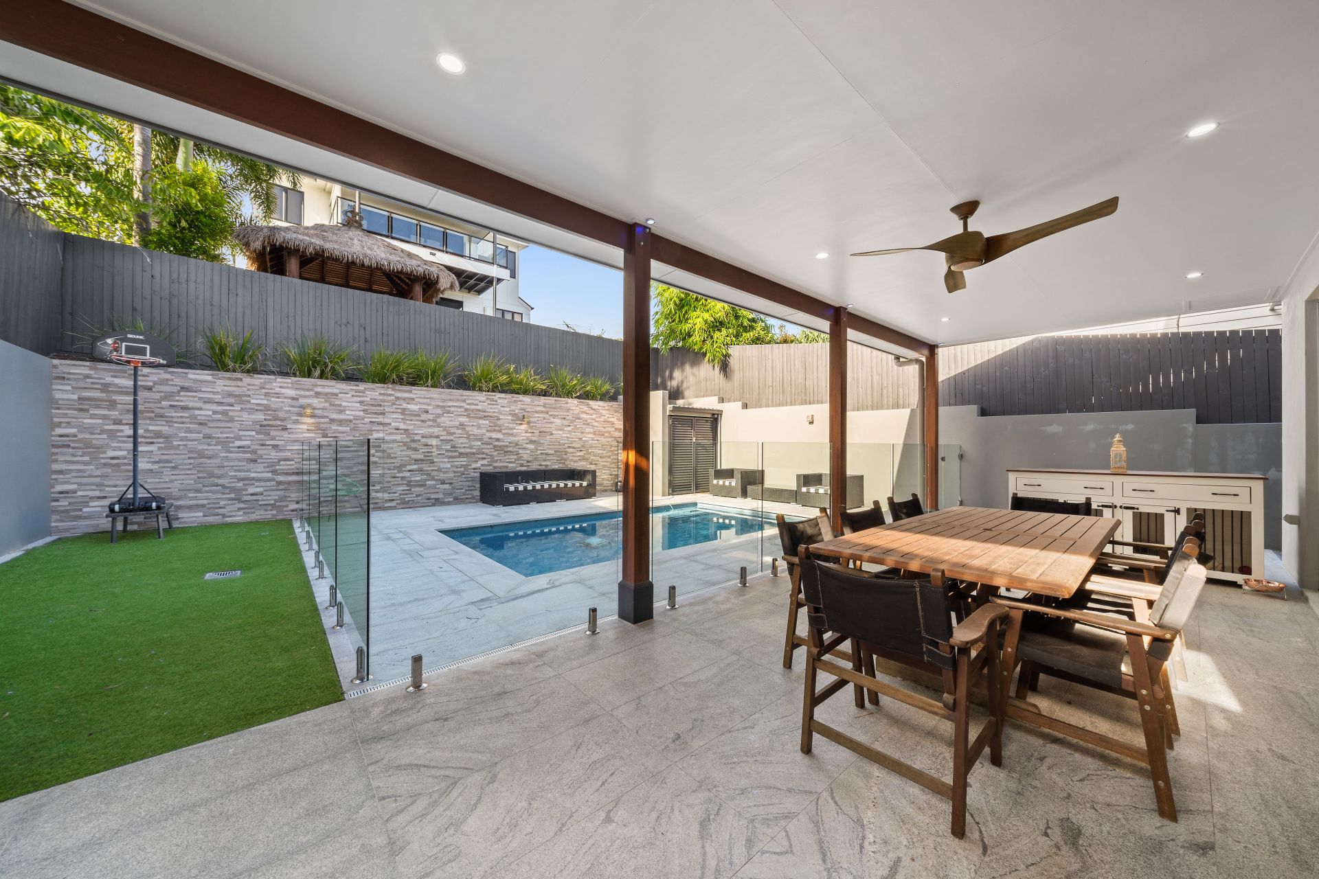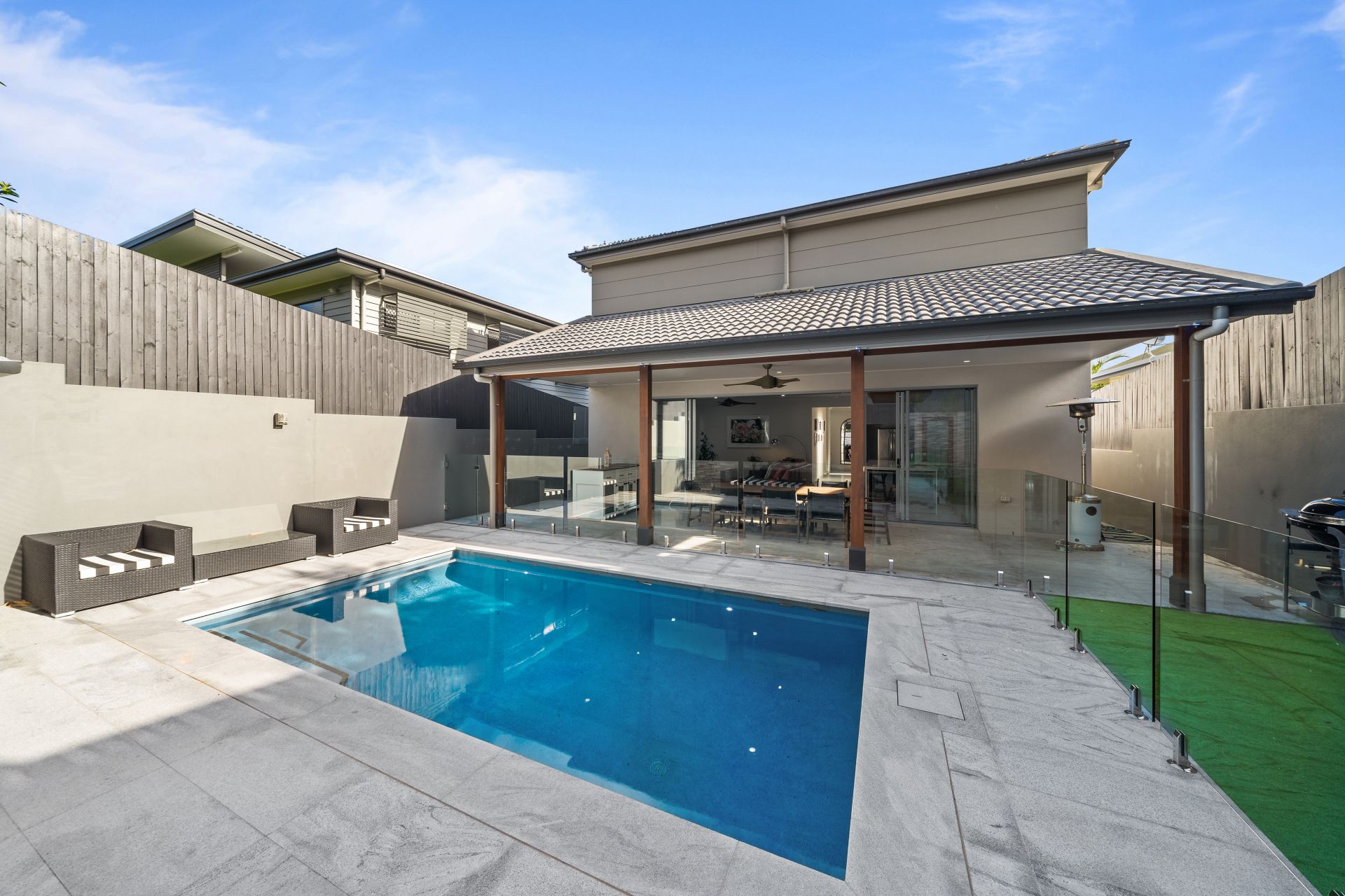- Outdoor entertaining will be a breeze thanks to the over-sized covered patio boasting a paved stone flooring, outdoor lighting, outdoor power points and ceiling fan. Complimented by the glistening in-ground pool with low maintenance landscaped gardens and fully fenced kid/pet friendly yard, encapsulating everything there is to love about our Queensland lifestyle.