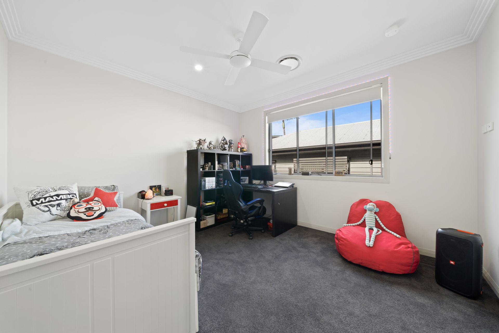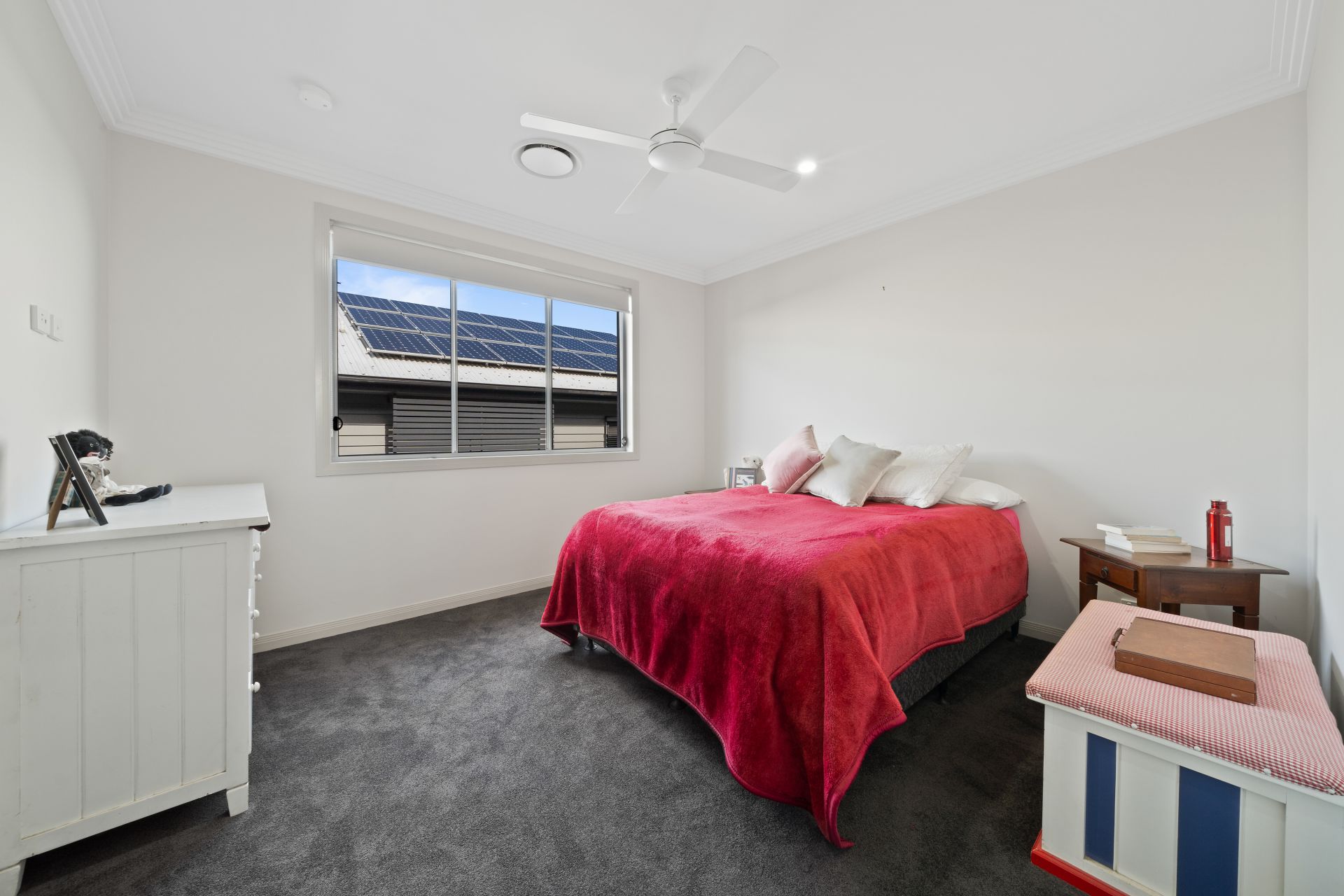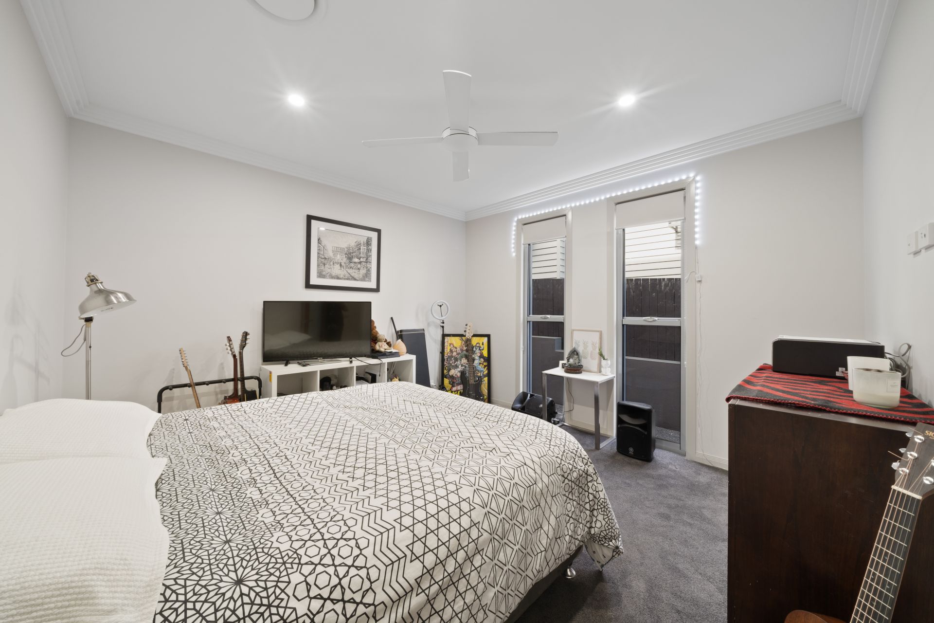 > Bedroom 5 located on the entry level enjoys extra-high ceilings, ornate cornicing, Dakin ducted air-conditioning, carpet flooring, down-lighting, ceiling fans and sash windows with roller blinds.