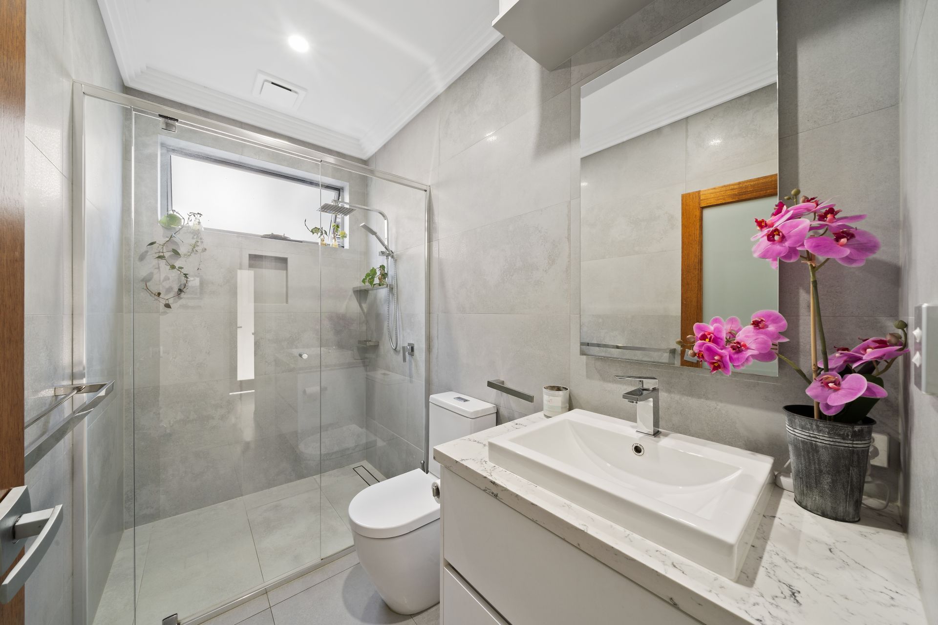 > The second bathroom located on the entry level features shower with dual shower heads (detachable + monsoon), wall niche, single basin marble topped floating vanity with plenty of storage, dual backlit vanity mirror, extractor, down-lighting, towel rack, hand towel rack, extra-high ceilings, ornate cornicing, horizontal casement window and toilet.