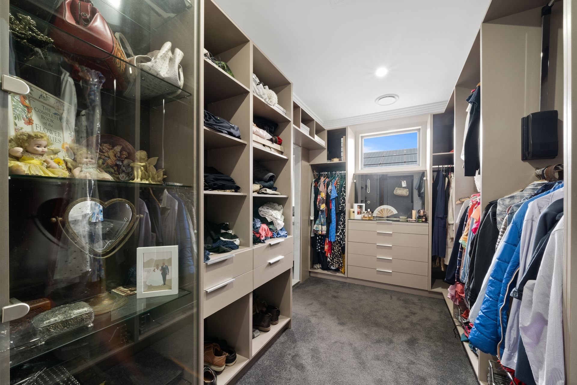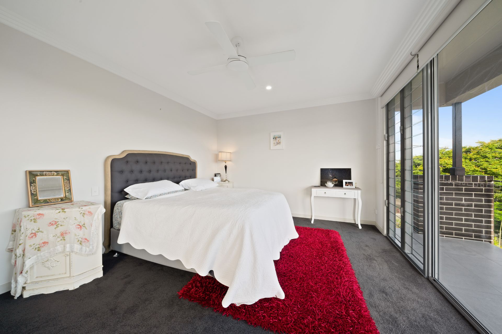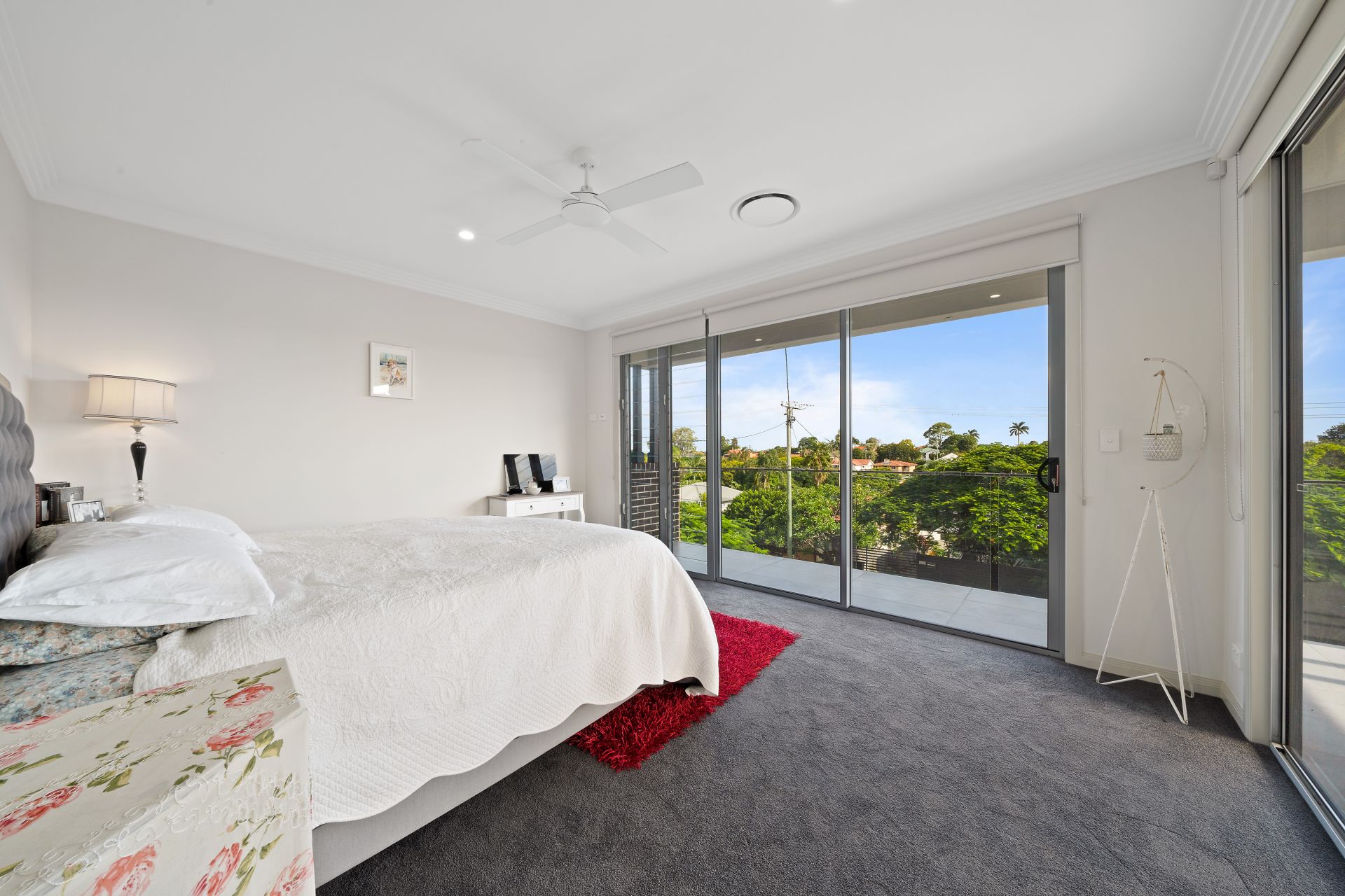 > The palatial master is perfect for those who enjoy their own space, boasting extra-high ceilings, ornate cornicing, Dakin ducted air-conditioning, carpet flooring, gargantuan walk-through robe, sliding doors, access to the front balcony, down-lighting, ceiling fan, roller blinds and a well-appointed ensuite.