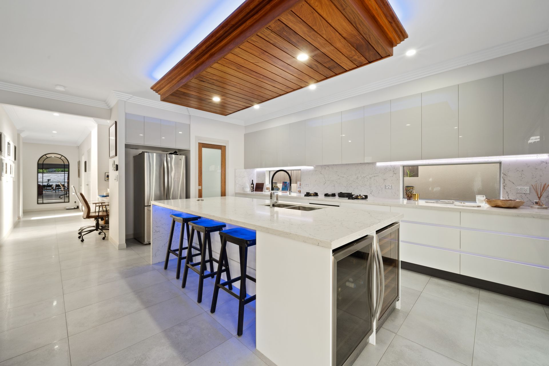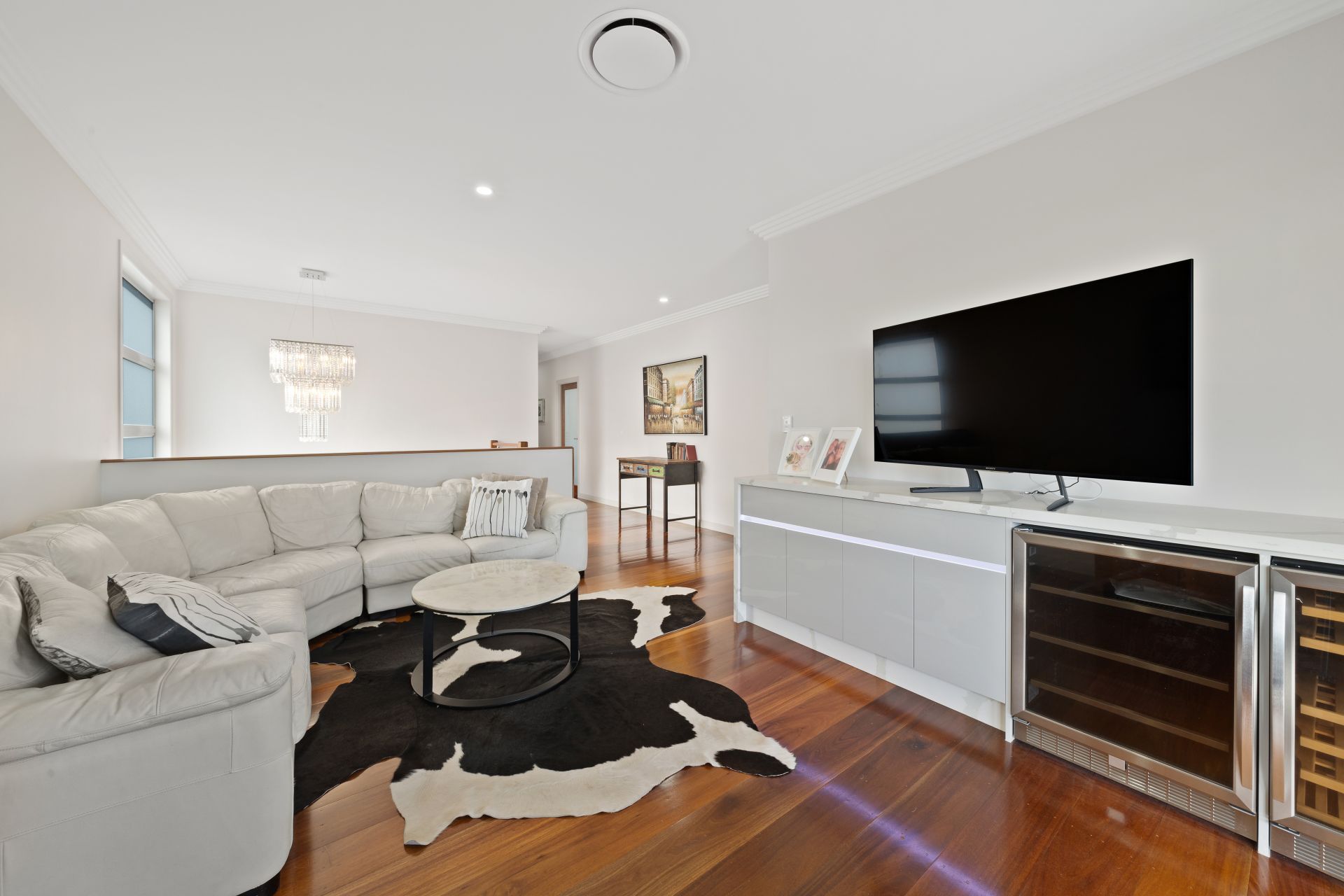 > Located on the top level is the second living room featuring Dakin ducted air-conditioning, down-lighting + chandelier, rich timber flooring, custom marble topped cabinetry with dual Hafele wine fridges (white + red), extra-high ceilings, ornate corning, large glass sliding doors allowing access to the front balcony.
