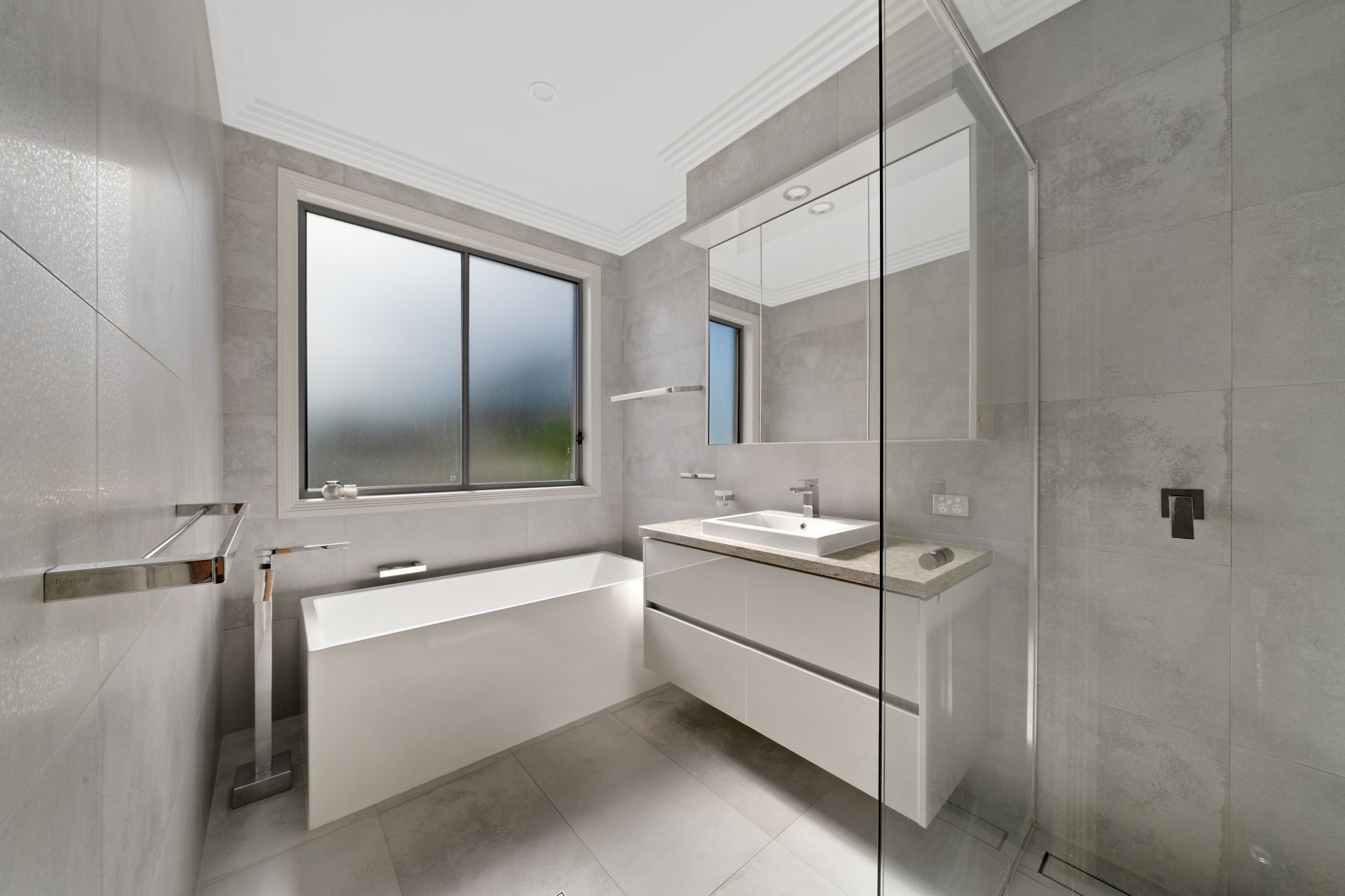 > The main bathroom located on the top level features an over-sized shower with dual shower heads (detachable + monsoon), wall niche, separate bath configuration, single basin marble topped floating vanity with plenty of storage, mirror faced medicine cabinet, extractor, down-lighting, towel rack, hand towel racks extra-high ceilings, ornate cornicing, sliding window and separate powder room.