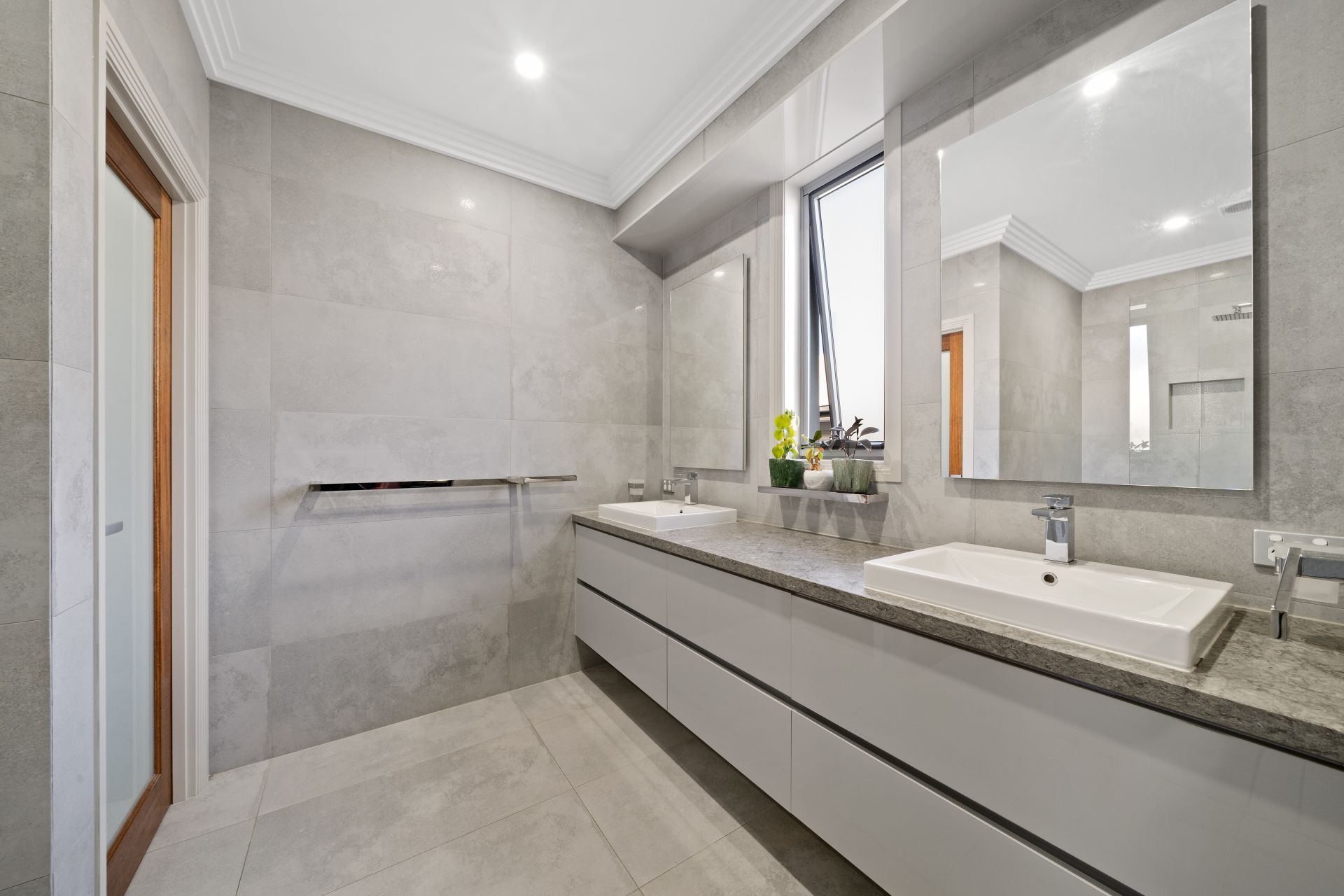 > The master ensuite located on the top level features large frameless shower with dual shower heads (detachable + monsoon), wall niche, shower seat, dual basin marble topped floating vanity with plenty of storage, dual backlit vanity mirrors, extractor, down-lighting, towel rack, hand towel racks extra-high ceilings, ornate cornicing, horizontal casement window and separate toilet.