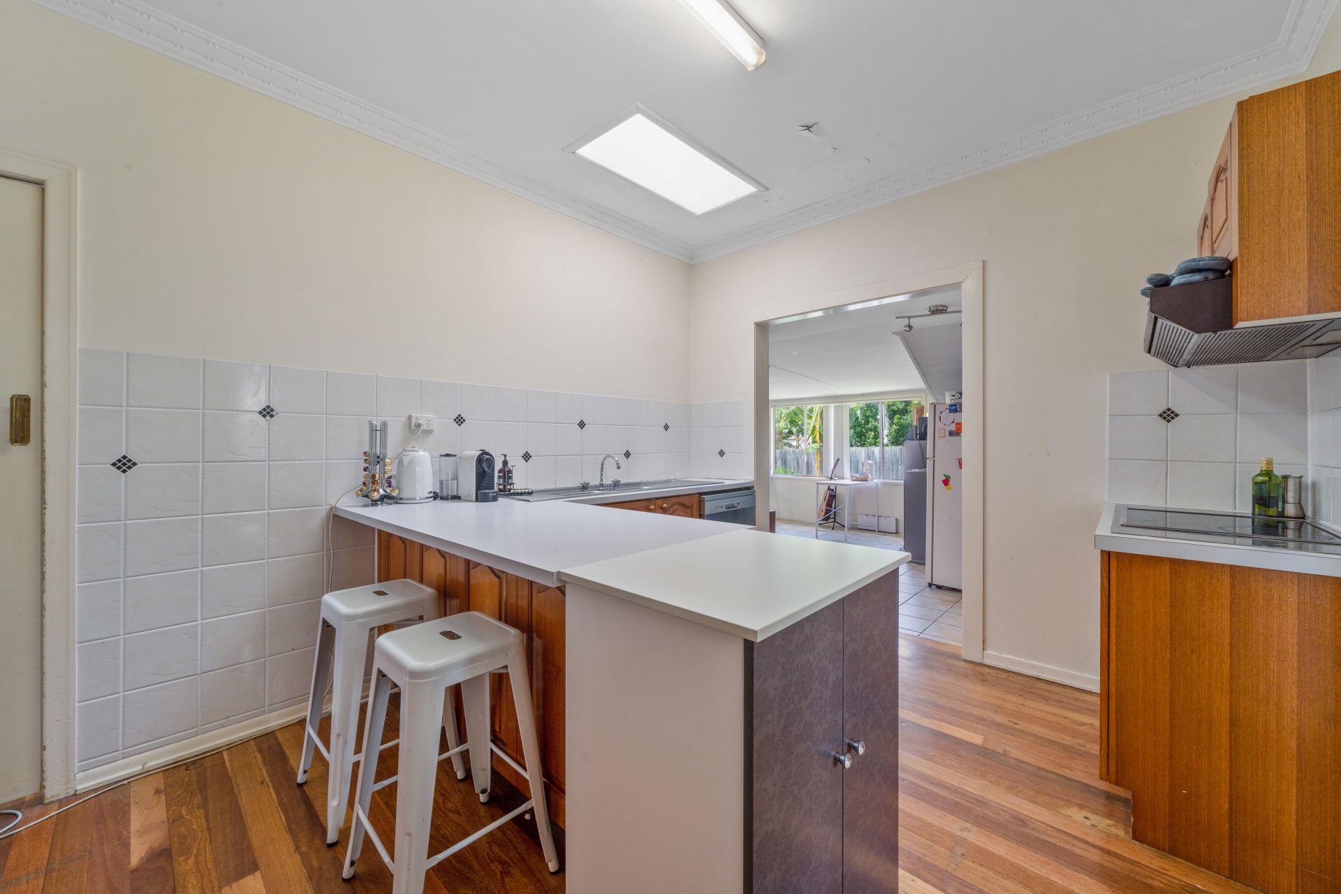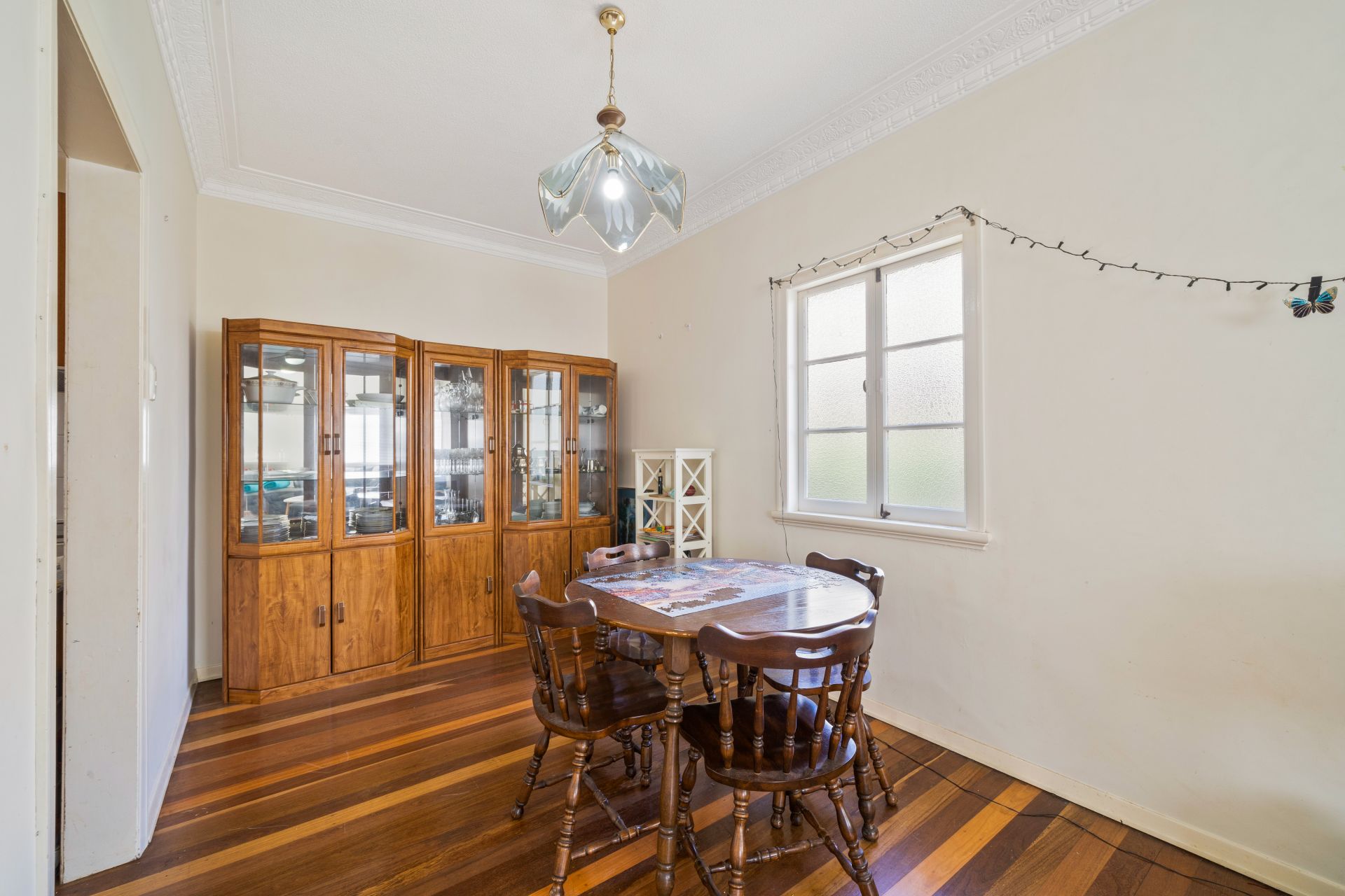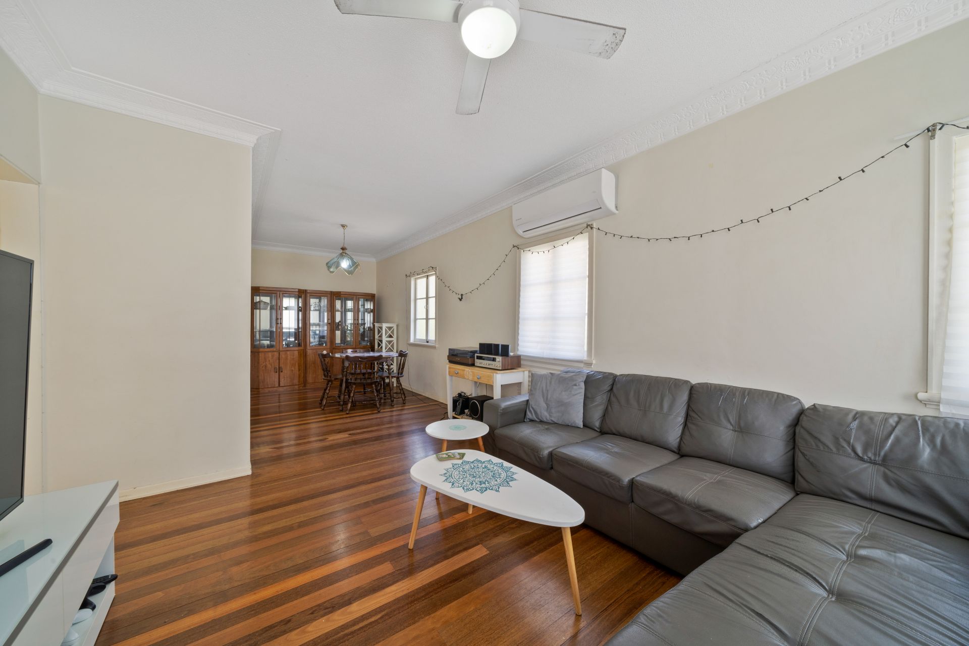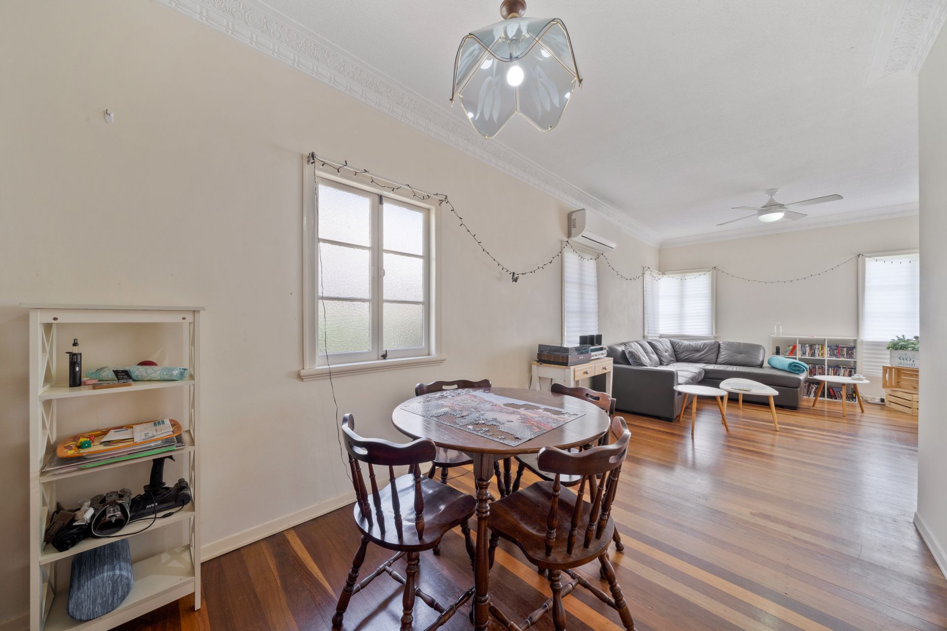 > The lounge/dining areas flow effortlessly to the kitchen and out to the outdoor entertaining area. Featuring extra-high ceilings, ornate cornicing, rich wood flooring, split-system air-conditioning, ceiling fan, casement windows and oyster lighting throughout.
