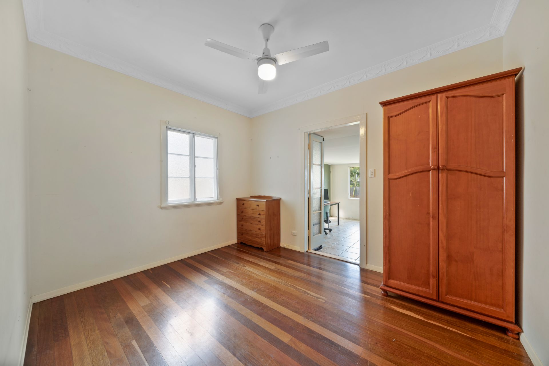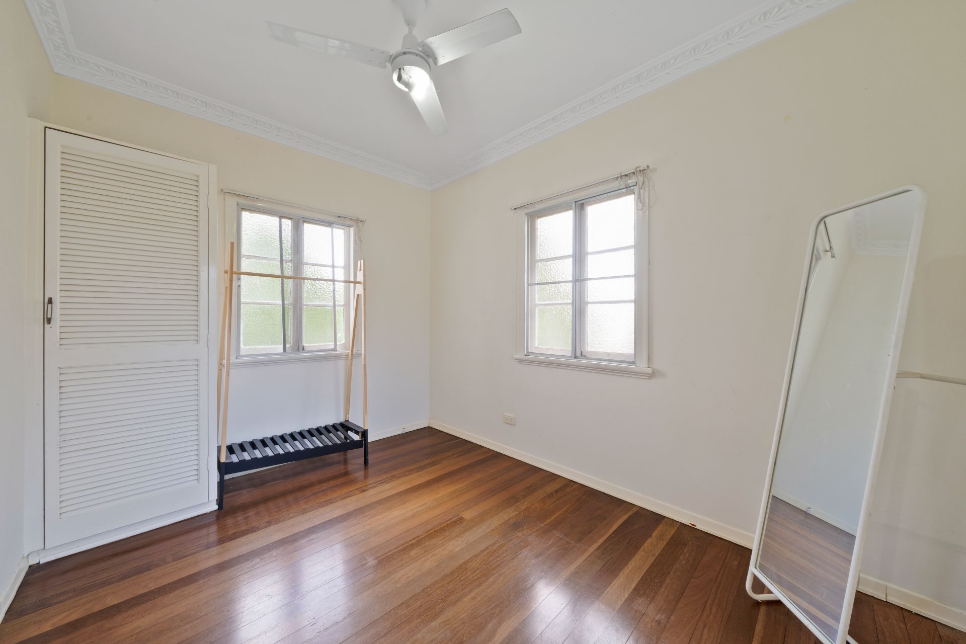 > Bedroom 3 features rich wood flooring, extra-high ceilings, ornate cornicing, ceiling fan with inbuilt lighting and casement windows with fly screens.