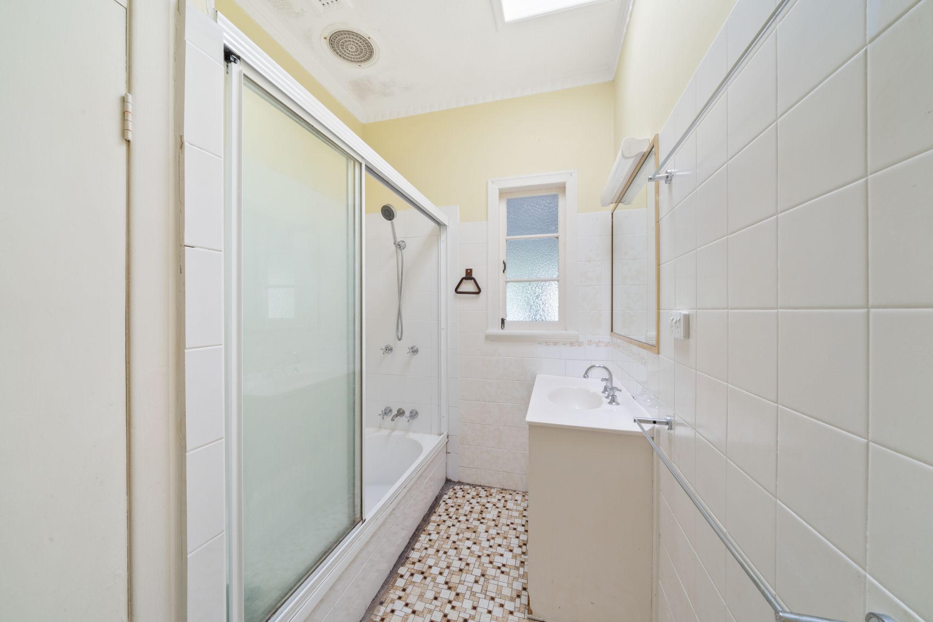 > The main bathroom features a shower over bath configuration, single basin vanity with plenty of storage, vanity mirror, towel rack, skylight, linen cupboard, casement window light, exhaust and separate toilet.