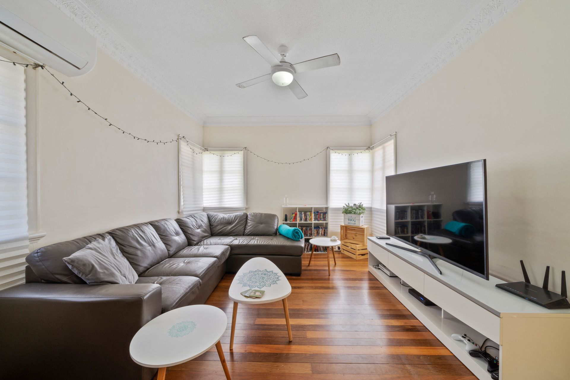 > The master is perfect for those who enjoy their own space, with rich wood flooring, extra-high ceilings, ornate cornicing, ceiling fan with inbuilt lighting and casement windows with fly screens.