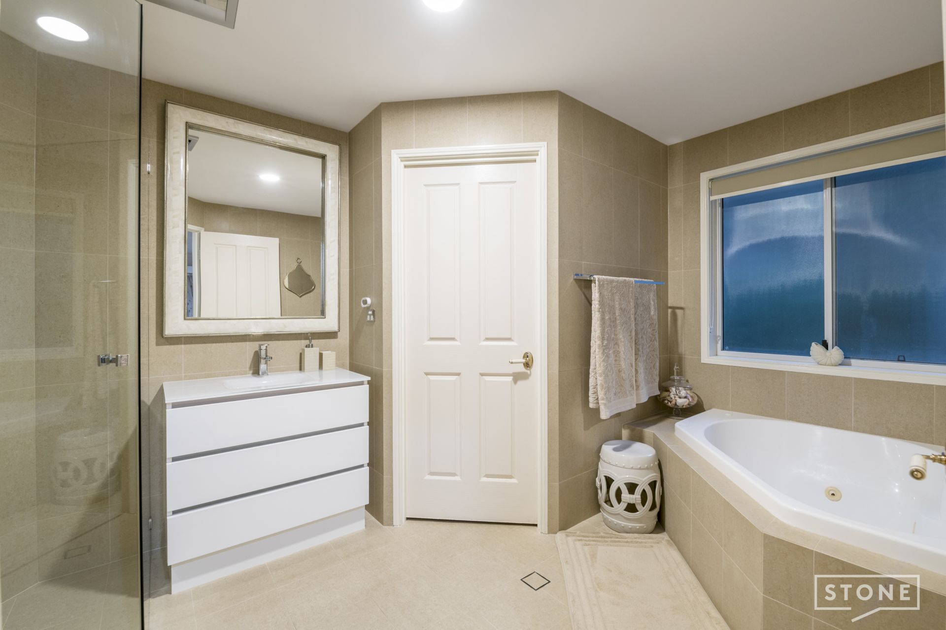 > The spacious renovated ensuite features a shower with rainfall & detachable showerheads, a deep soaker spa, single vanity with a large mirror above and storage under, floor to ceiling tiles, roll-down blinds and a separate toilet.