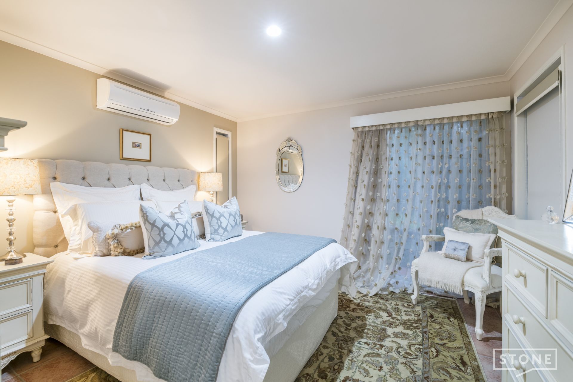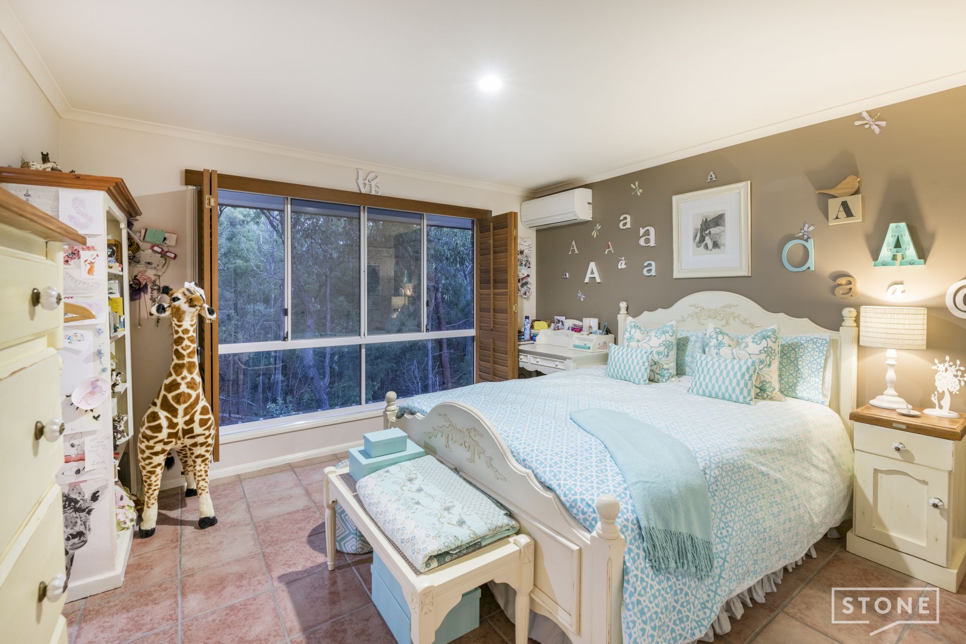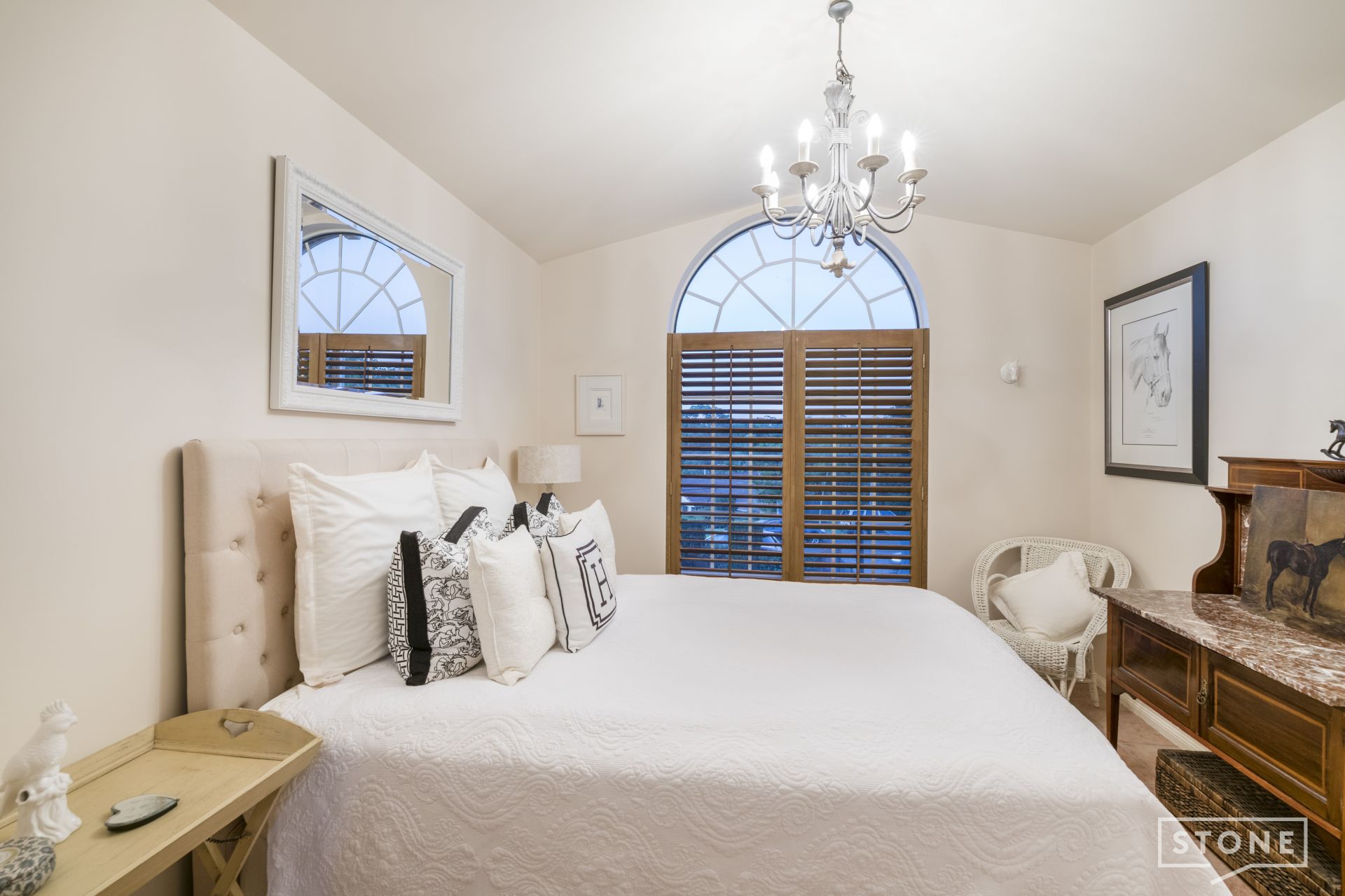 > Bedroom four, also located upstairs features a stunning floor-to-ceiling arched window overlooking the peaceful cul-de-sac, tiled flooring, x2 built-in-wardrobes and plantation shutters.