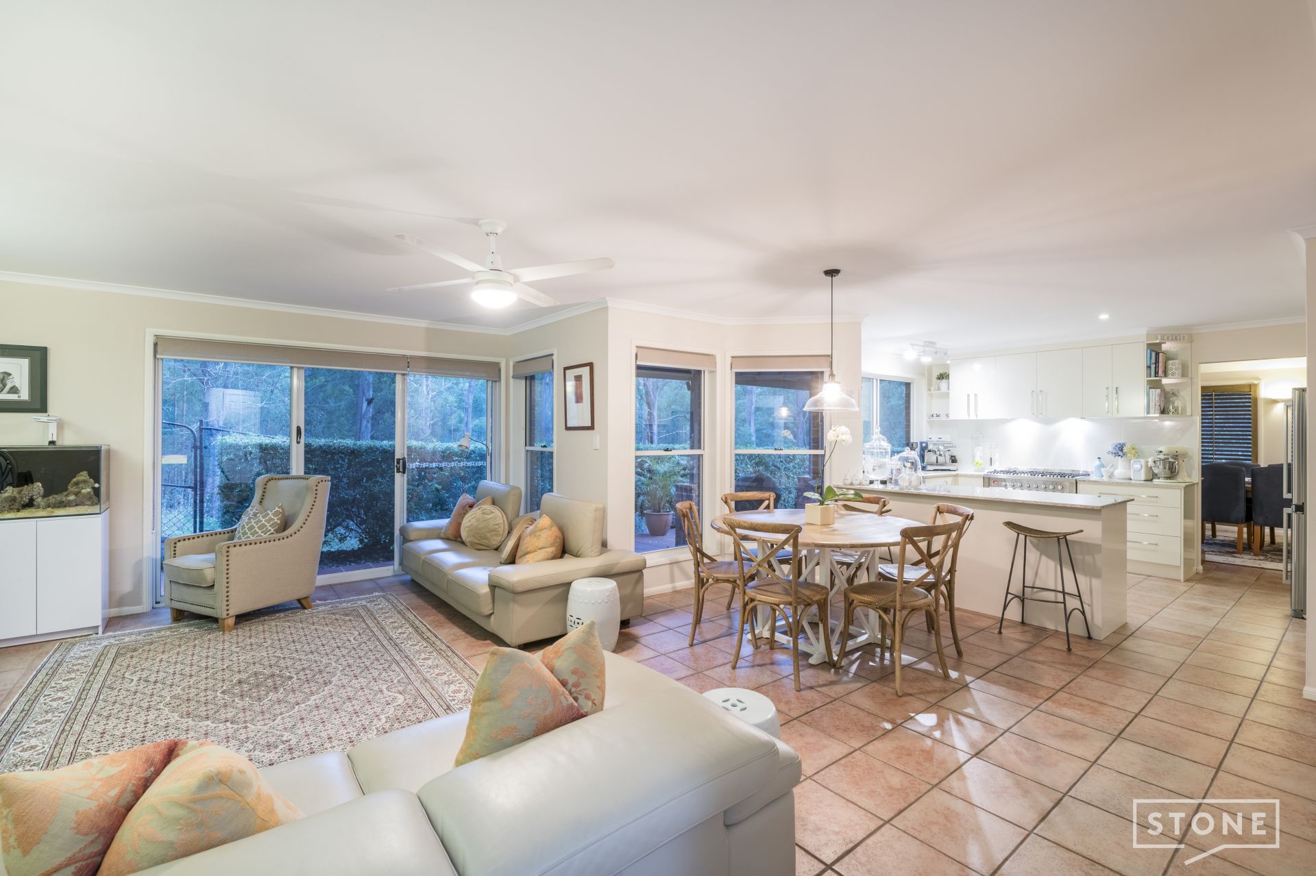 > Family/living room and meals area is conveniently located next to the kitchen and features tiled flooring, ceiling fan, roll-down blinds, and access to the back yard and reserve beyond through glass sliding door.