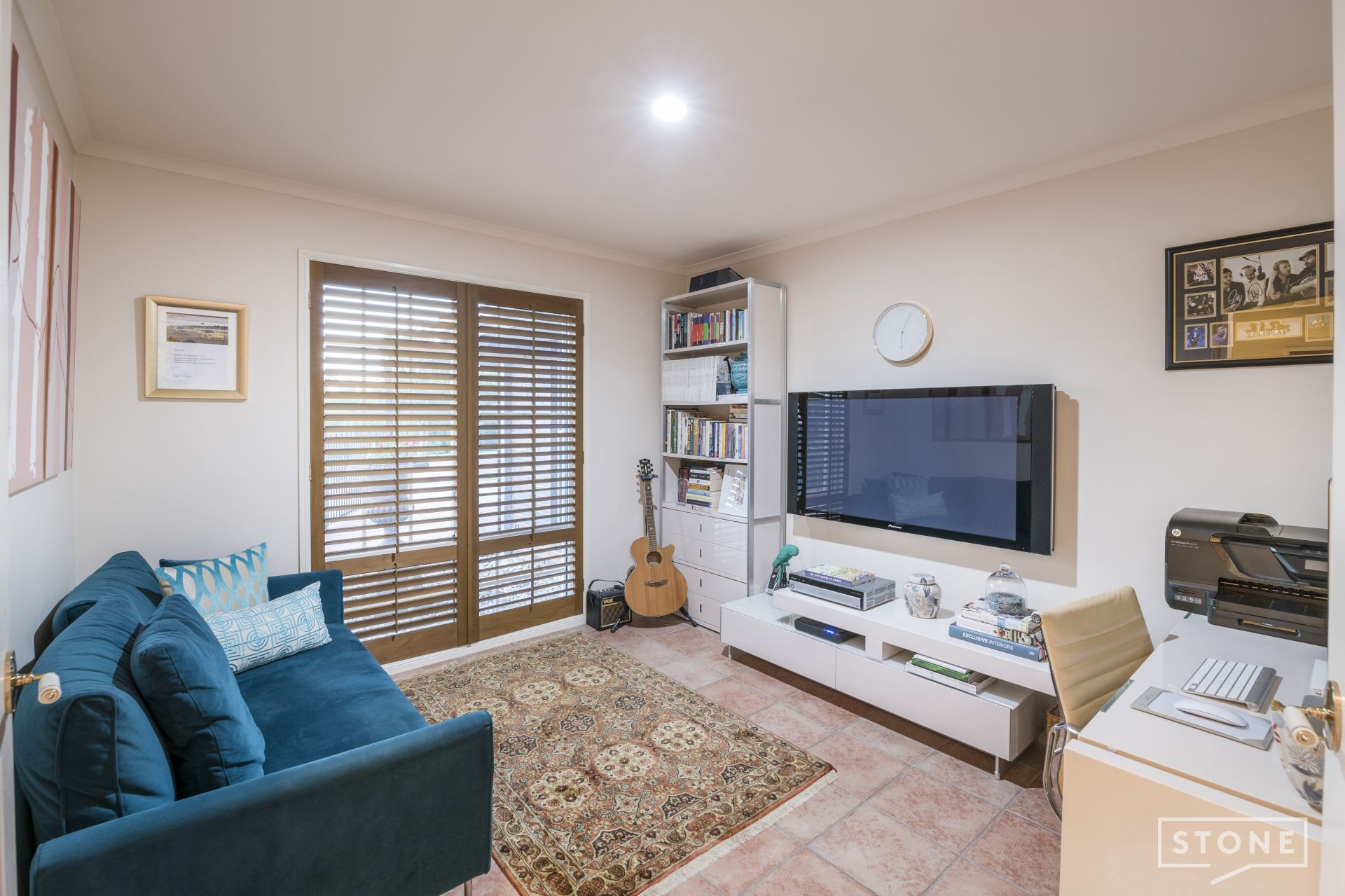 > Bedroom five is located downstairs and can double as a study or home office and features tiled flooring and plantation shutters.