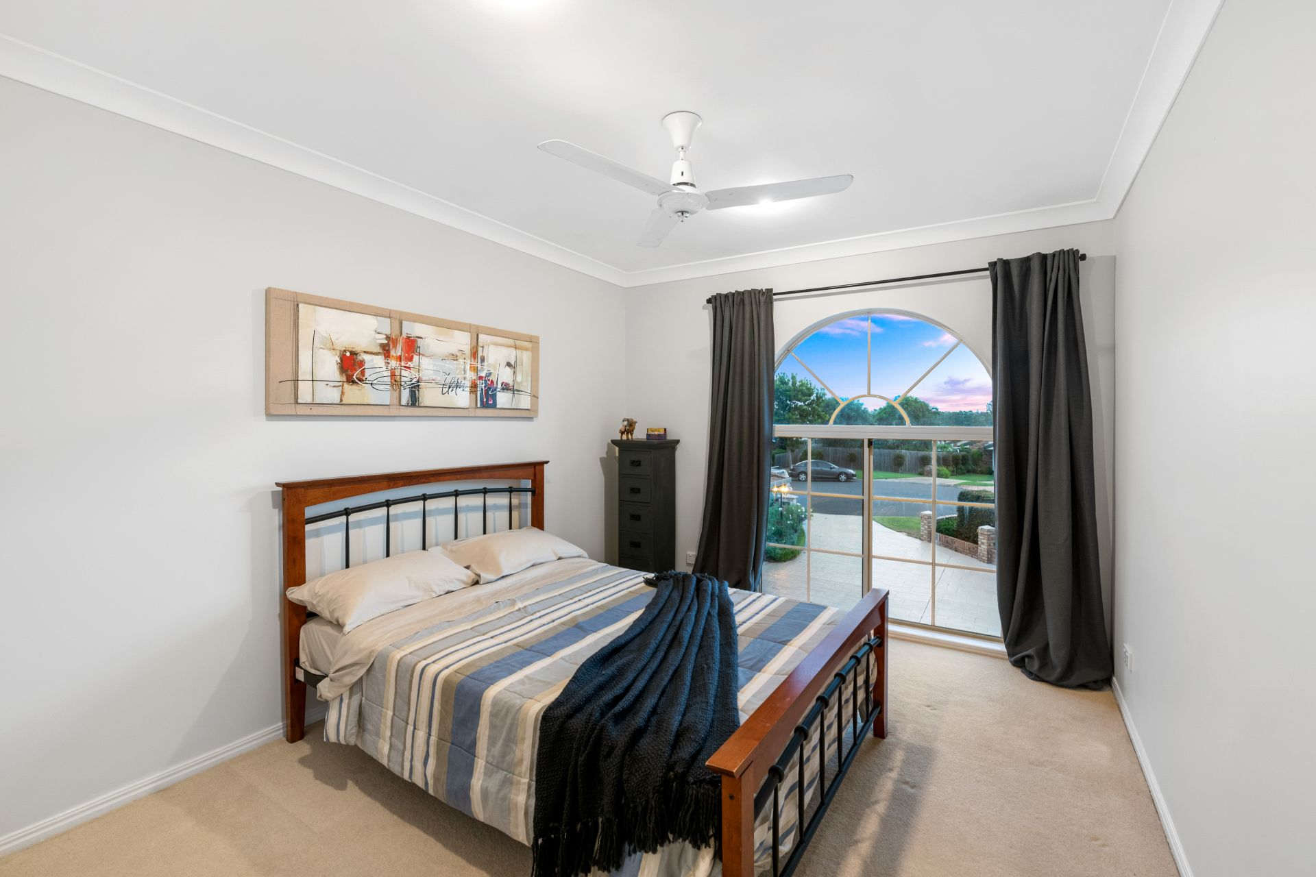 - Bedroom two is flooded with natural light through the stunning arched window and features carpeted flooring, walk-in-wardrobe and ceiling fan.