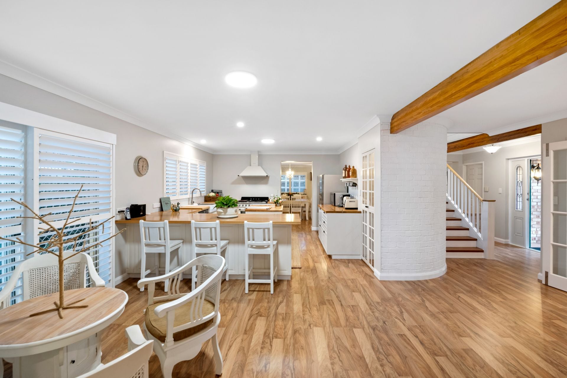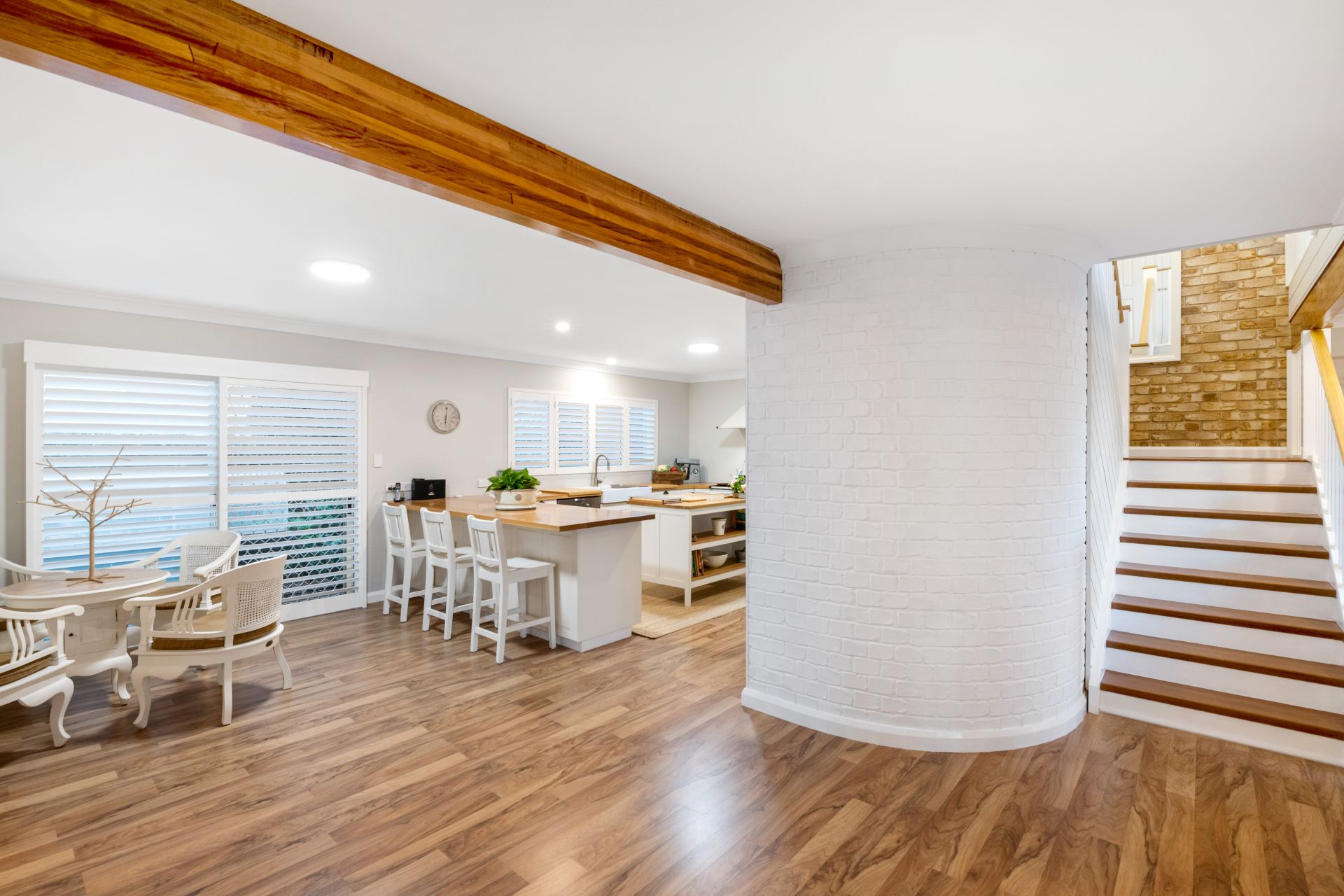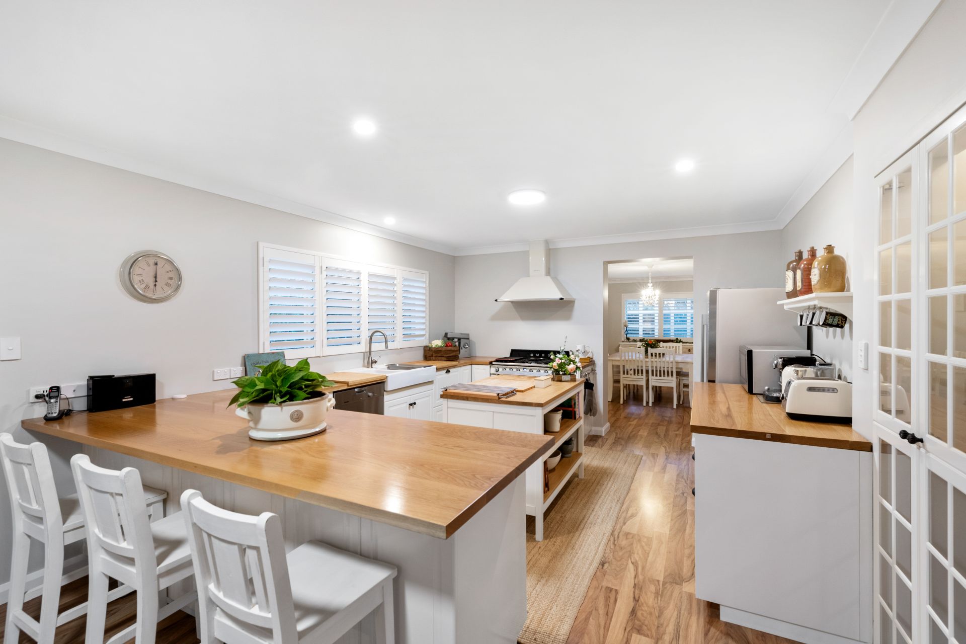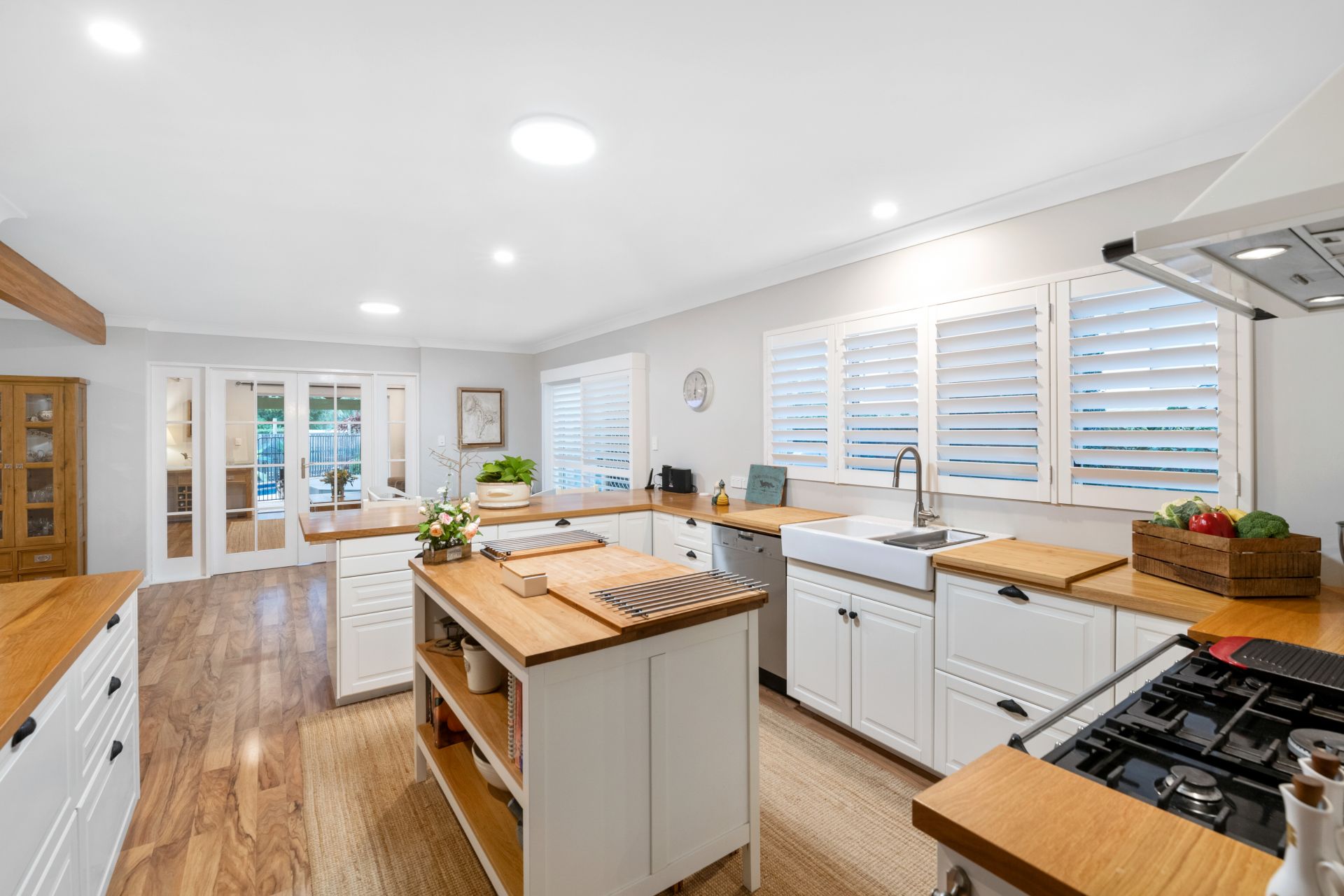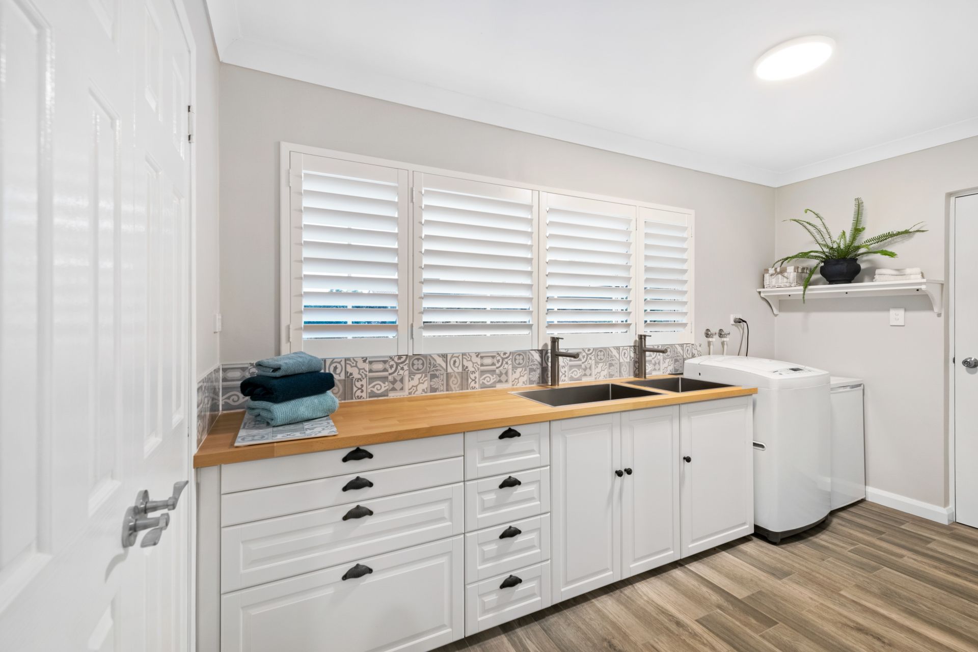 - The large, renovated laundry features handmade Italian wood-like tiled flooring, custom double wash tubs, timber benchtop, soft-close cabinetry, plantation shutters and access to the yard.