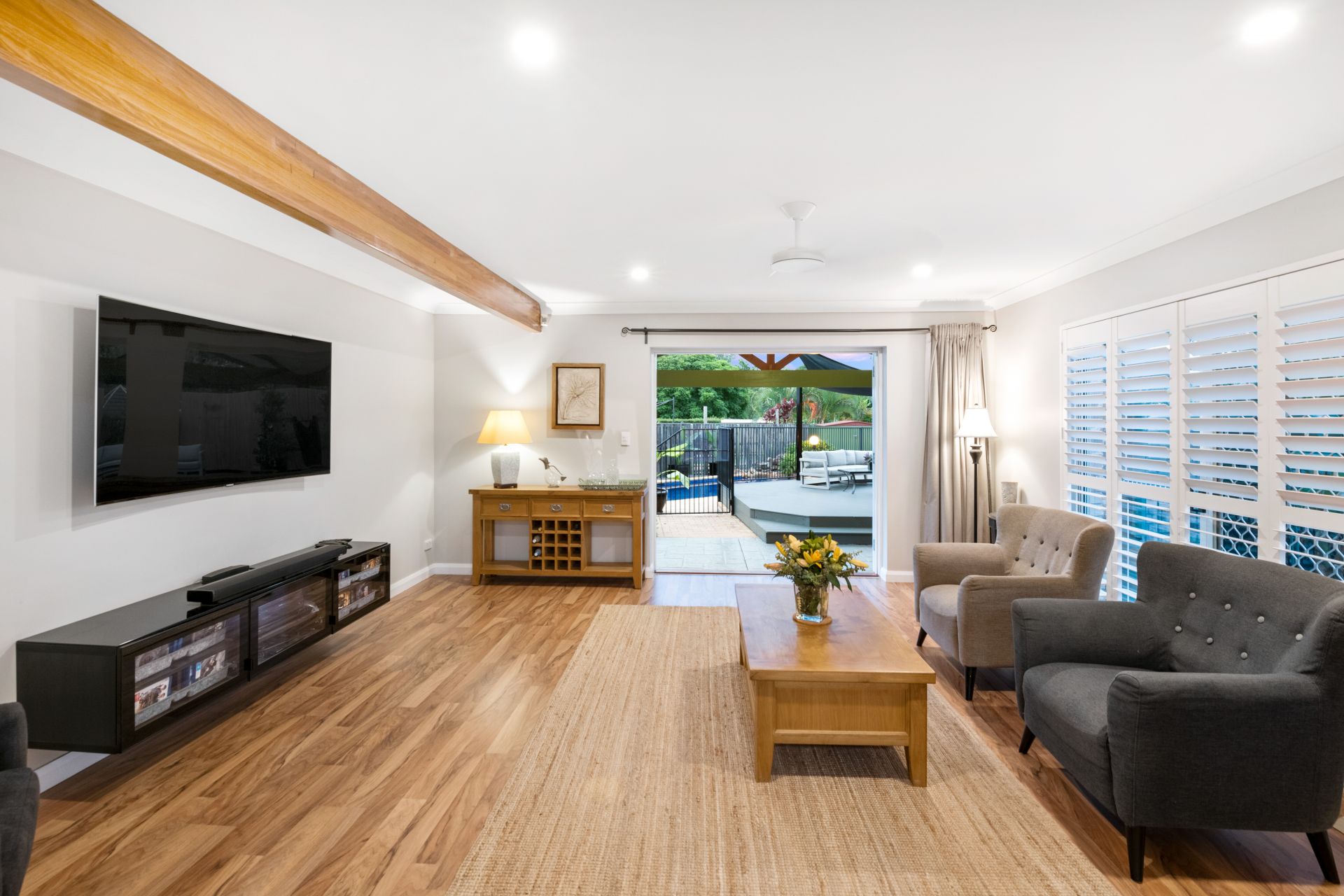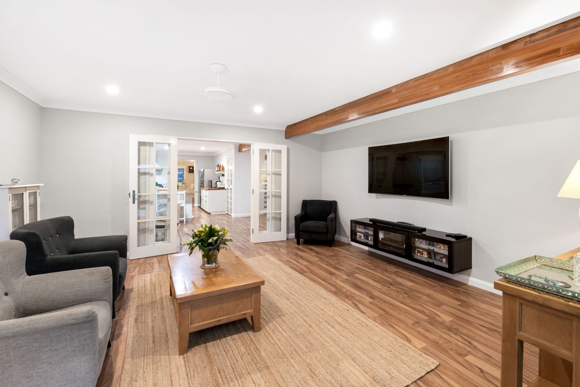 - Family room is well positioned beside the home's kitchen and meals area, and the amazing outdoor entertaining area. It features timber flooring, 2.5m high ceilings, ceiling fan, plantation shutters and French doors leading to both the kitchen and back yard.