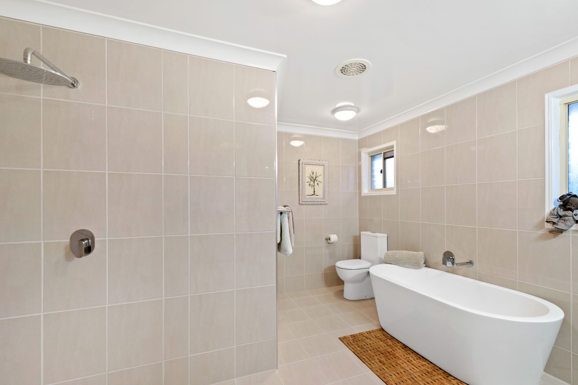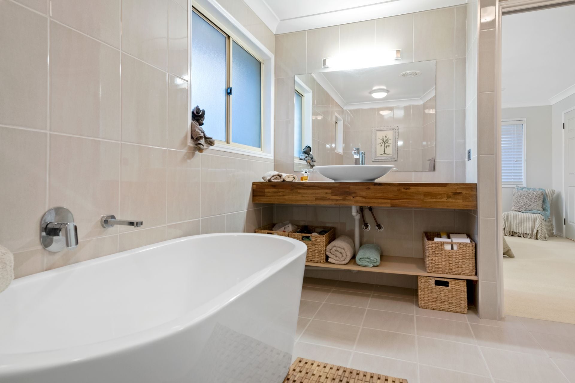 - Bathroom two is the spacious ensuite to the master bedroom. This stunningly renovated bathroom features tiled flooring, large wet-room style shower, deep-soaker free standing bath, custom vanity with timber benchtop, floor-to-ceiling tiles and toilet.
