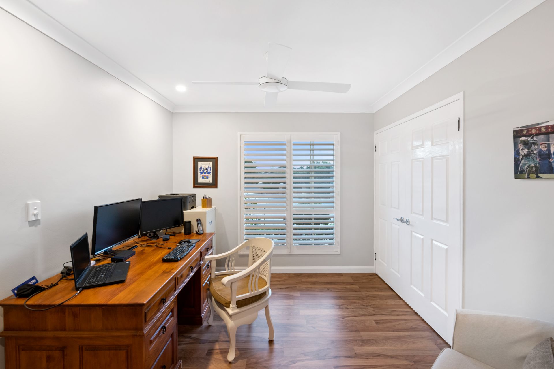 - Bedroom five is located on the ground floor and is currently utilised as a home office. Entering through beautiful glass French doors, this room features timber flooring, built-in-wardrobe, ceiling fan, hardwired internet and plantation shutters.