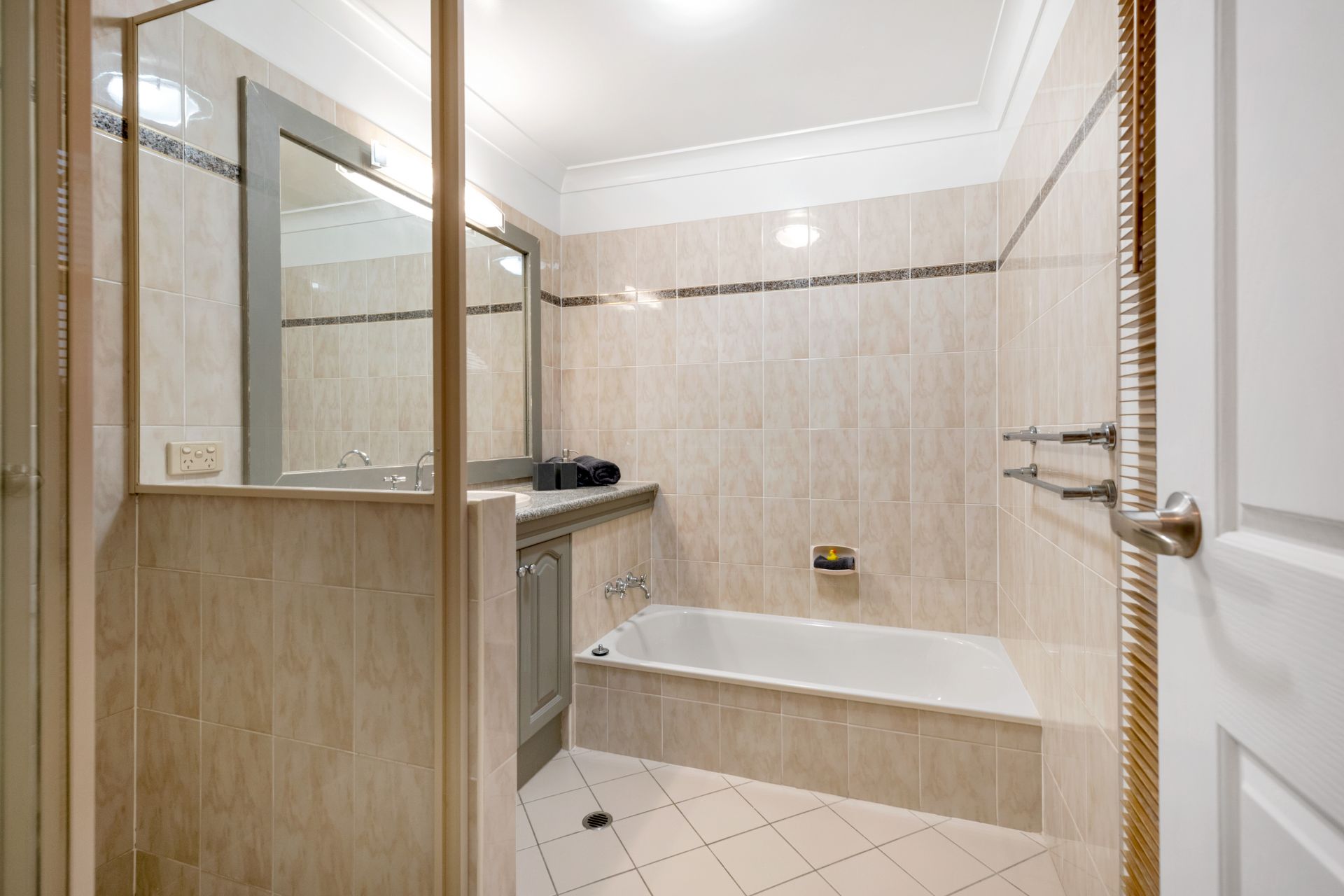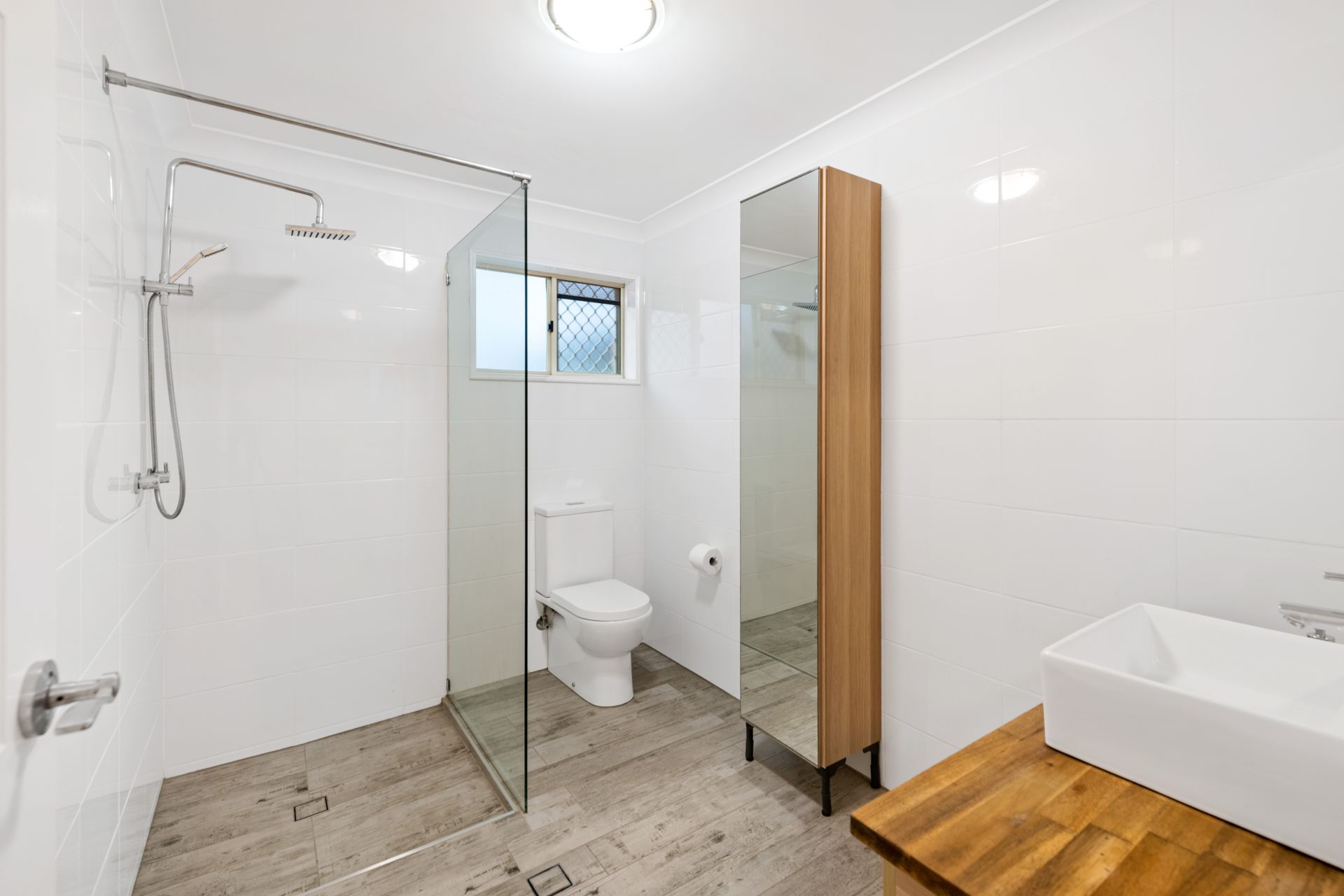 - Bathroom three is conveniently located downstairs. This tastefully presented bathroom features tiled flooring, walk-in shower, custom single vanity with timber benchtop and toilet.