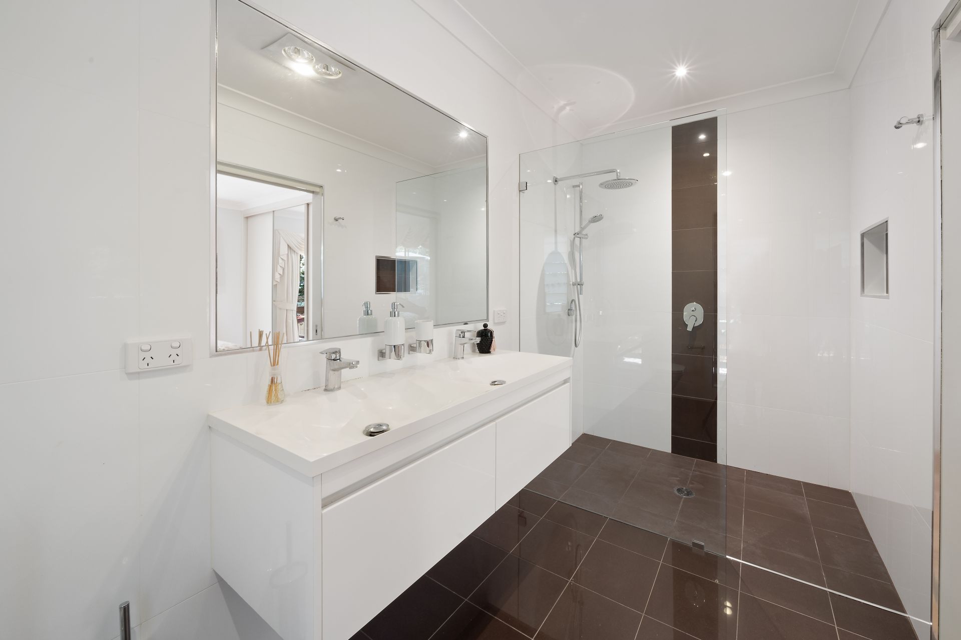 > The second ensuite located on the entry level features floor-to-ceiling tiles, walk-in shower with dual shower heads (detachable + rain drop) and wall cavity shelving, double vanity with soft closing draws, large framed mirror, heated ladder towel rack, hand towel rack, toilet and louvre windows with security mesh.